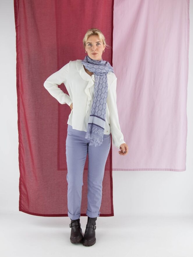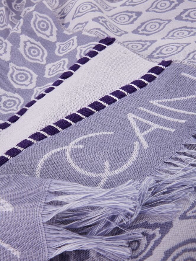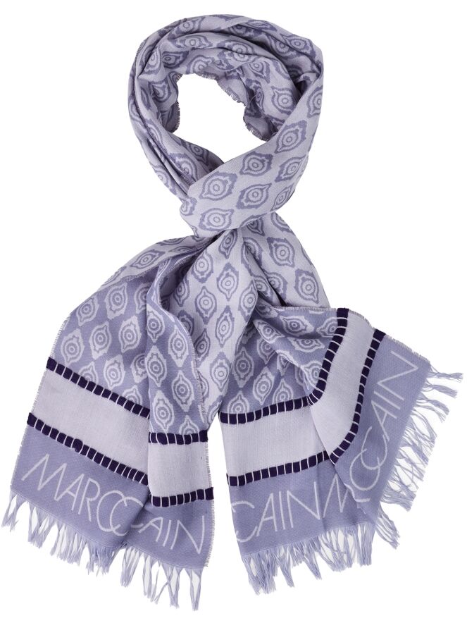 Ein Schal von Marc Cain mit einem grafischen Muster in Lila und Cremeweiß. Die Enden des Schals sind fein ausgefranst. Dieser Schal sollte von Hand gewaschen werden.