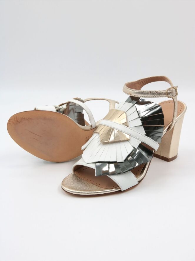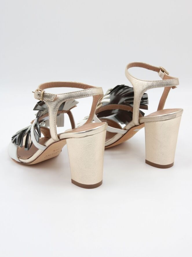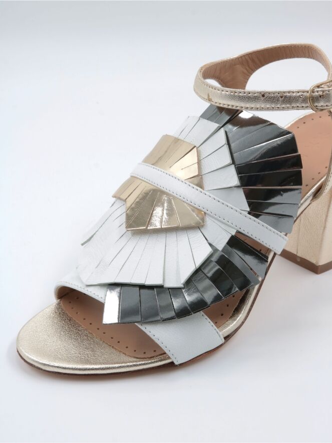Eine Sandale von Marc Ellis in der Farbe Canna di Fucile. Über dem Vorderfuß liegen drei Lagen ausgeschnittenes Leder in Cremeweiß, Platin und Bronze, darüber eine cremeweiße Paspel. Der Knöchelriemen ist verstellbar.