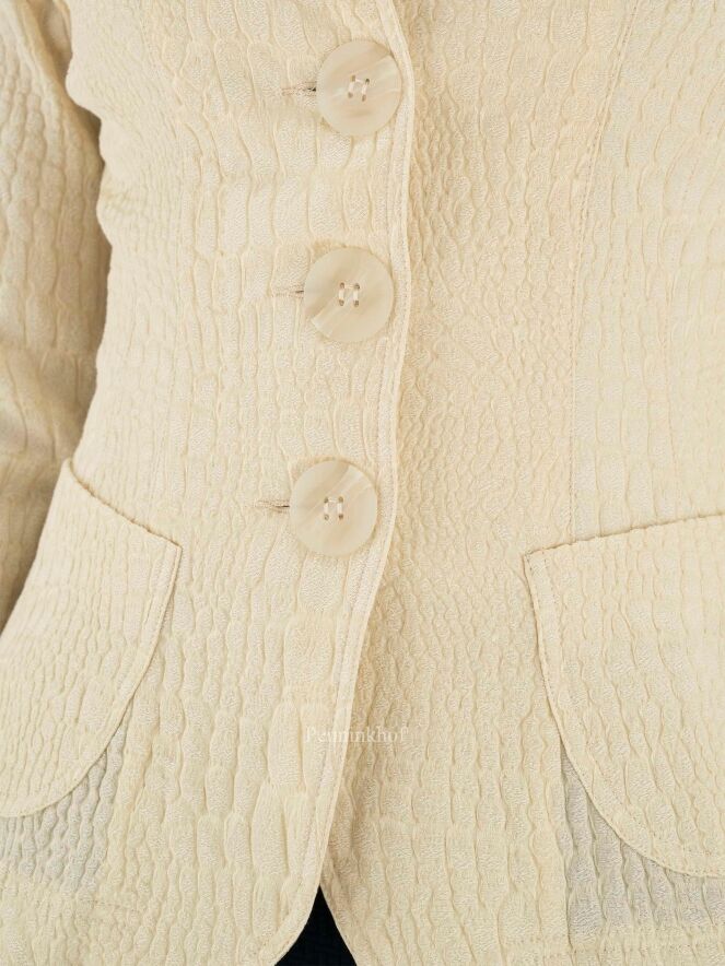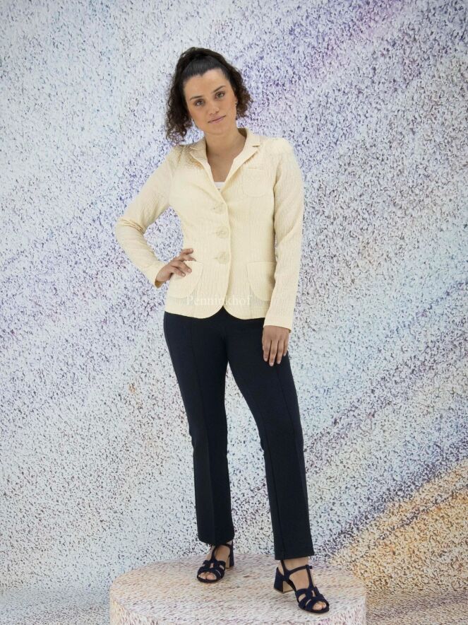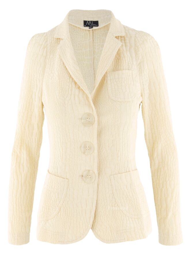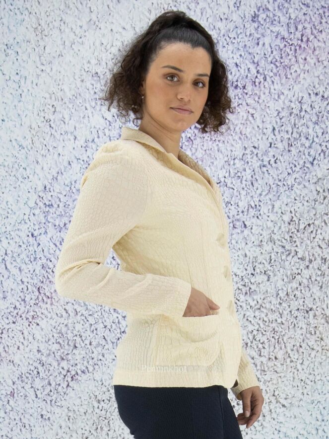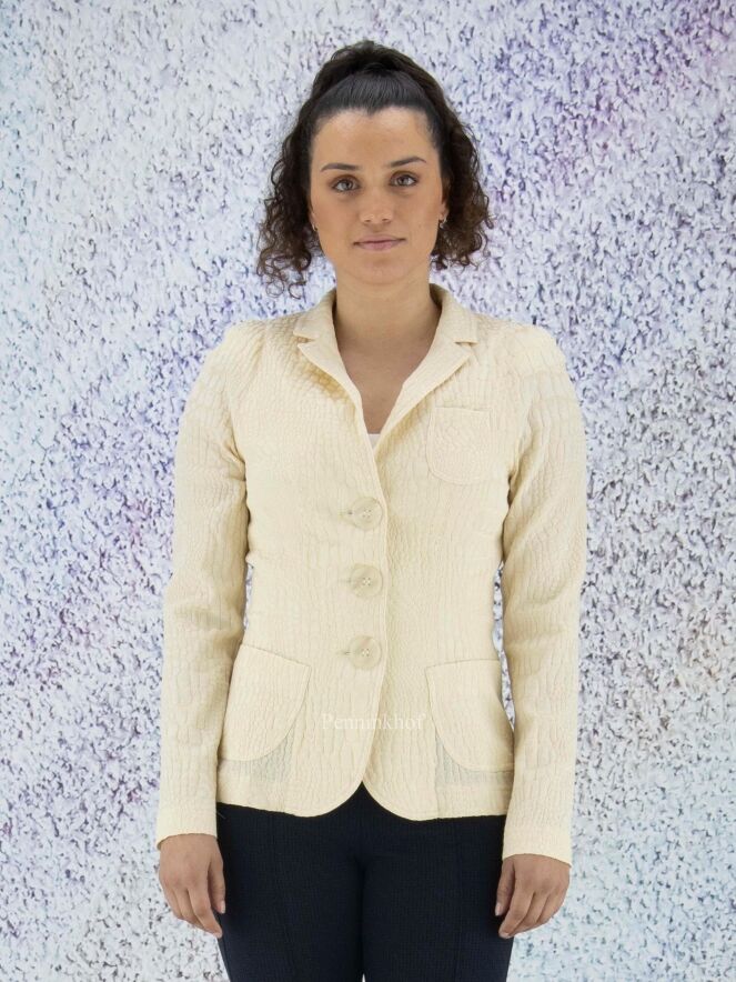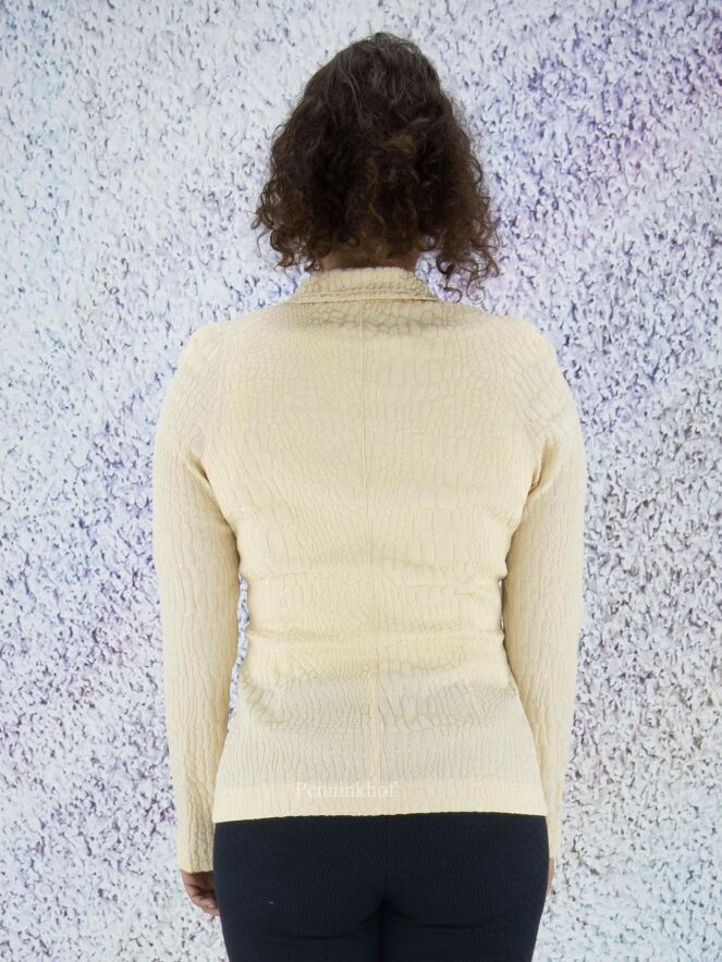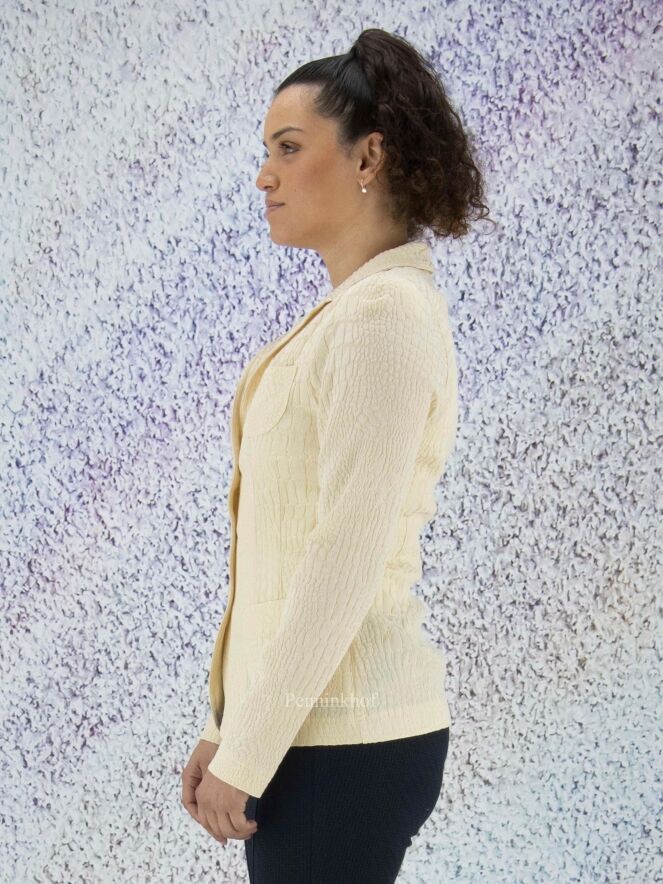 Ein Blazer der Designermarke ML Collections in einem zarten Gelb. Der Stoff hat eine Reptilienstruktur. Der Blazer wird mit drei Knöpfen geschlossen und ist nicht gefüttert. Dieser Blazer darf nicht gewaschen werden.