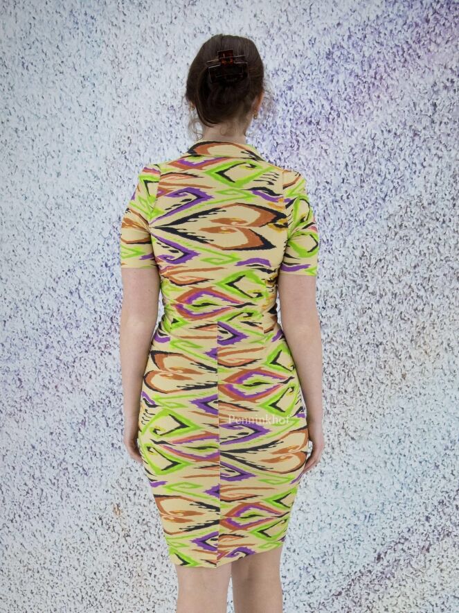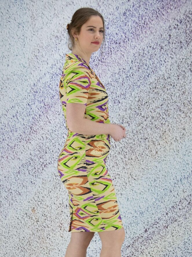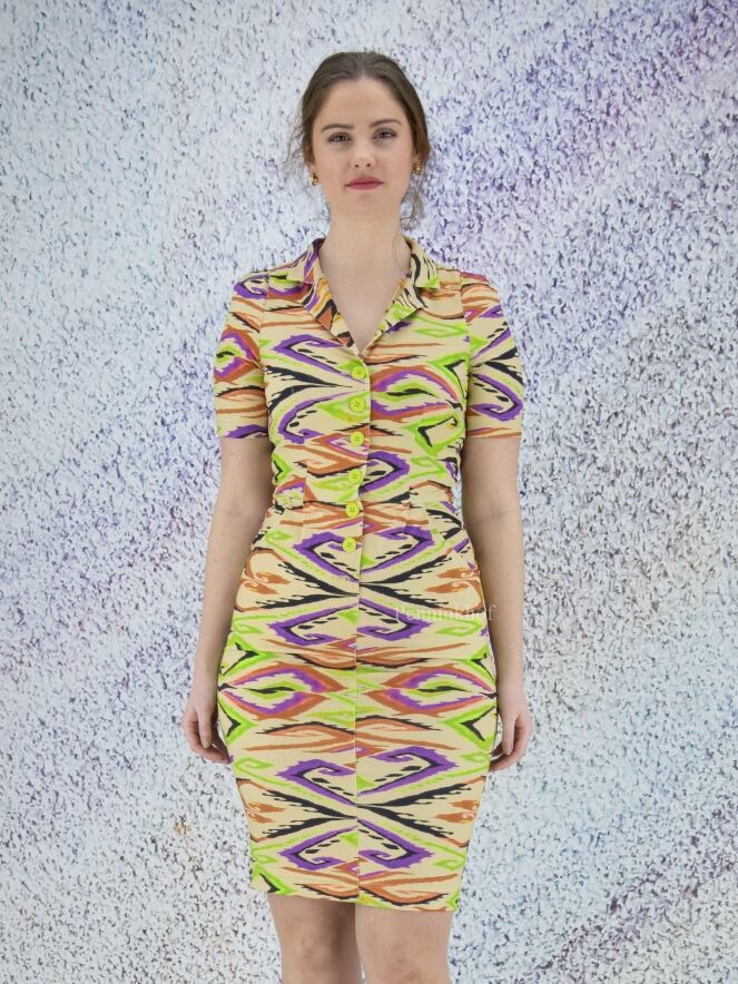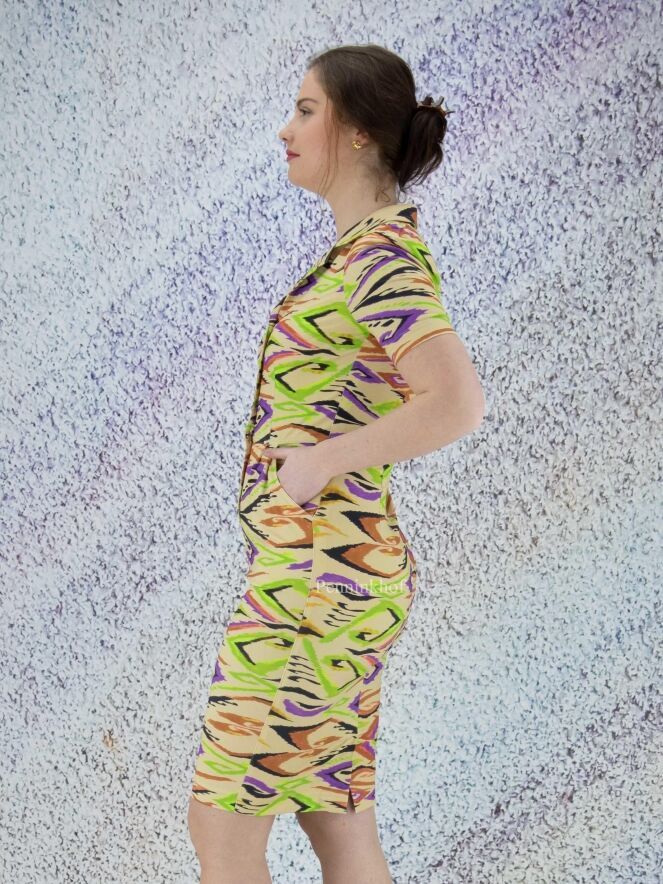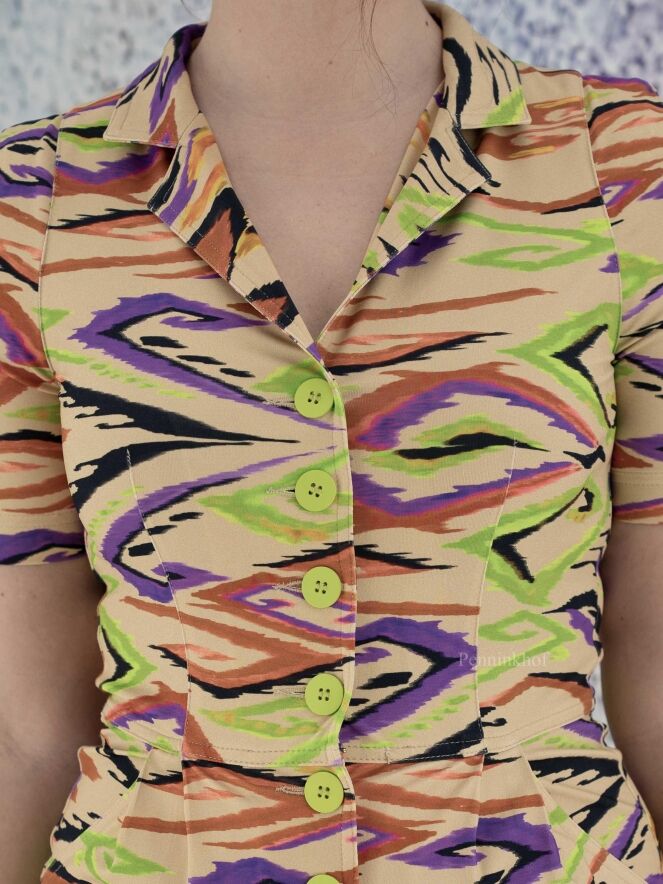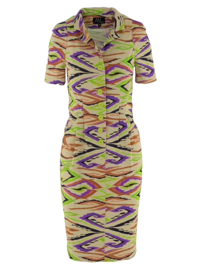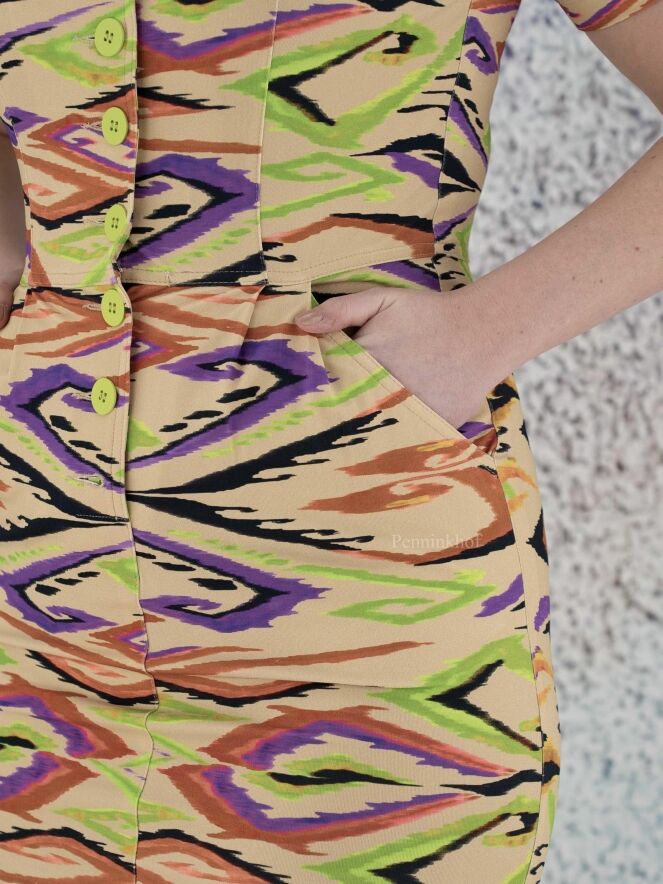 Ein Kleid der Designermarke ML Collections mit geflammtem Grafikdruck in verschiedenen Grüntönen, Schwarz, Lila und Rostrot auf beigem Hintergrund. An der Taille befinden sich Eingriffstaschen. Dieses Kleid hat kurze Ärmel und sollte nicht gewaschen werden.