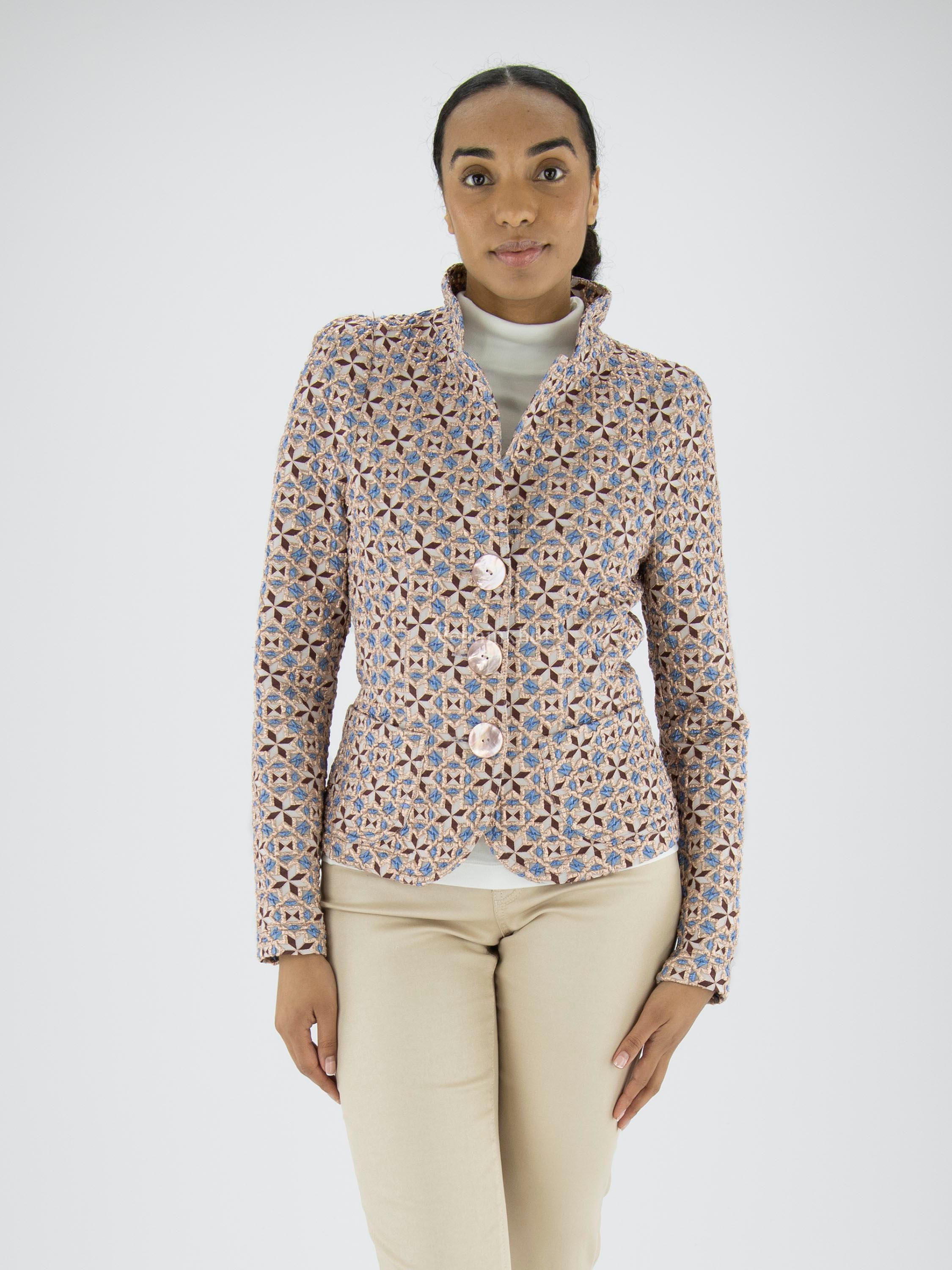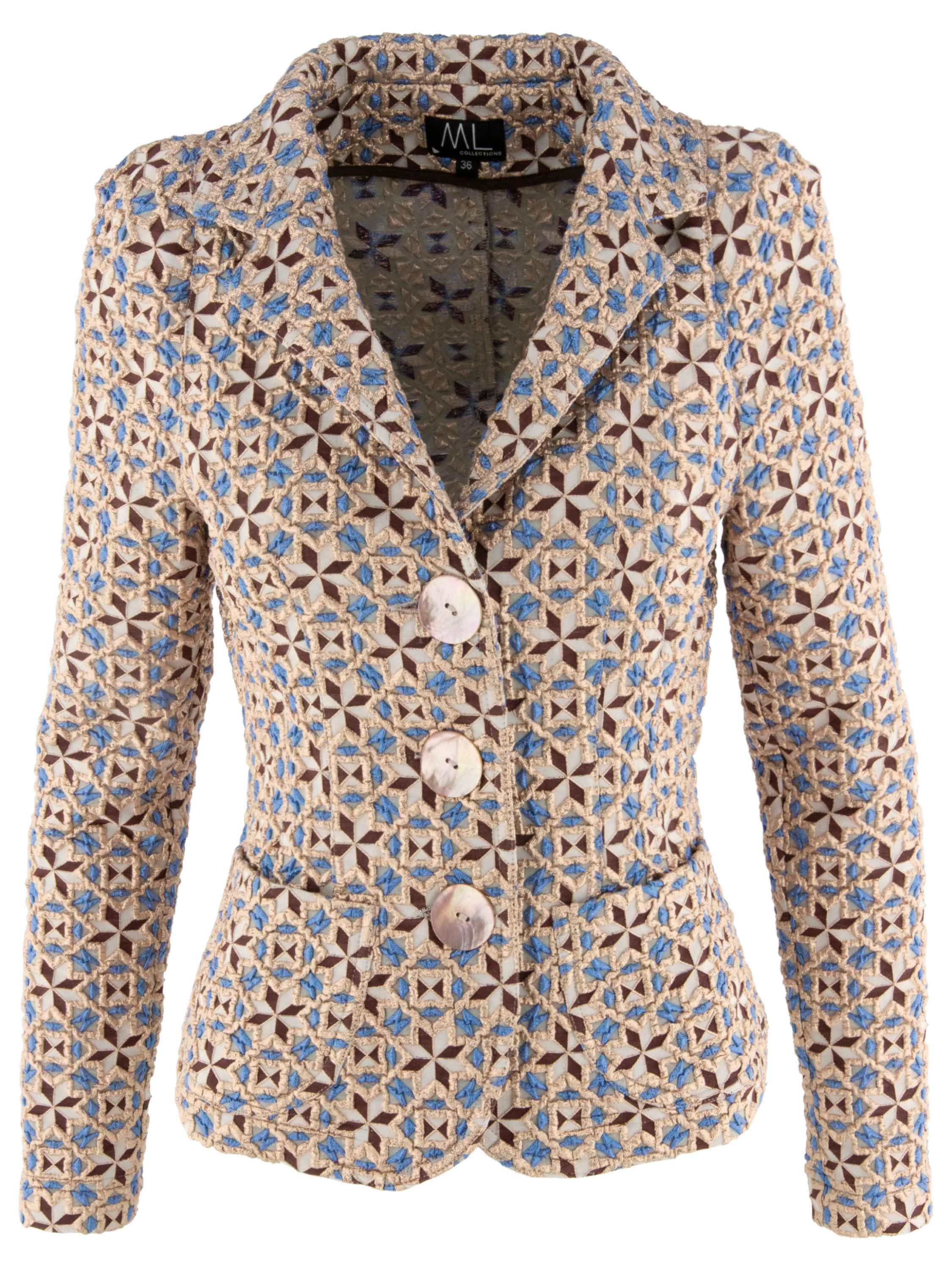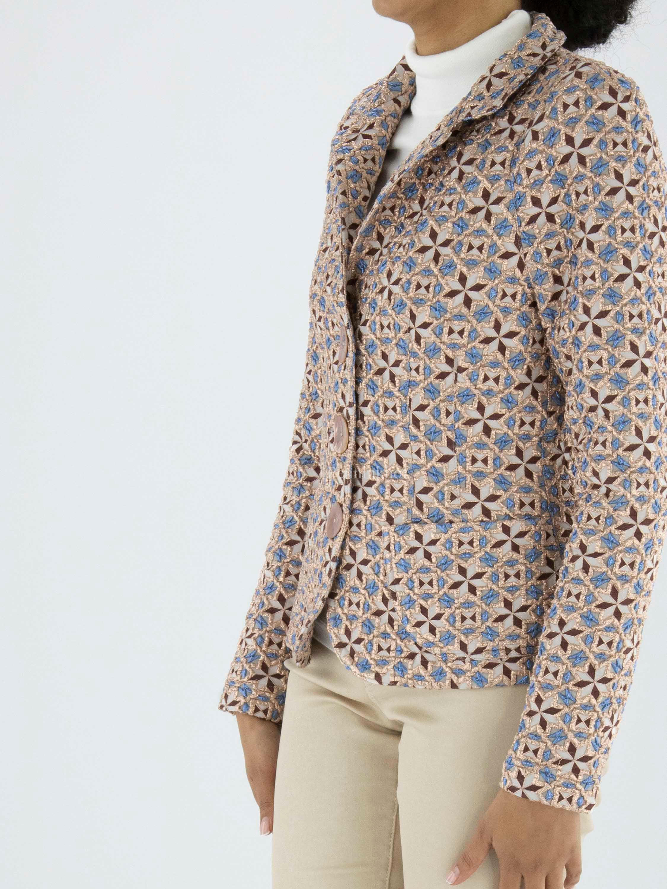 Ein Blazer von ML Collections mit geprägtem Mosaikdruck in den Farben Kupfer, Blau, Cremeweiß und Dunkelbraun. Der Blazer hat einen 3-Knopf-Verschluss und ist ungefüttert. Dieser Blazer sollte nicht gewaschen werden.