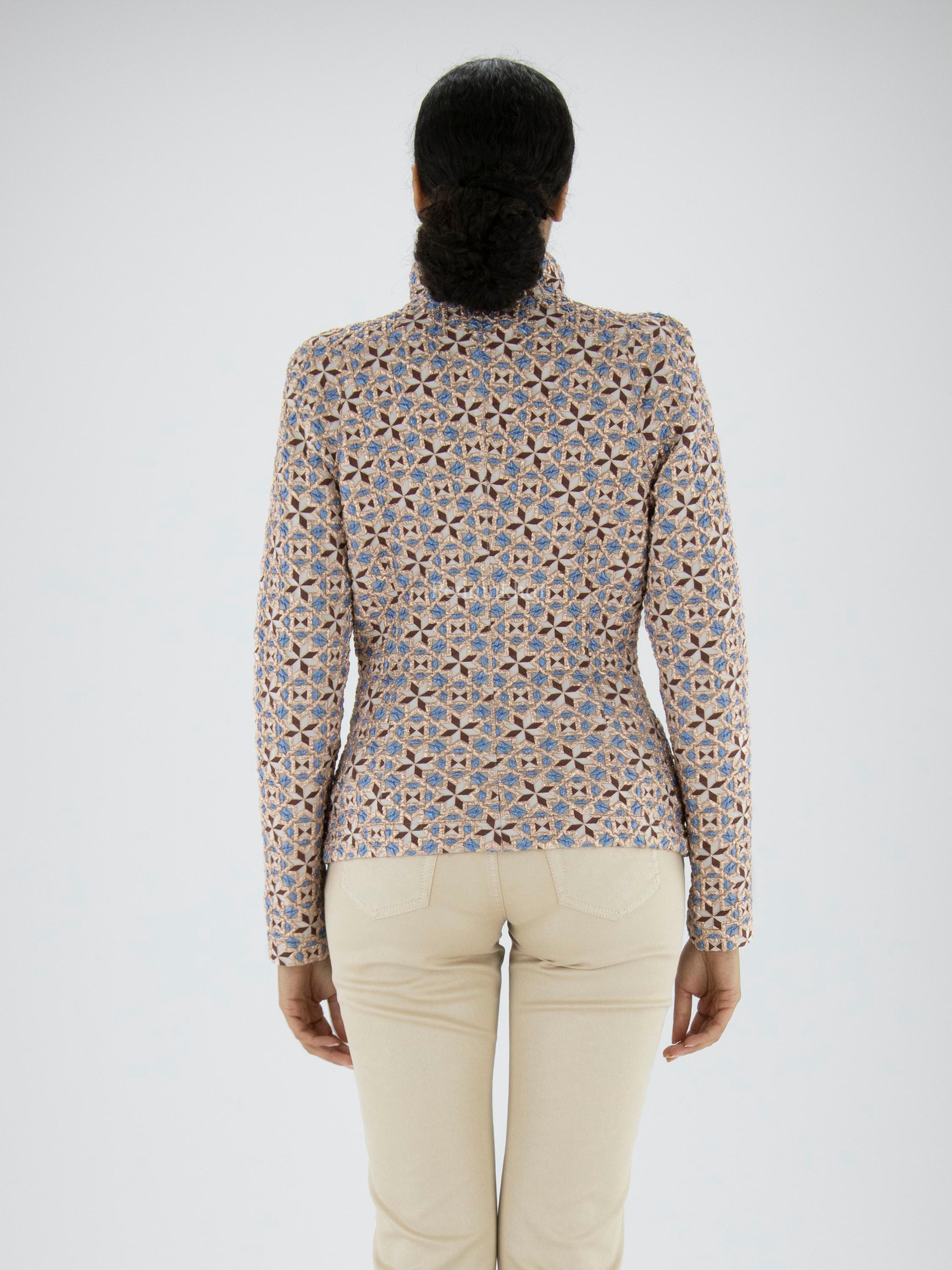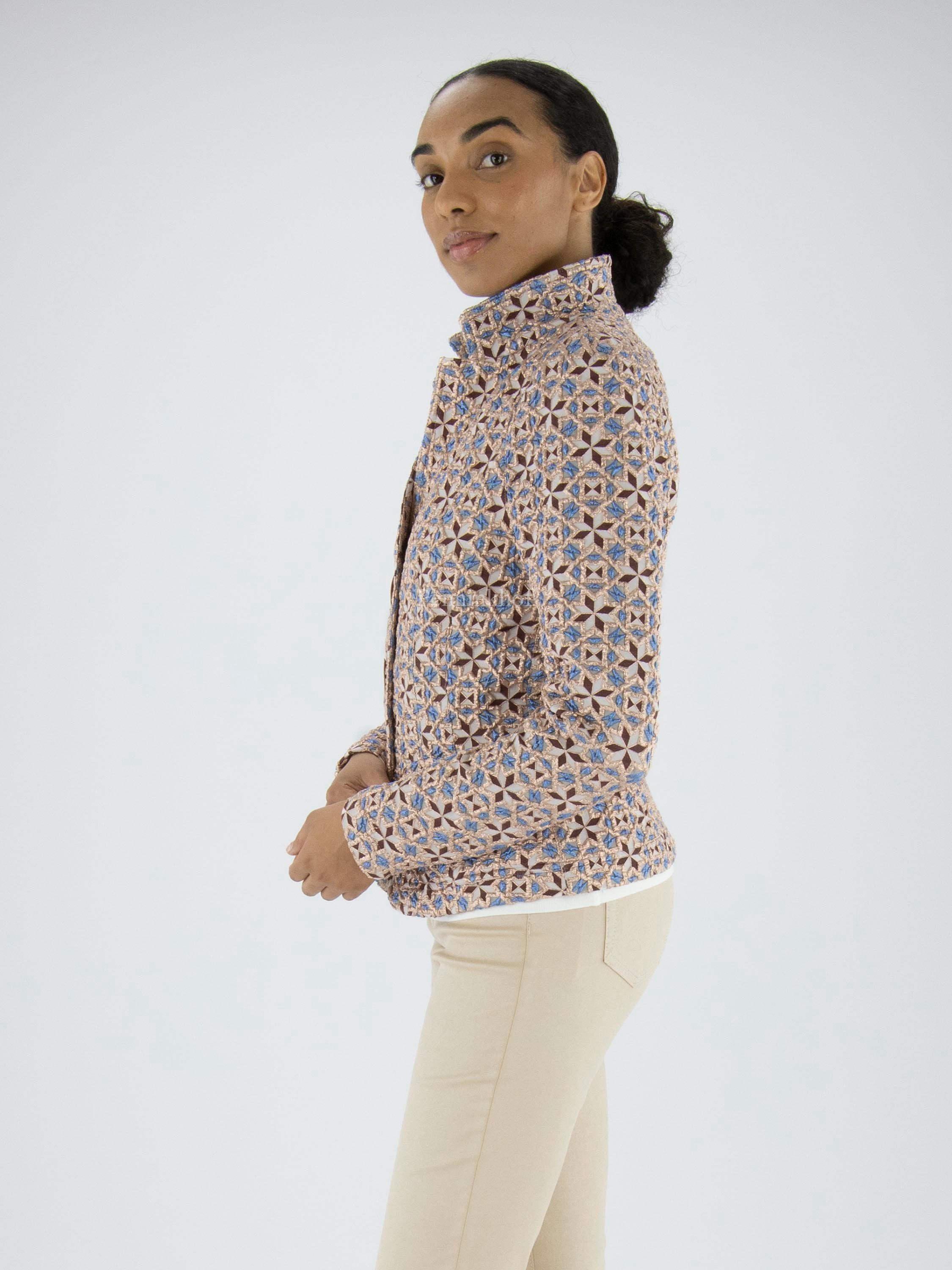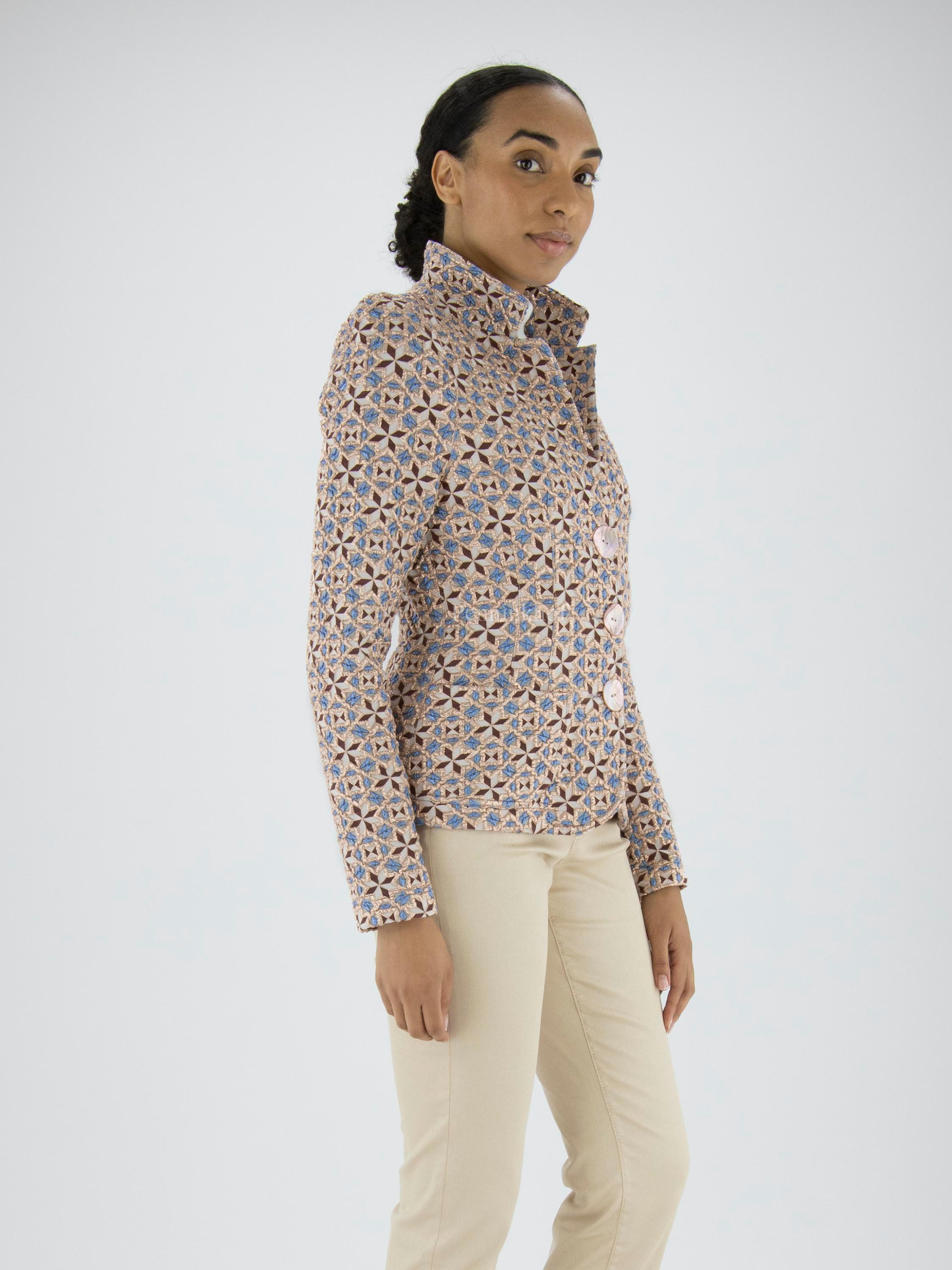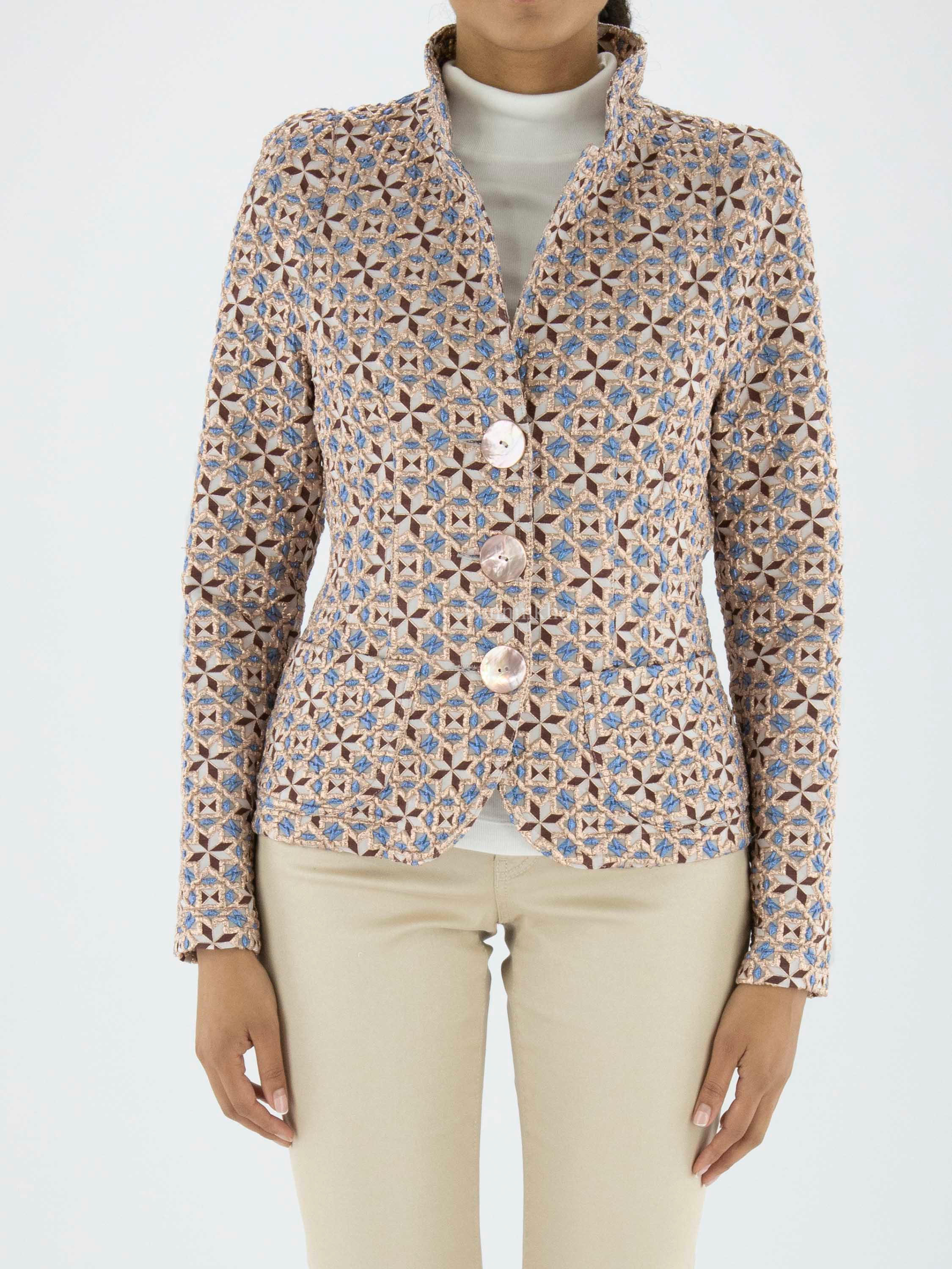 Ein Blazer von ML Collections mit geprägtem Mosaikdruck in den Farben Kupfer, Blau, Cremeweiß und Dunkelbraun. Der Blazer hat einen 3-Knopf-Verschluss und ist ungefüttert. Dieser Blazer sollte nicht gewaschen werden.