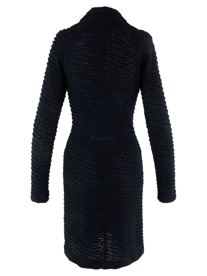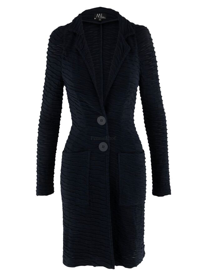 Langer Blazer von ML Collections in einer leicht transparenten, schwarzen Struktur mit Wellenstreifenprägung. Der Blazer hat einen 2-Knopf-Verschluss und ist ungefüttert. Dieser Blazer sollte nicht gewaschen werden.