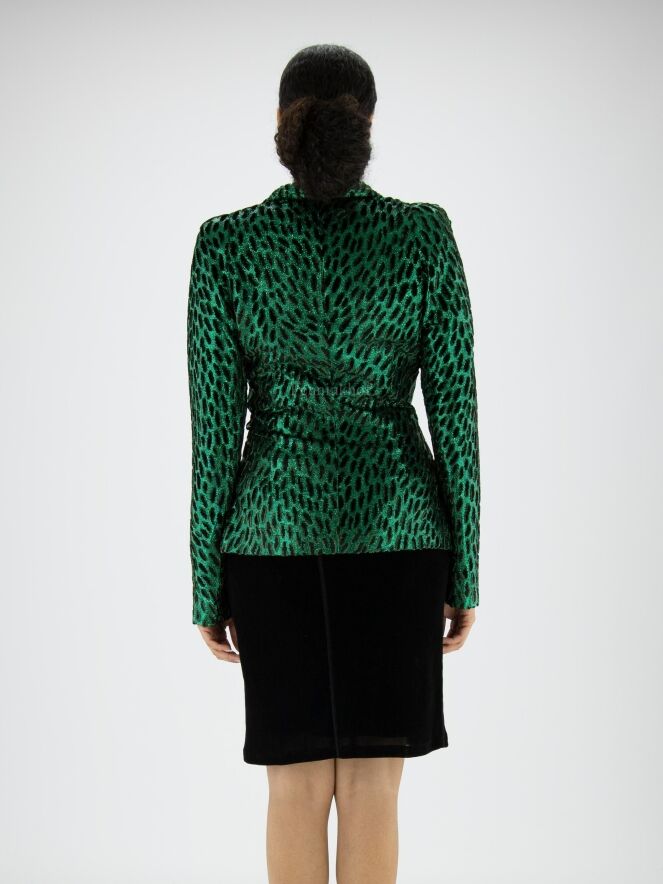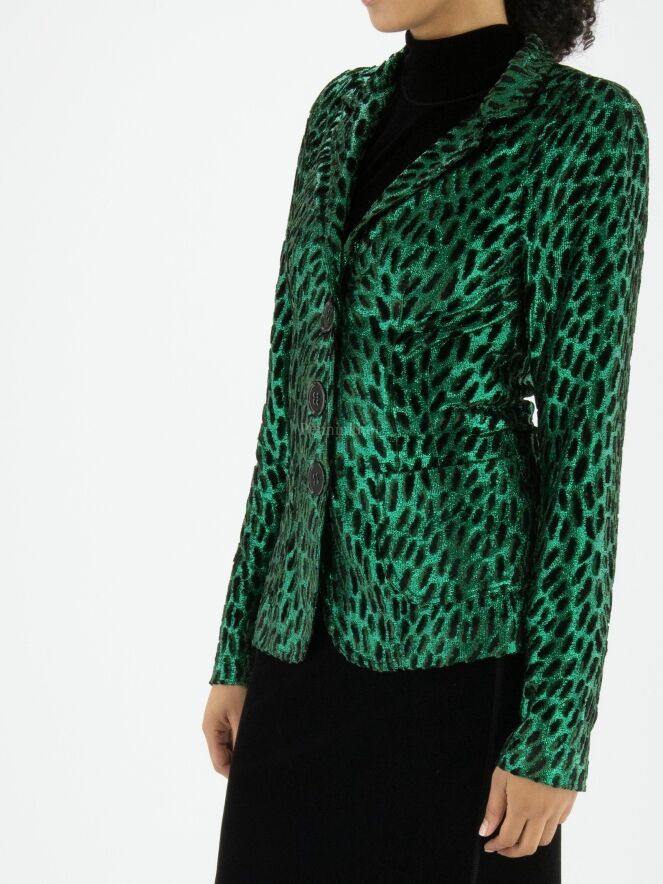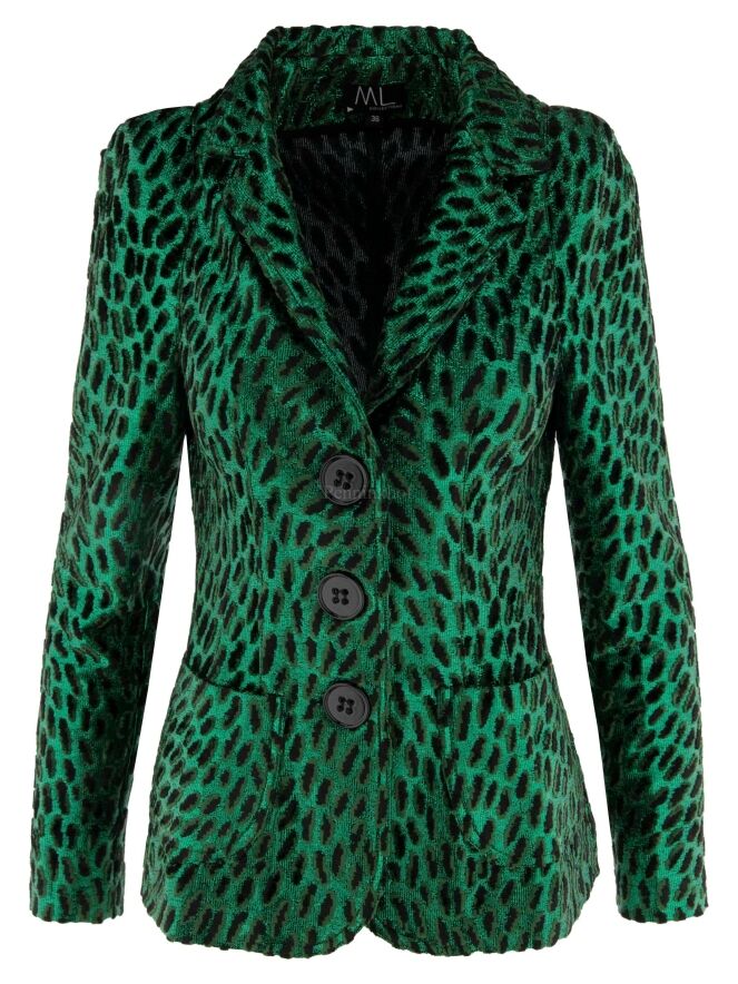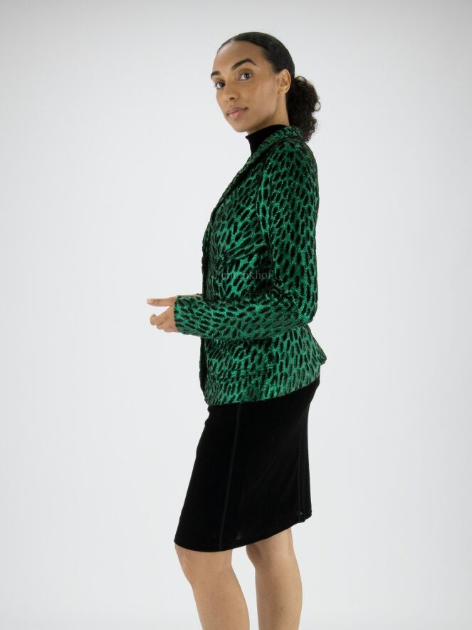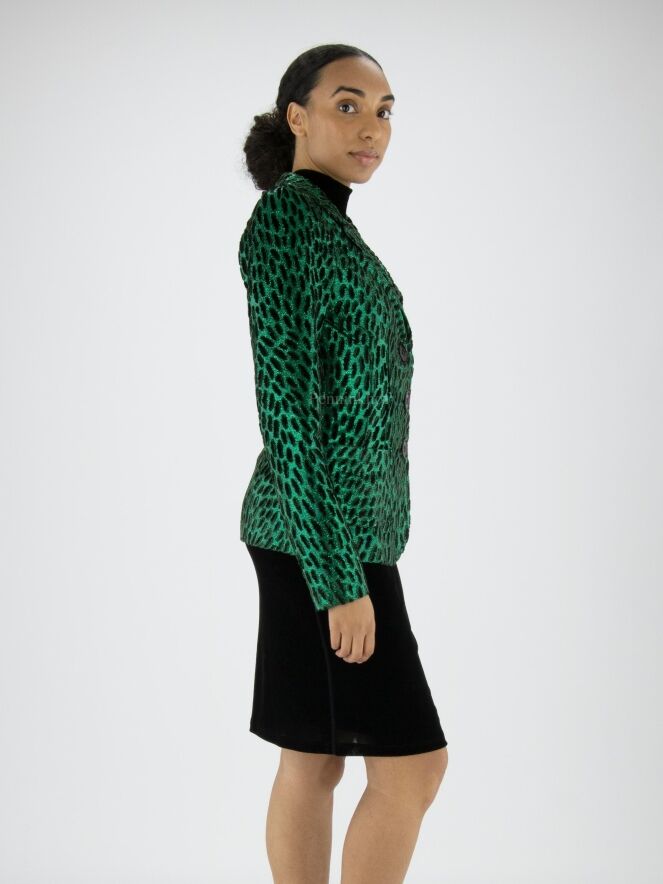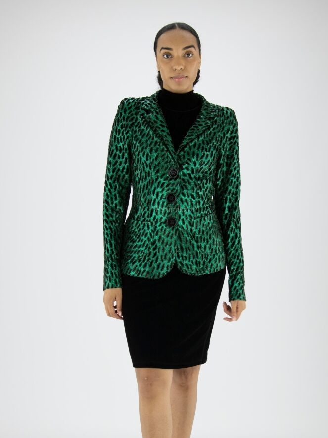 Ein Blazer von ML Collections mit Leopardenmuster, grünem Metallic-Look und schwarzem und grünem Velours. Der Blazer hat einen 3-Knopf-Verschluss und ist ungefüttert. Dieser Blazer sollte nicht gewaschen werden.