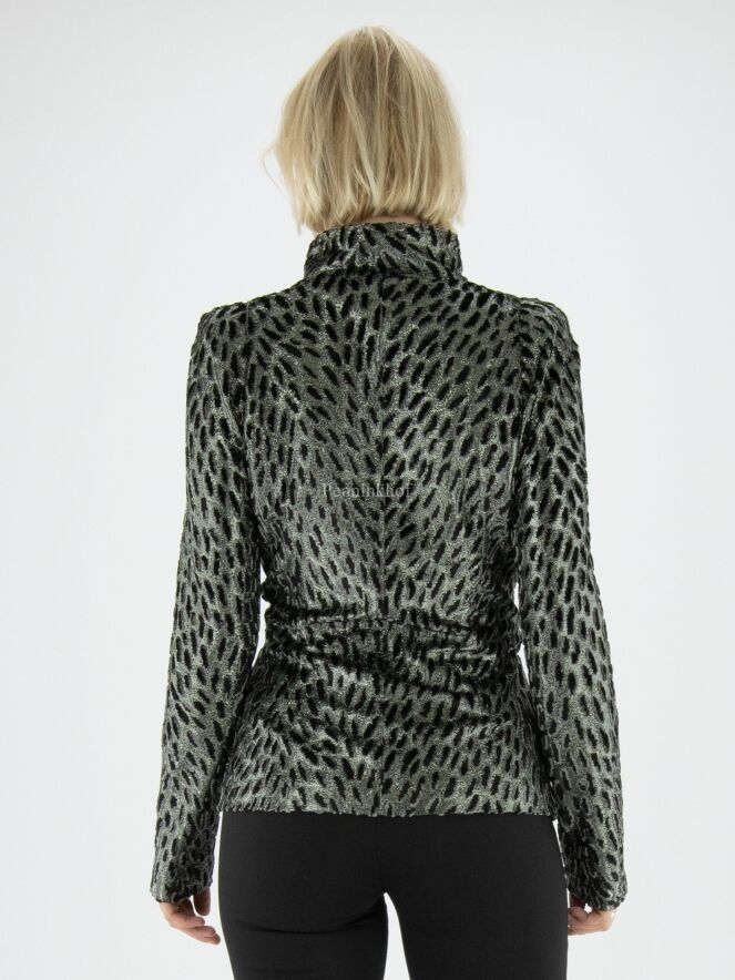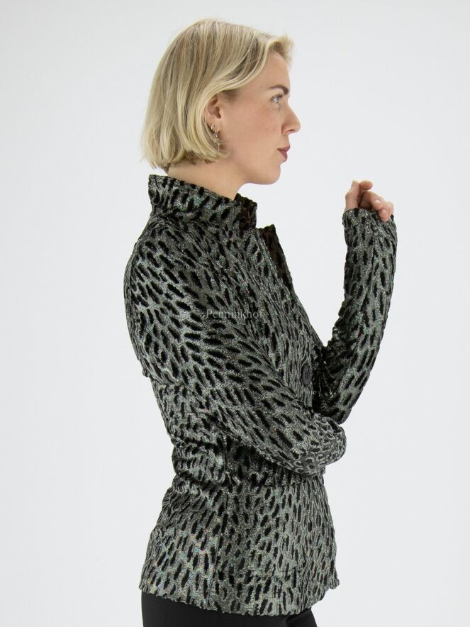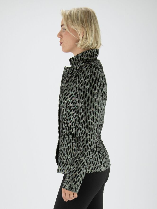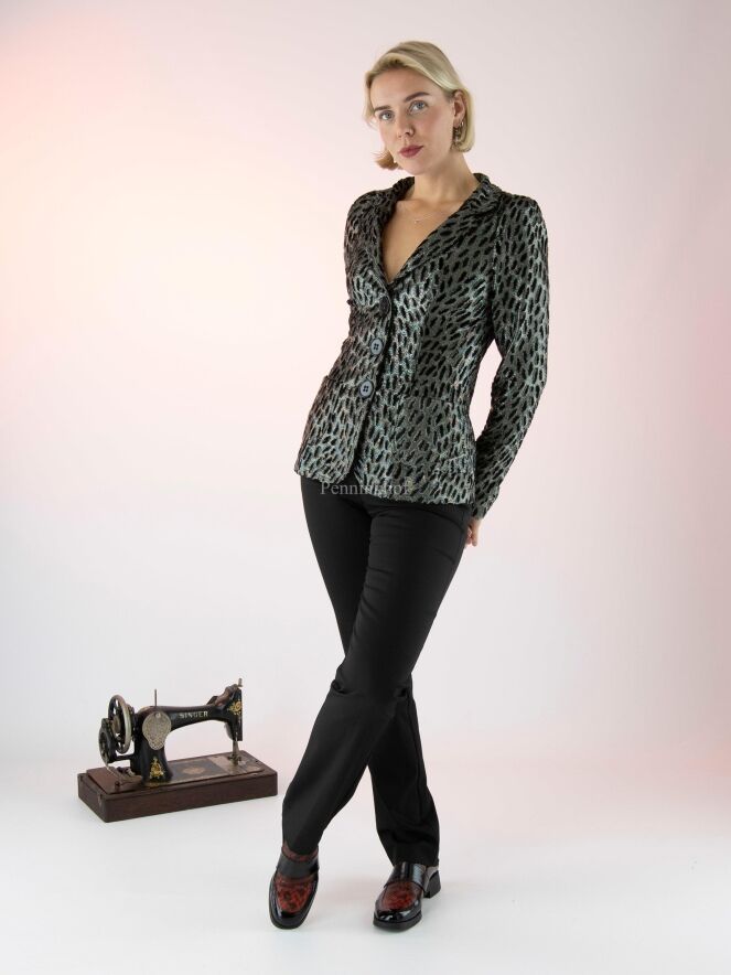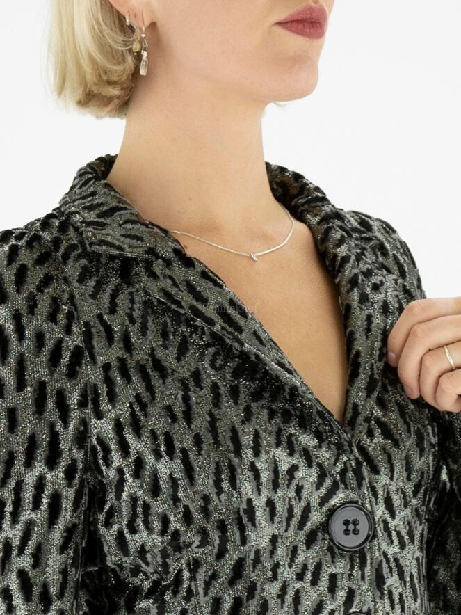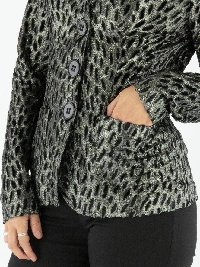 Ein Blazer von ML Collections mit Leopardenmuster und silbernem, schwarzem und hellgrauem Velours. Der Blazer hat einen 3-Knopf-Verschluss und ist ungefüttert. Dieser Blazer sollte nicht gewaschen werden.