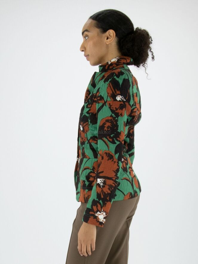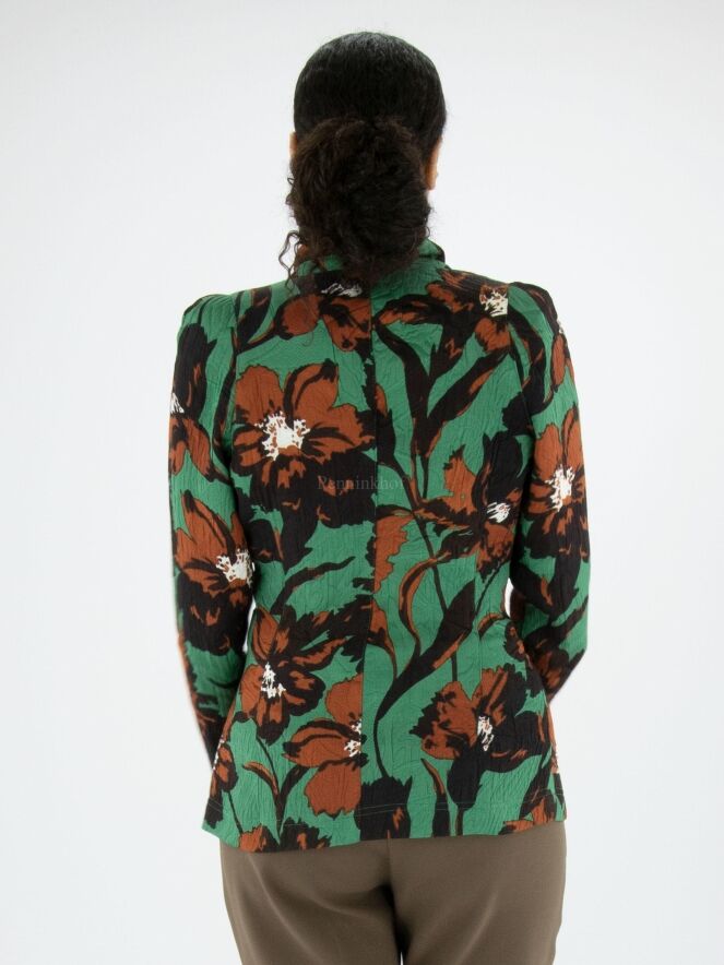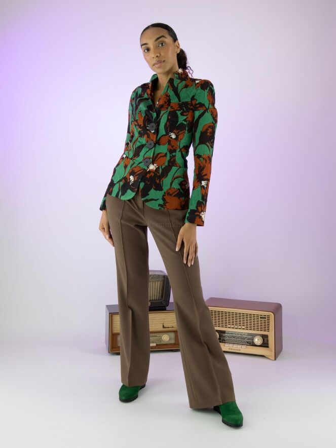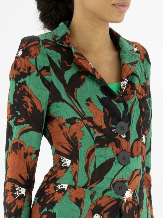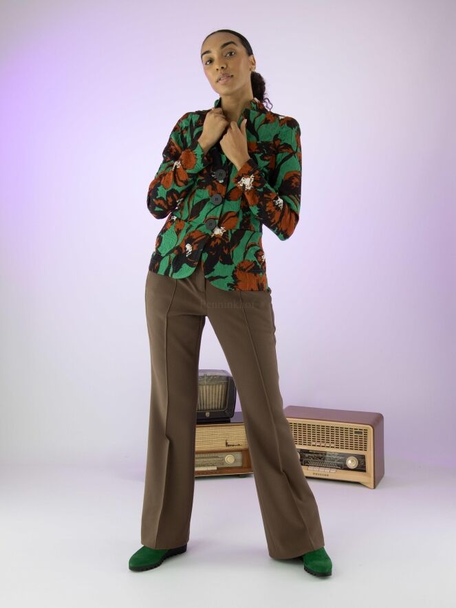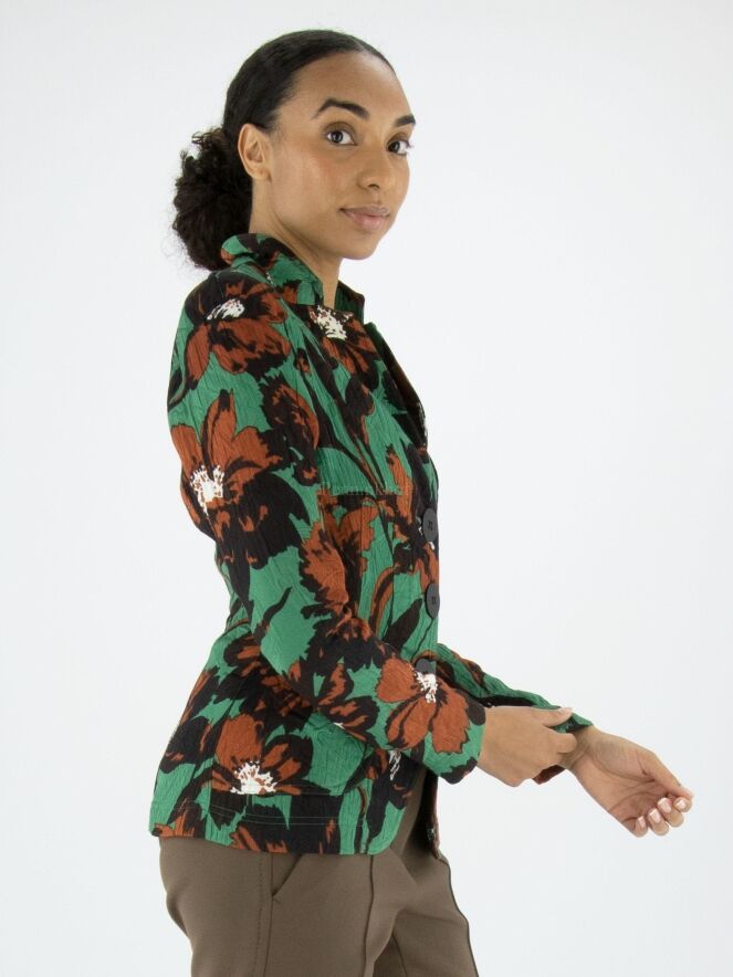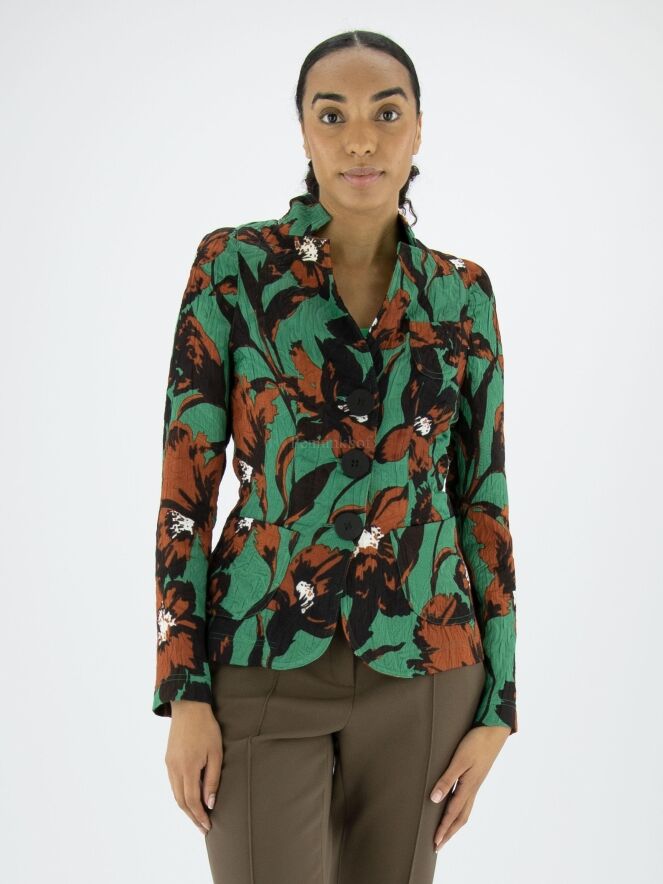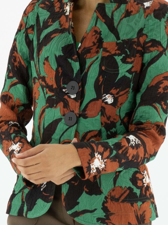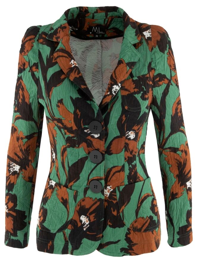 Ein Blazer von ML Collections mit einem grafischen Blätterdruck in den Farben Grün, Cognac und Schwarz. Der Blazer hat einen 3-Knopf-Verschluss und ist ungefüttert. Dieser Blazer sollte nicht gewaschen werden.