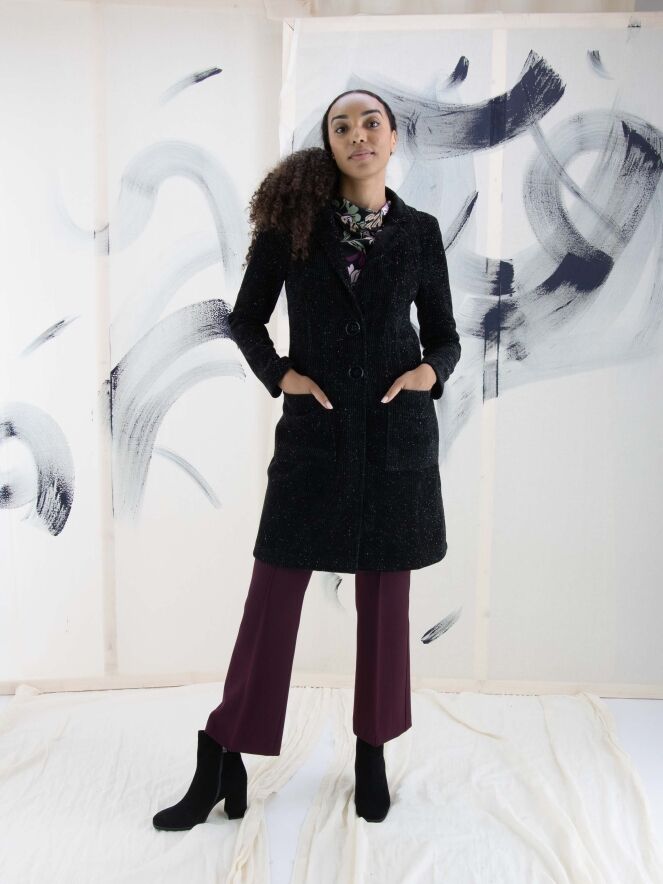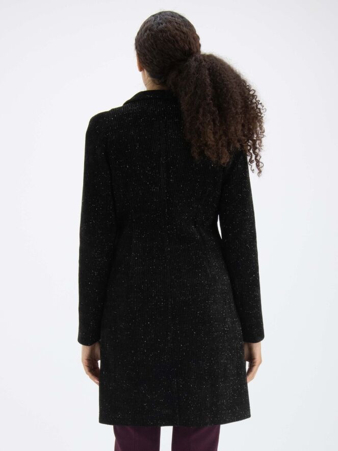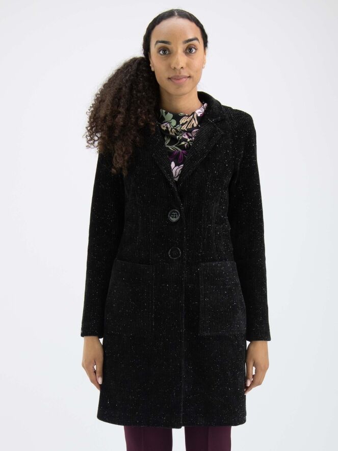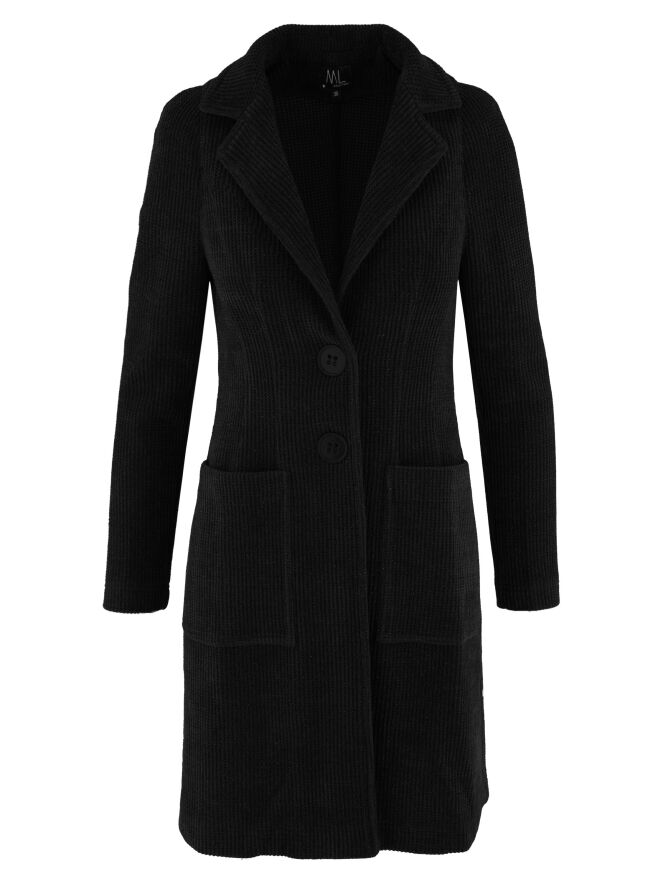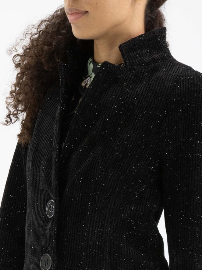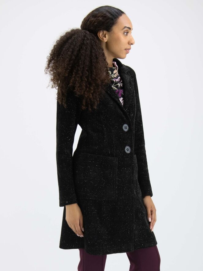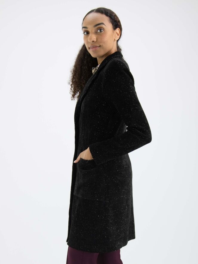 Ein langer Blazer von ML Collections in melierter schwarzer Farbe. Der Blazer hat eine Zweiknopf-Verschluss und ist ungefüttert. Ein Silberfaden ist in den Stoff eingewebt. Dieser Blazer darf nicht gewaschen werden.