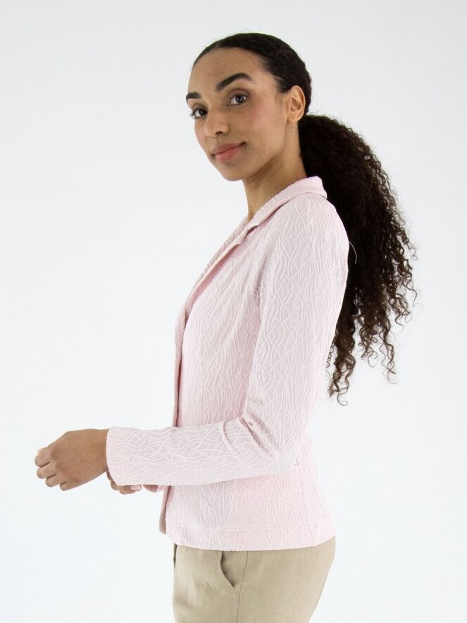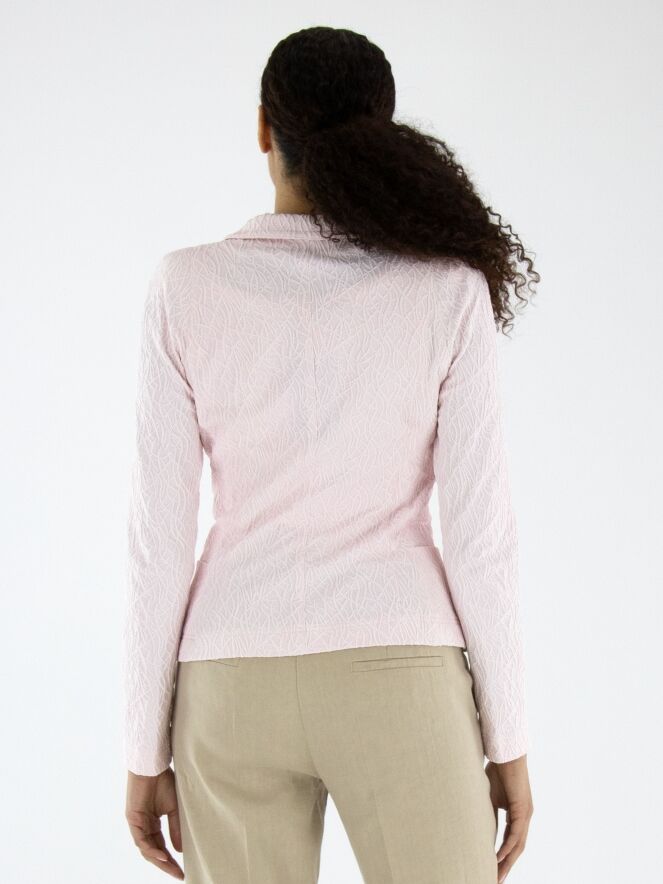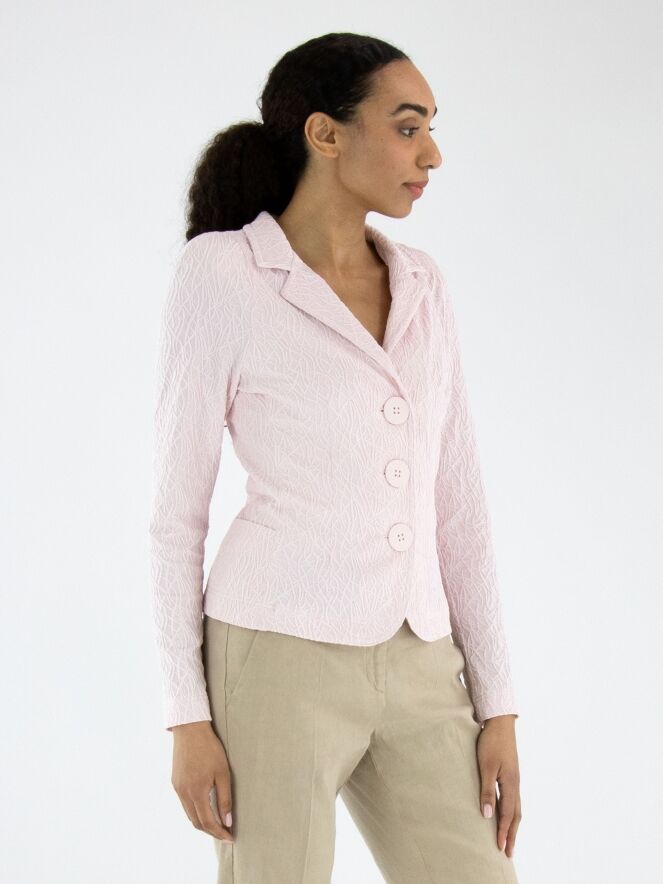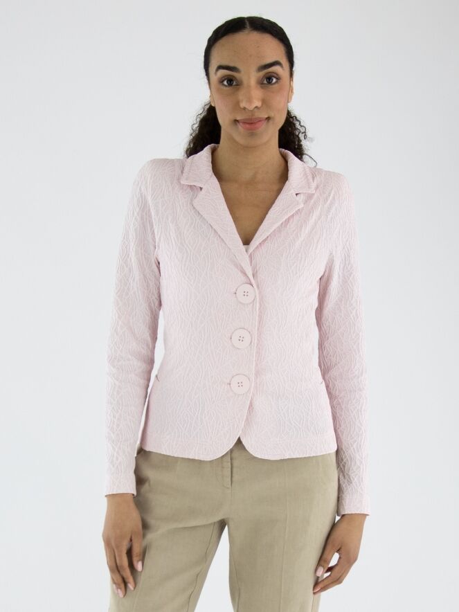 Ein Blazer von ML Collections mit einem Zierbändchenmuster in Pastellrosa. Der Blazer hat eine Dreiknopf-Verschluss und ist ungefüttert. Dieser Blazer darf nicht gewaschen werden.