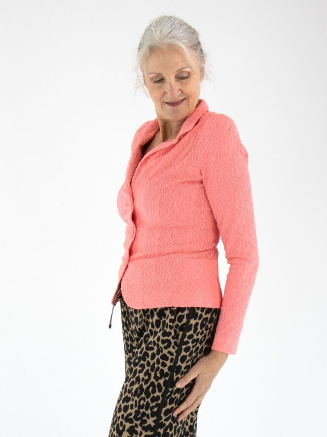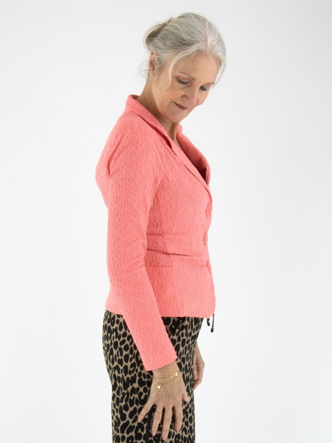 Ein Blazer von ML Collections mit einem Zierbändchenmuster in einem sanften Korallenrot. Der Blazer hat eine Dreiknopf-Verschluss und ist ungefüttert. Dieser Blazer darf nicht gewaschen werden.