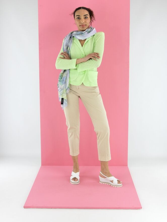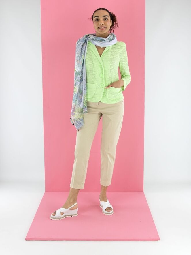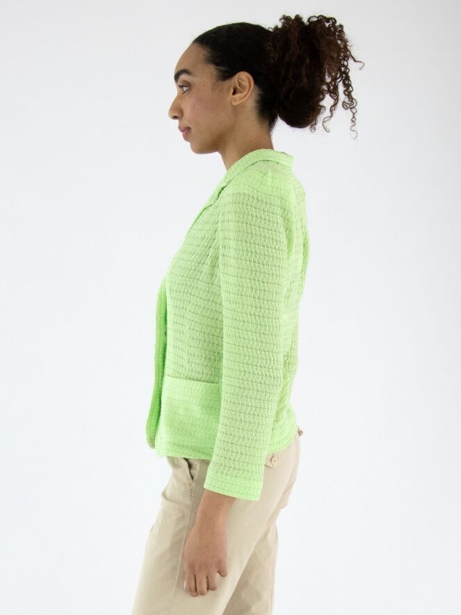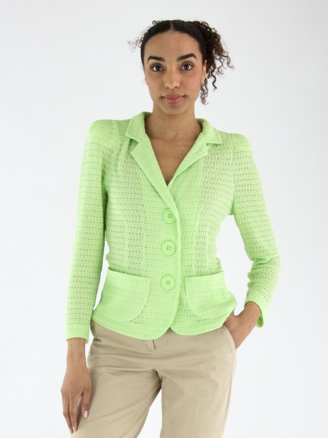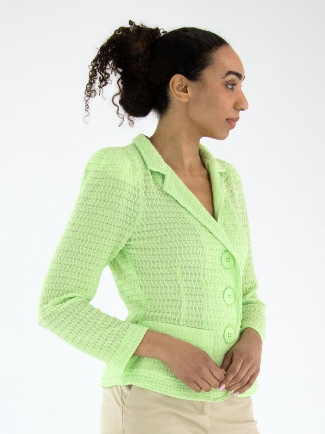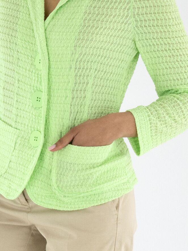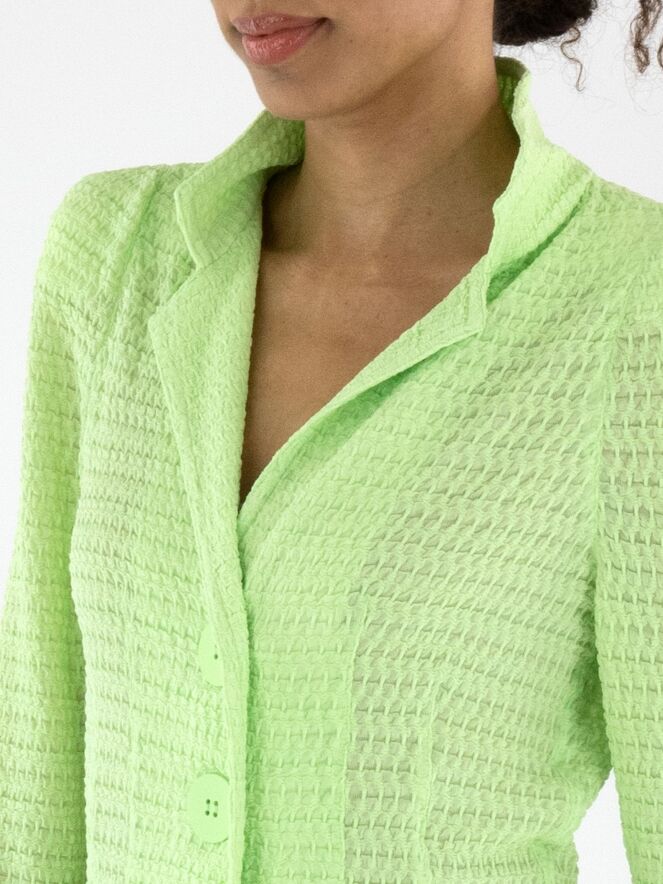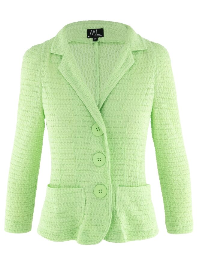 Ein Blazer von ML Collections mit einer gesmokten Struktur in einem frischen Pistaziengrün. Der Blazer hat eine Dreiknopf-Verschluss und ist ungefüttert. Dieser Blazer darf nicht gewaschen werden.