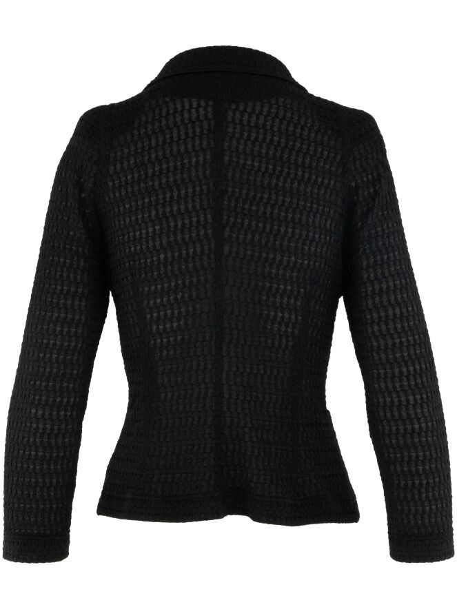 Ein Blazer von ML Collections mit einer gesmokten Struktur in Schwarz. Der Blazer hat eine Dreiknopf-Verschluss und ist ungefüttert. Dieser Blazer darf nicht gewaschen werden.