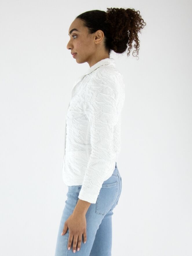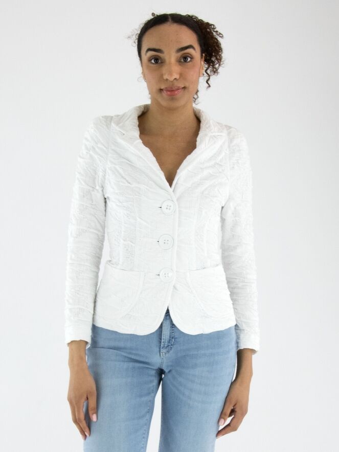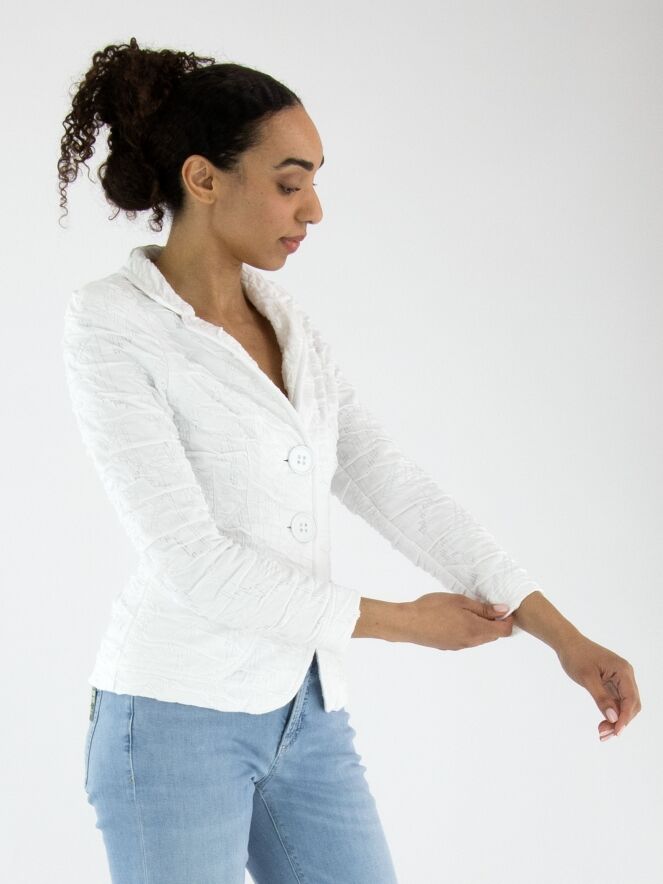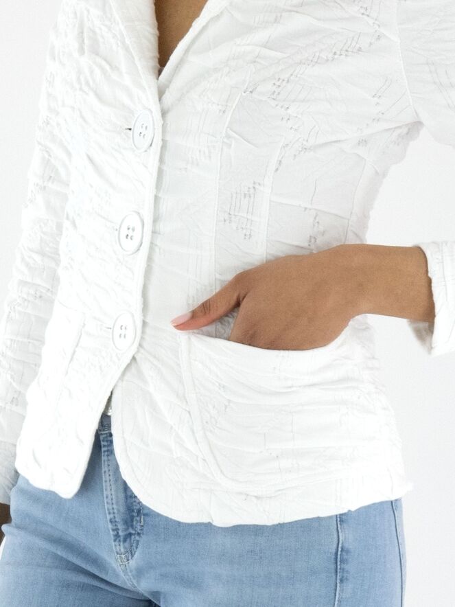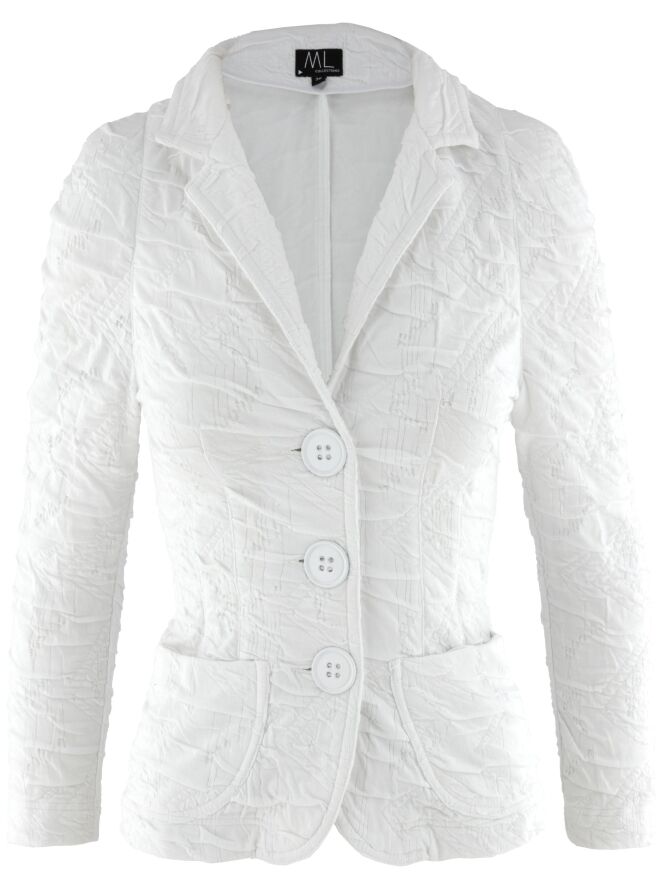Ein Blazer von ML Collections in Weiß. Der Stoff hat eine gesmokte Struktur. Der Blazer ist ungefüttert und wird mit drei Knöpfen geschlossen. Dieser Blazer darf nicht gewaschen werden.
