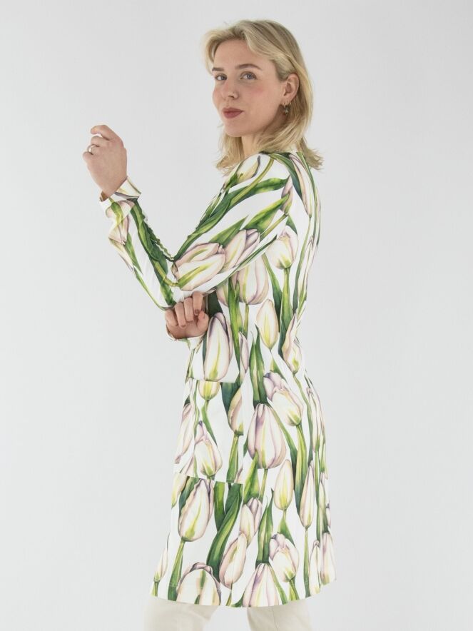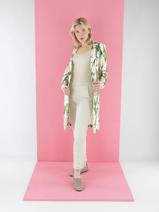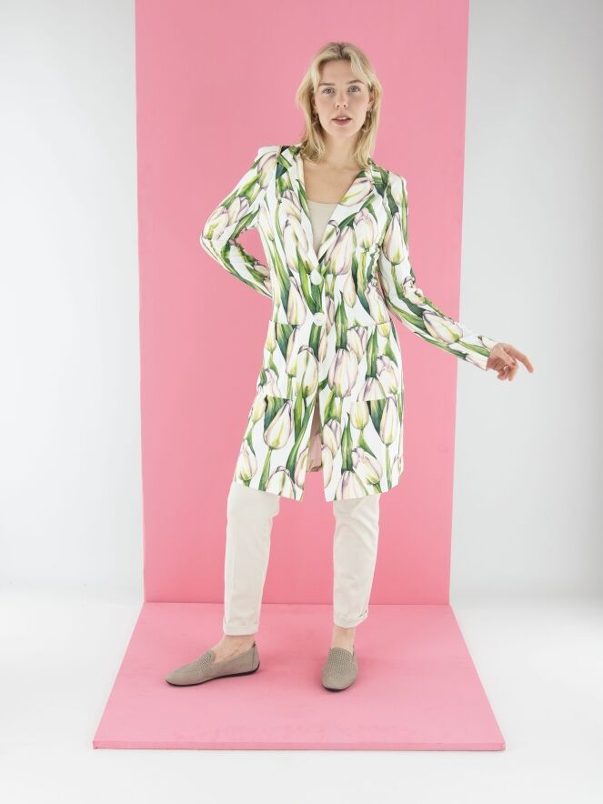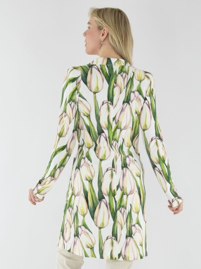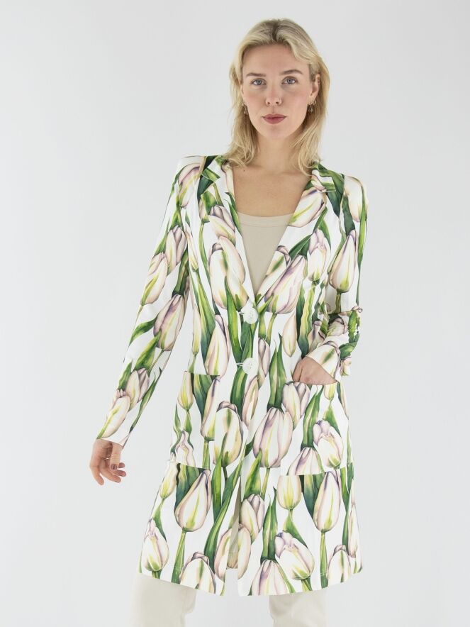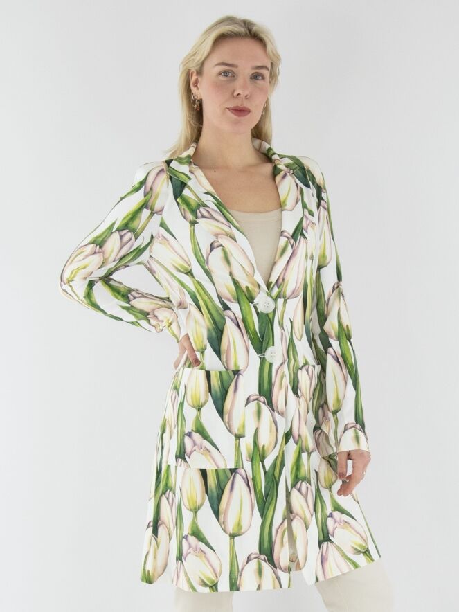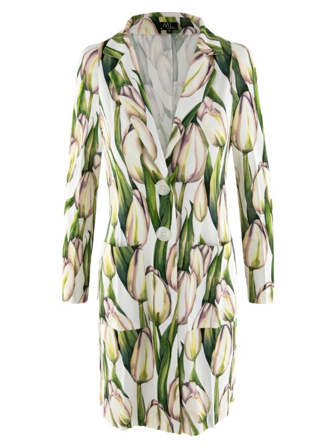 Ein langer Blazer von ML Collections mit einem Tulpenmuster in verschiedenen Grüntönen und Rosa auf weißem Hintergrund. Der Blazer hat eine Zwei-Knopf-Schließung und ist ungefüttert. Dieser Blazer darf nicht gewaschen werden.