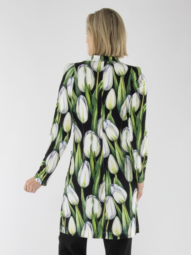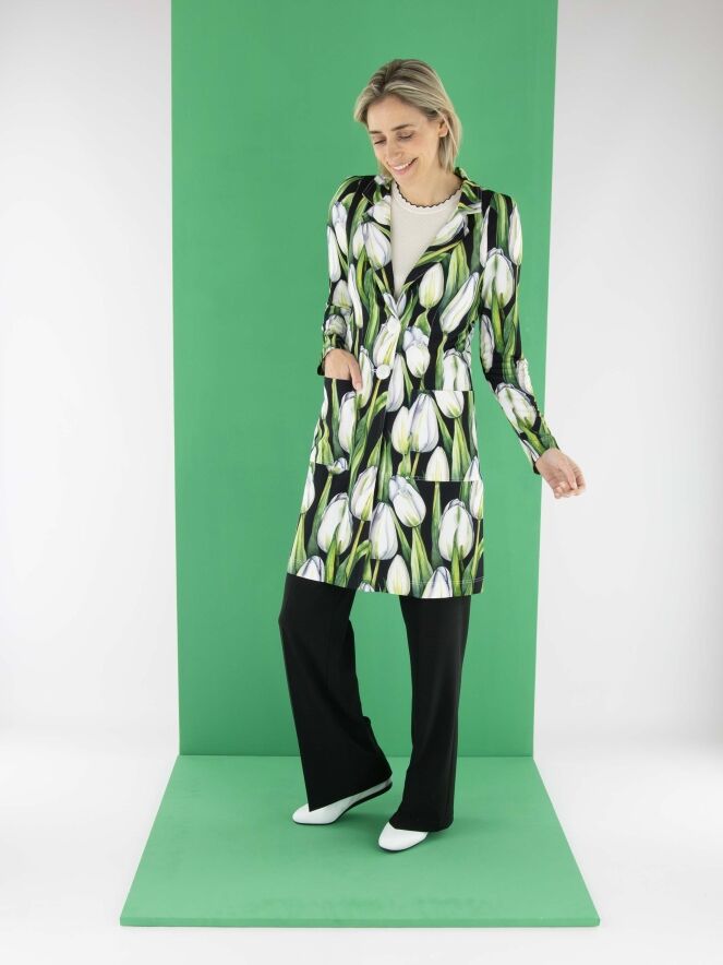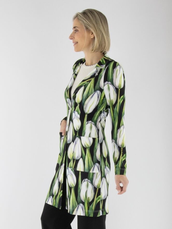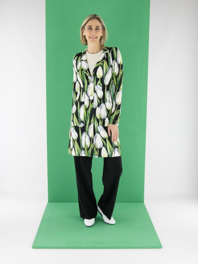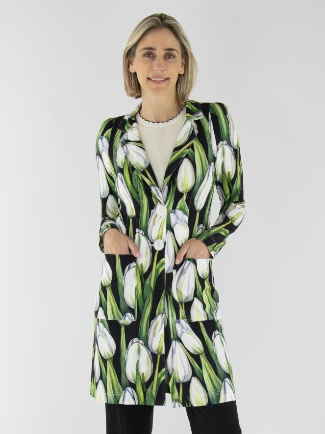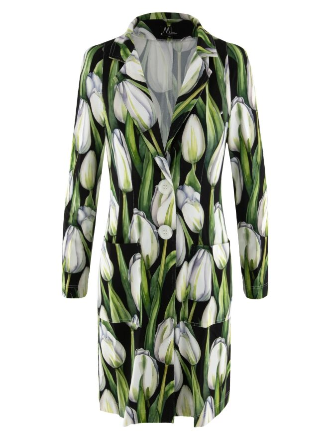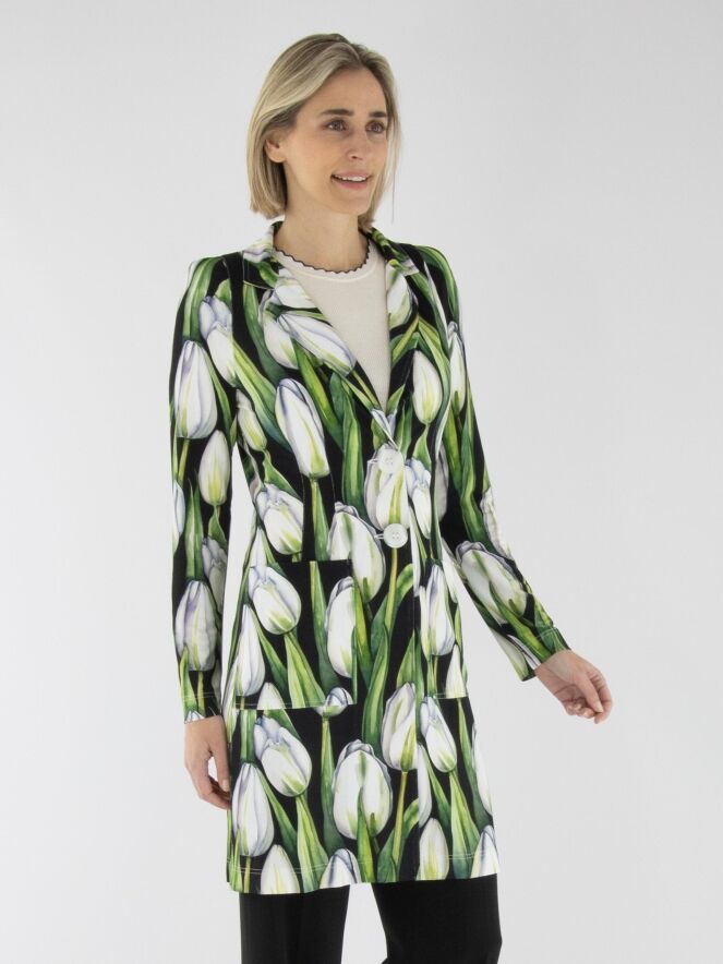 Ein langer Blazer von ML Collections mit einem Tulpenmuster in verschiedenen Grün- und Rosatönen auf schwarzem Hintergrund. Der Blazer hat eine Zwei-Knopf-Schließung und ist ungefüttert. Dieser Blazer darf nicht gewaschen werden.