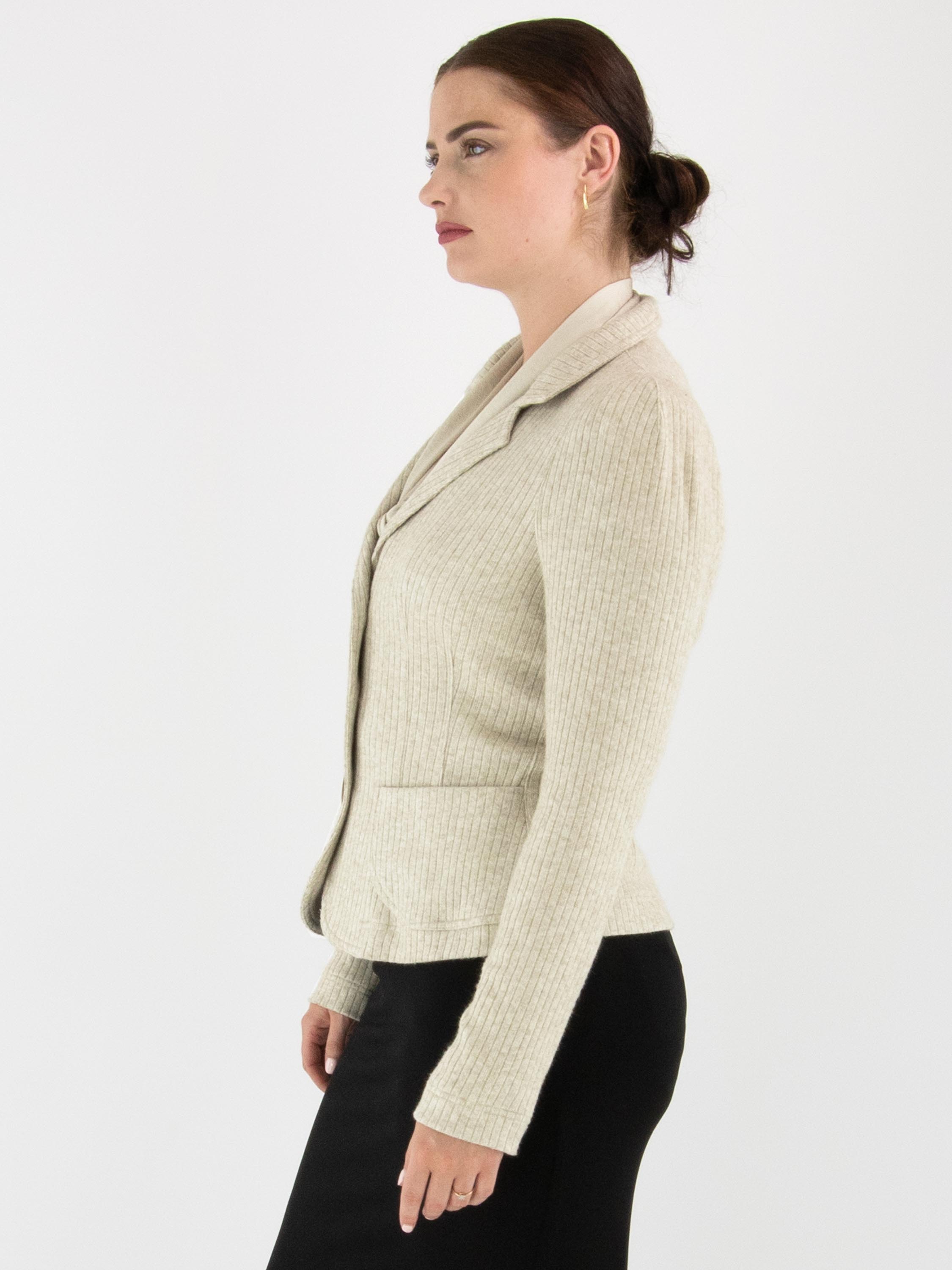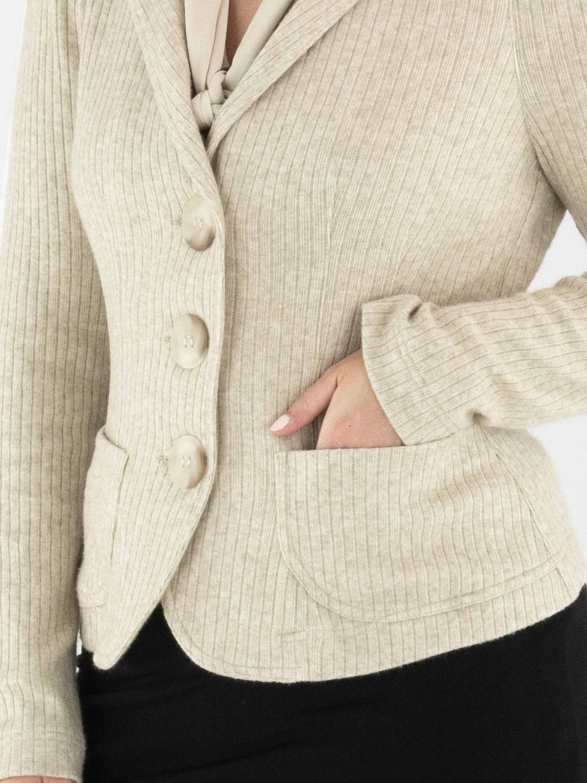 Blazer von ML Collections in Beige. Der Stoff hat eine feine Rippstruktur. Der Blazer hat eine Dreiknopf-Verschluss und ist ungefüttert. Dieser Blazer darf nicht gewaschen werden.