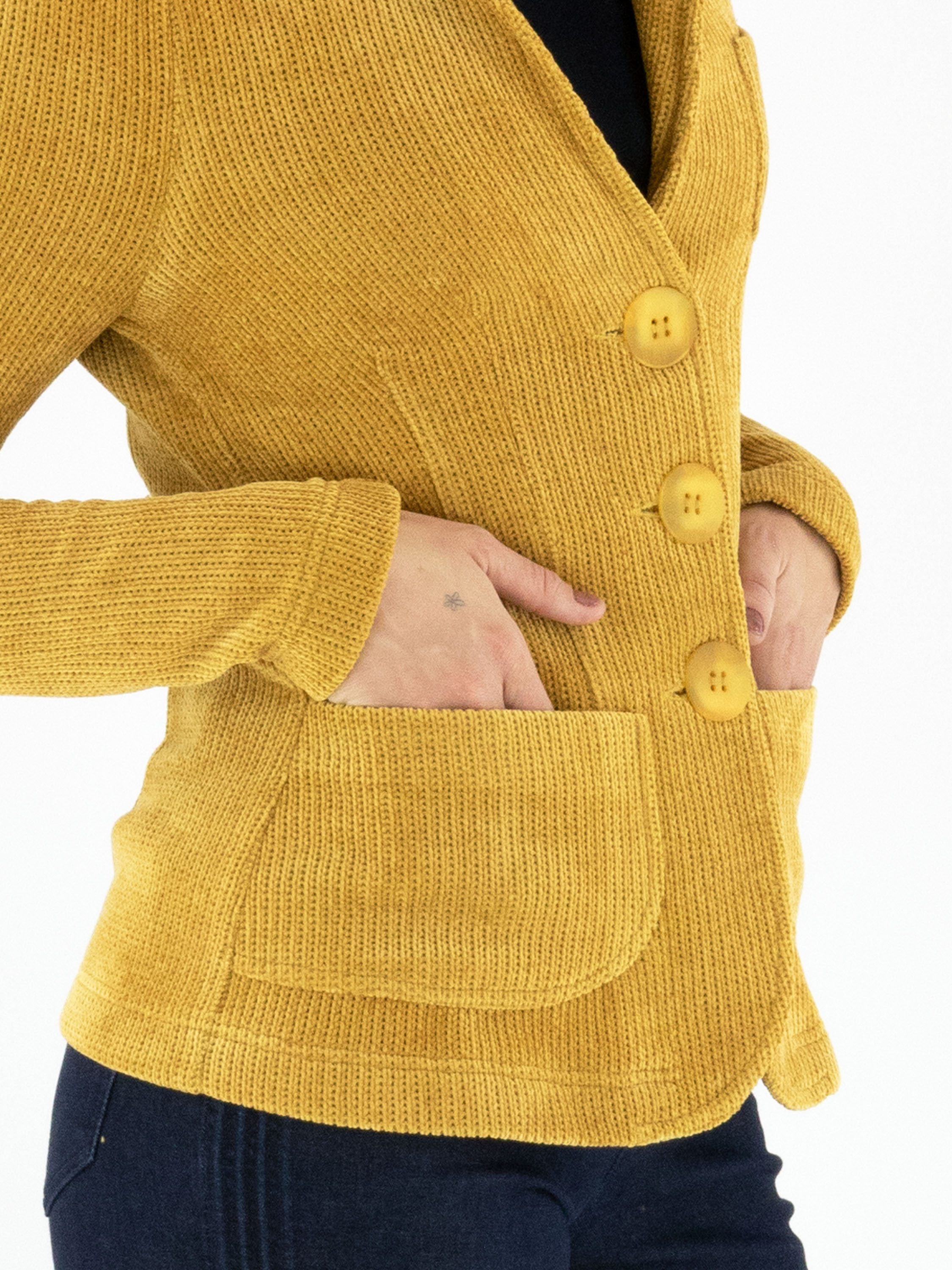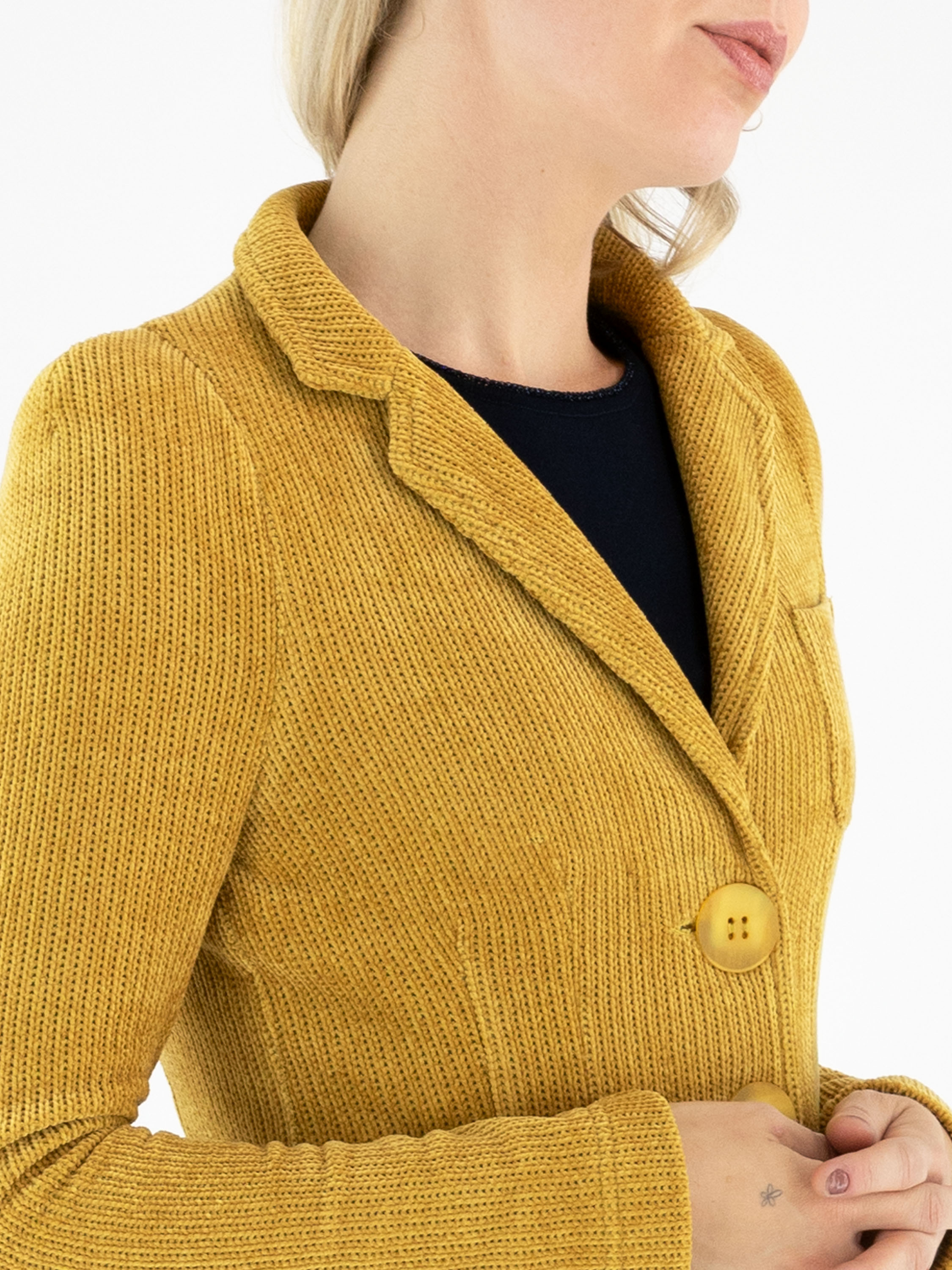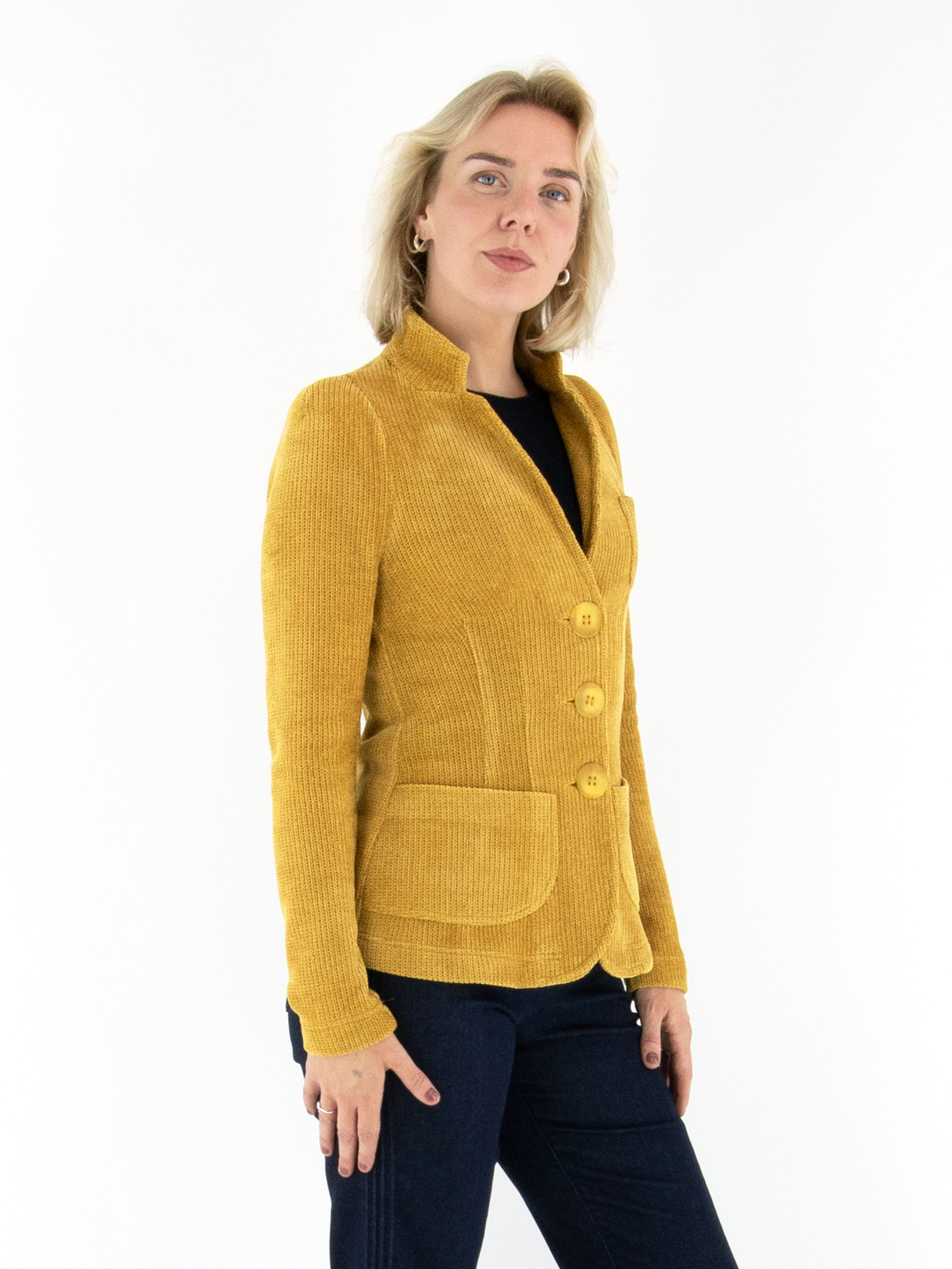 Blazer von ML Collections in elegantem Ockergelb. Dieser exklusive Damenblazer ist aus luxuriösem Rippcord gefertigt und ungefüttert, wodurch er einen fließenden und stilvollen Fall erhält. Mit einer Dreiknopf-Schließung betont dieses Designerstück eine zeitlose, feminine Silhouette. Um die Qualität langfristig zu bewahren, sollte der Blazer nicht gewaschen werden.