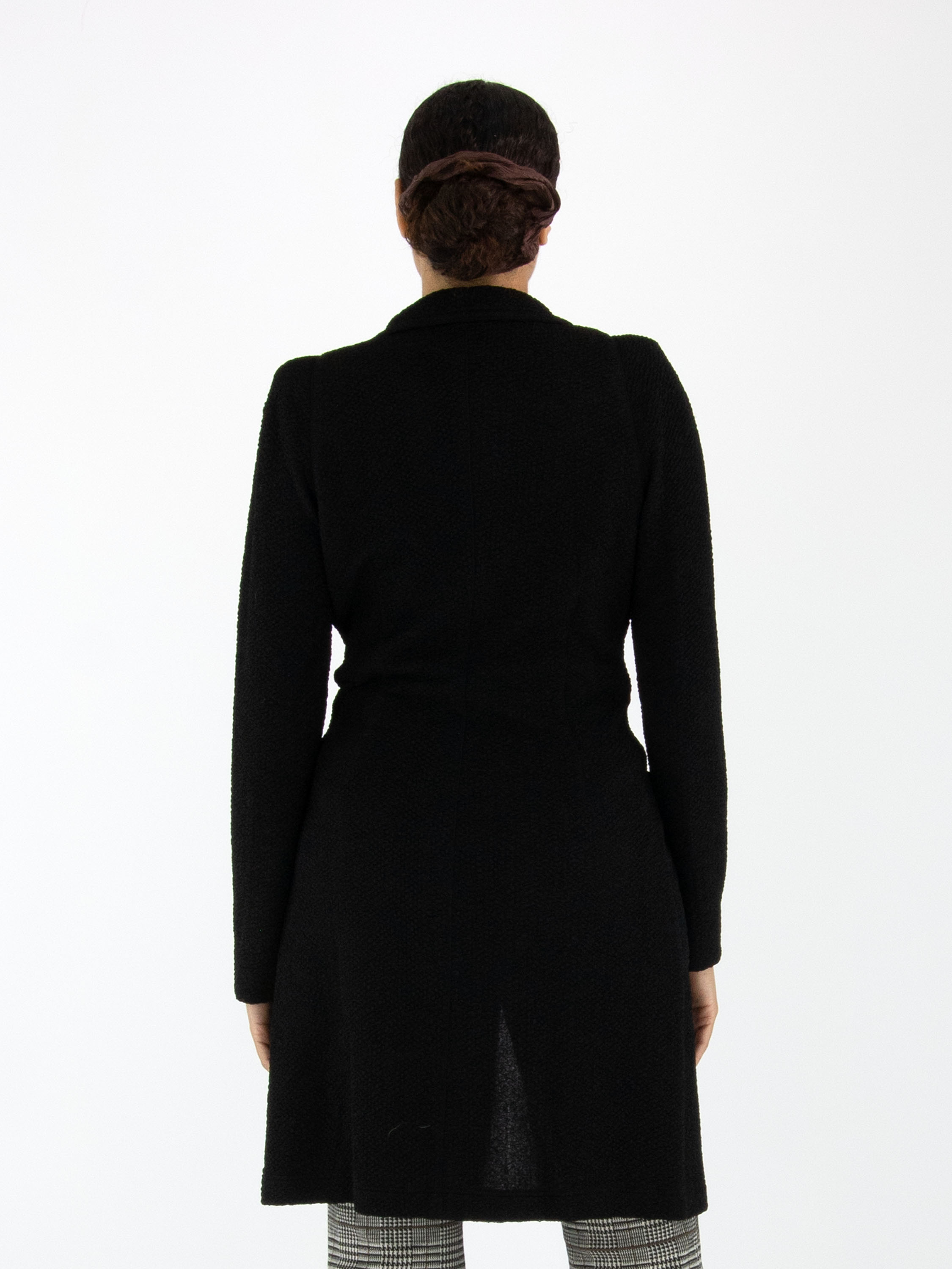 Langer Blazer von ML Collections in Schwarz. Der Stoff hat eine feine Struktur mit Noppen und ist ungefüttert. Der Blazer wird mit zwei Knöpfen geschlossen. Dieser Blazer darf nicht gewaschen werden.