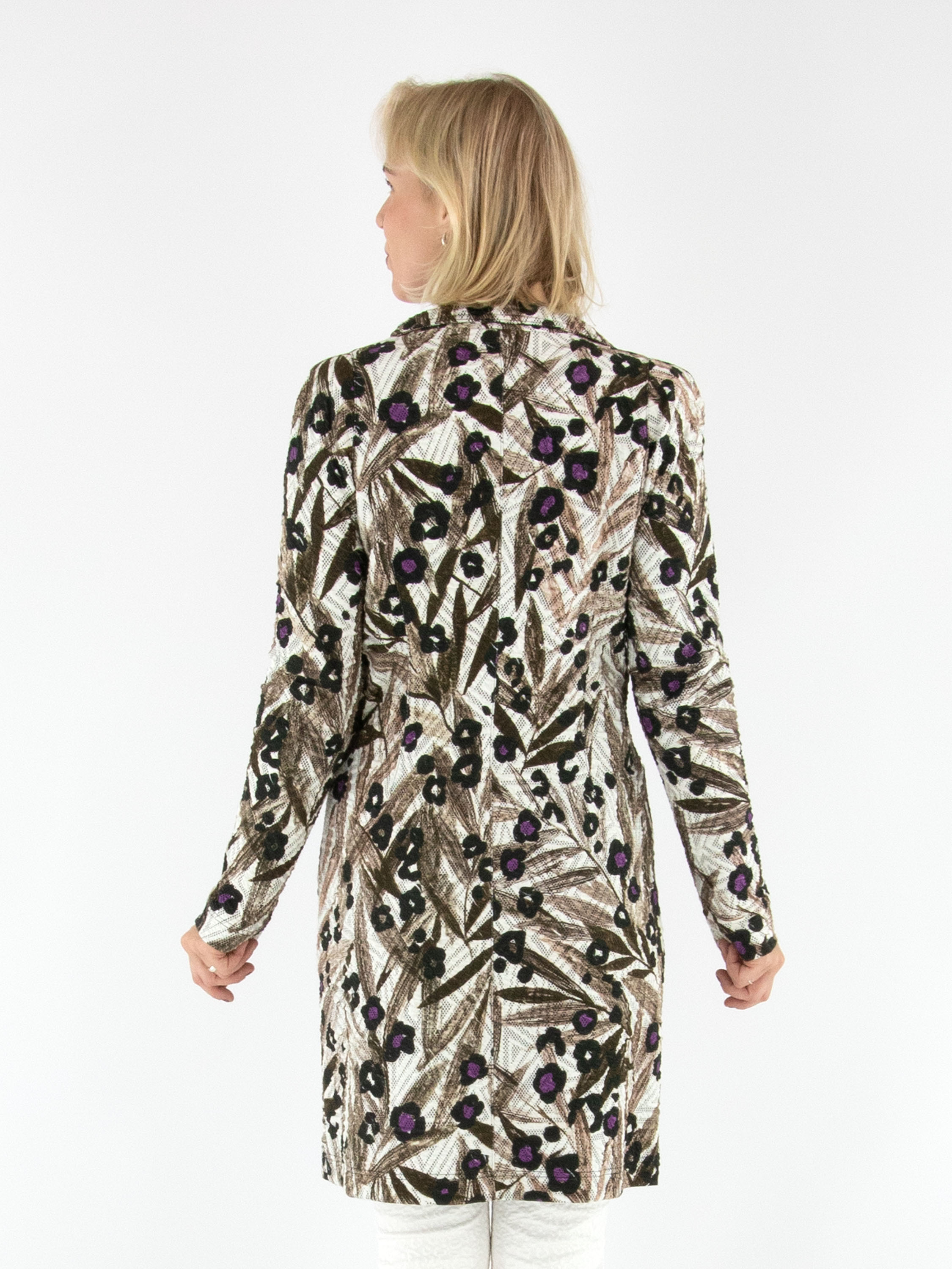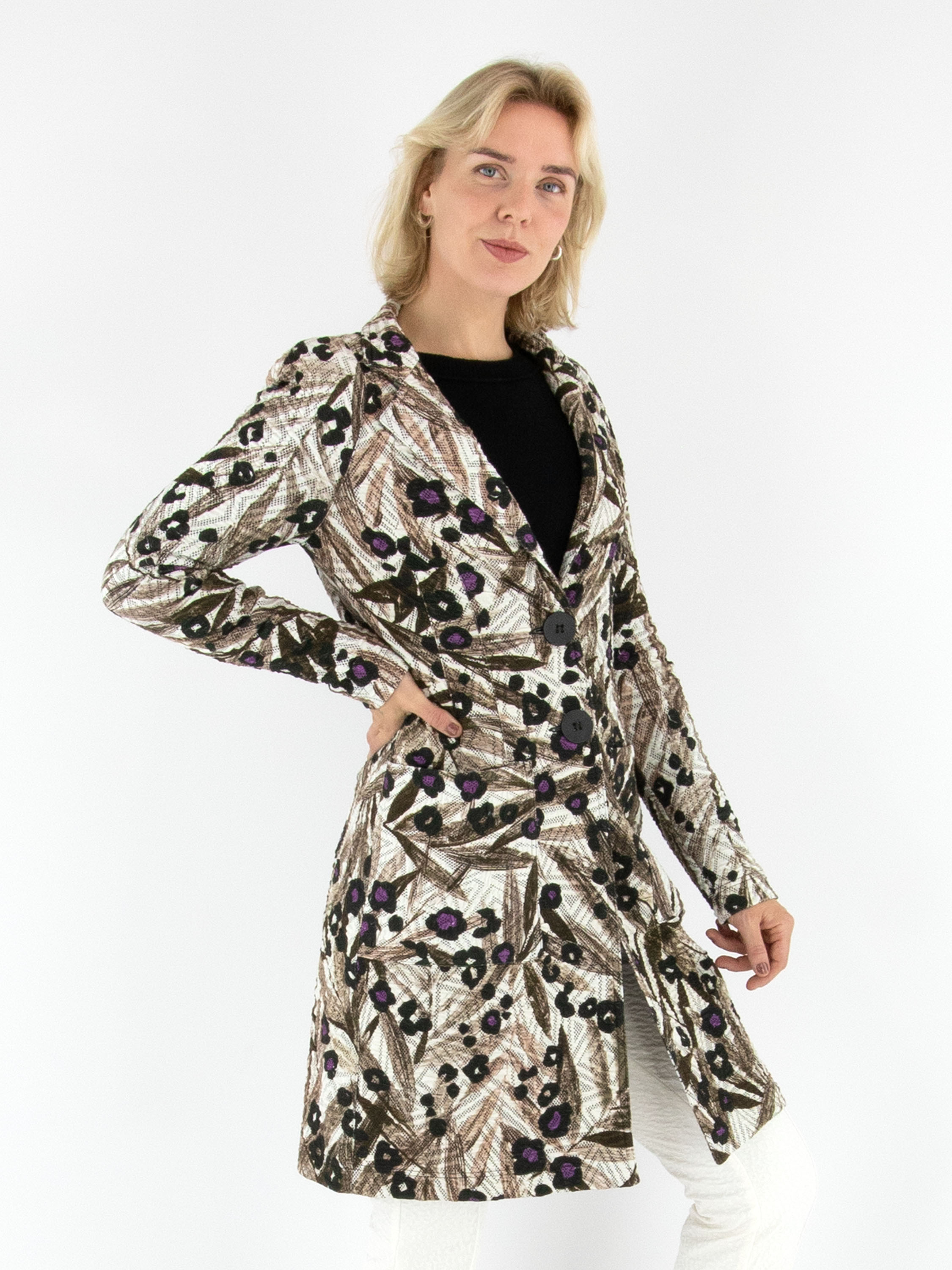 Langer Blazer von ML Collections mit einem eleganten Blätter- und Blumenmuster in Lila und Schwarz auf cremefarbenem Grund mit warmen Brauntönen. Dieser stilvolle Damenblazer ist ungefüttert und wird mit zwei Knöpfen geschlossen, was eine fließende und feminine Silhouette betont. Zur Erhaltung der Qualität sollte der Blazer nicht gewaschen werden.
