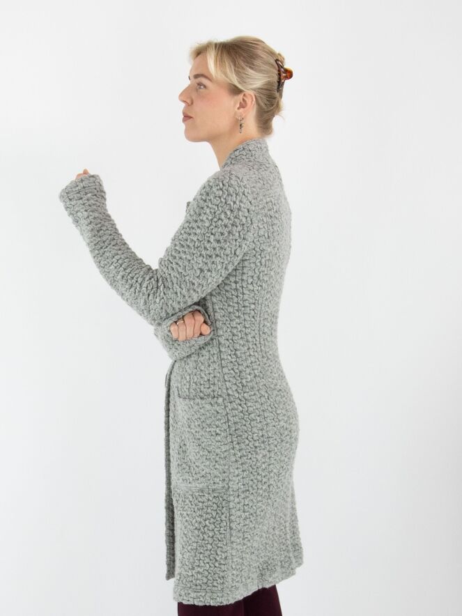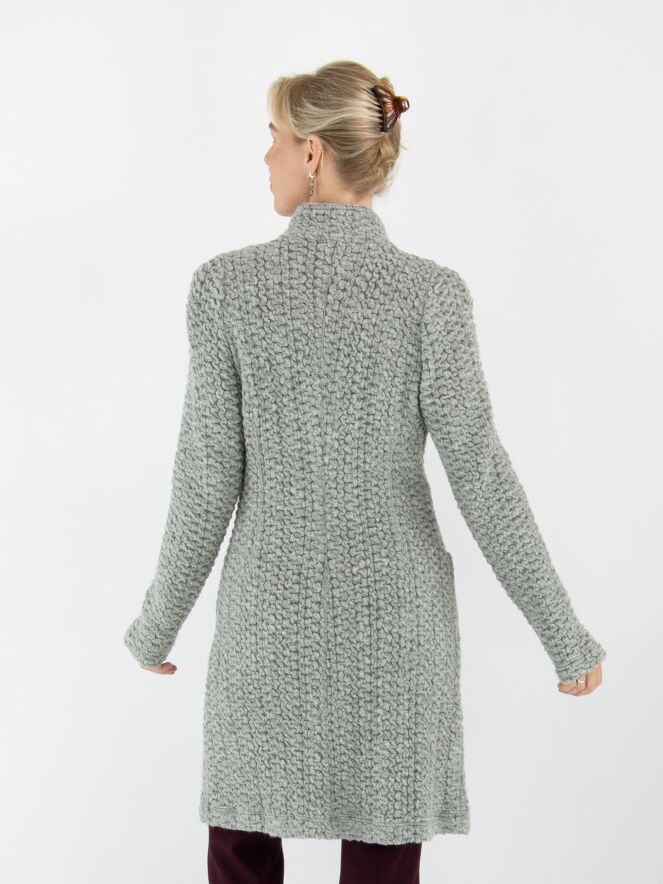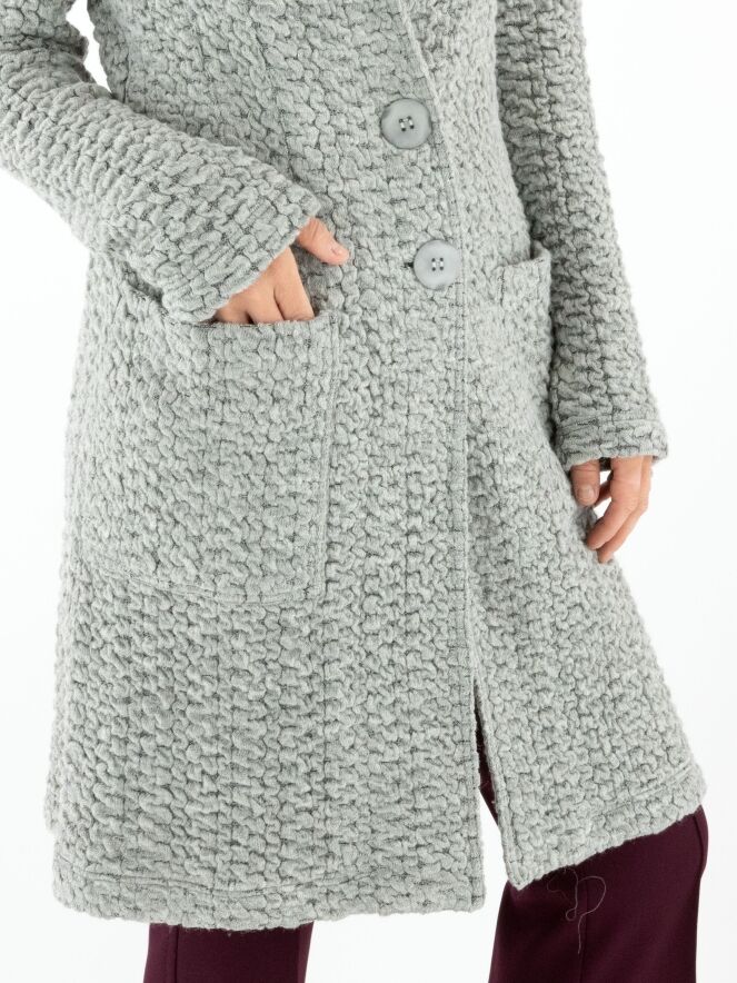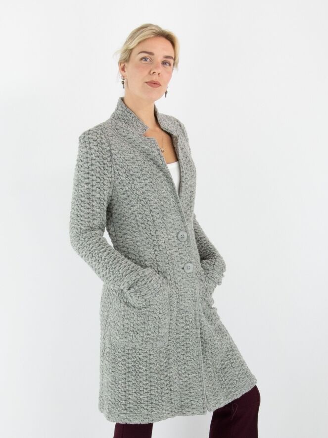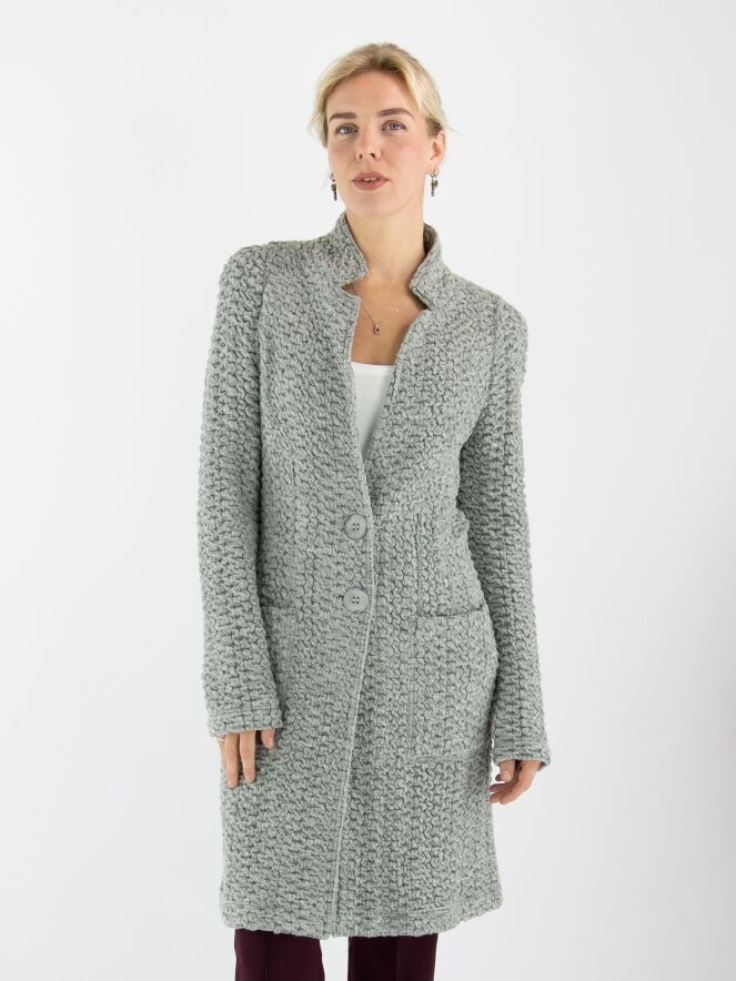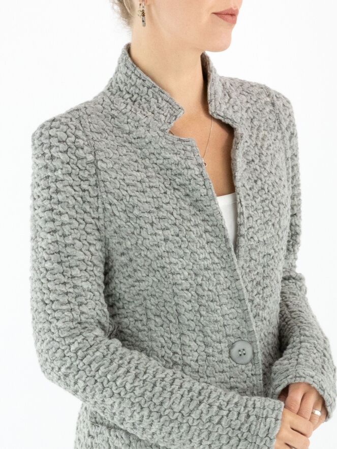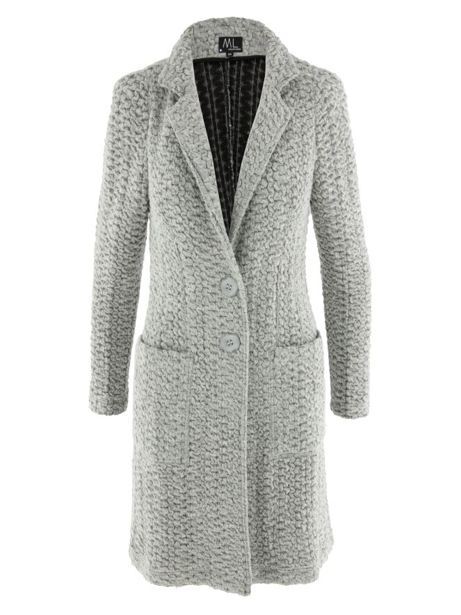 Langer Blazer von ML Collections in Hellgrau mit gesmokter Struktur. Der Blazer hat eine Zweiknopf-Verschluss und ist ungefüttert. Dieser Blazer darf nicht gewaschen werden.