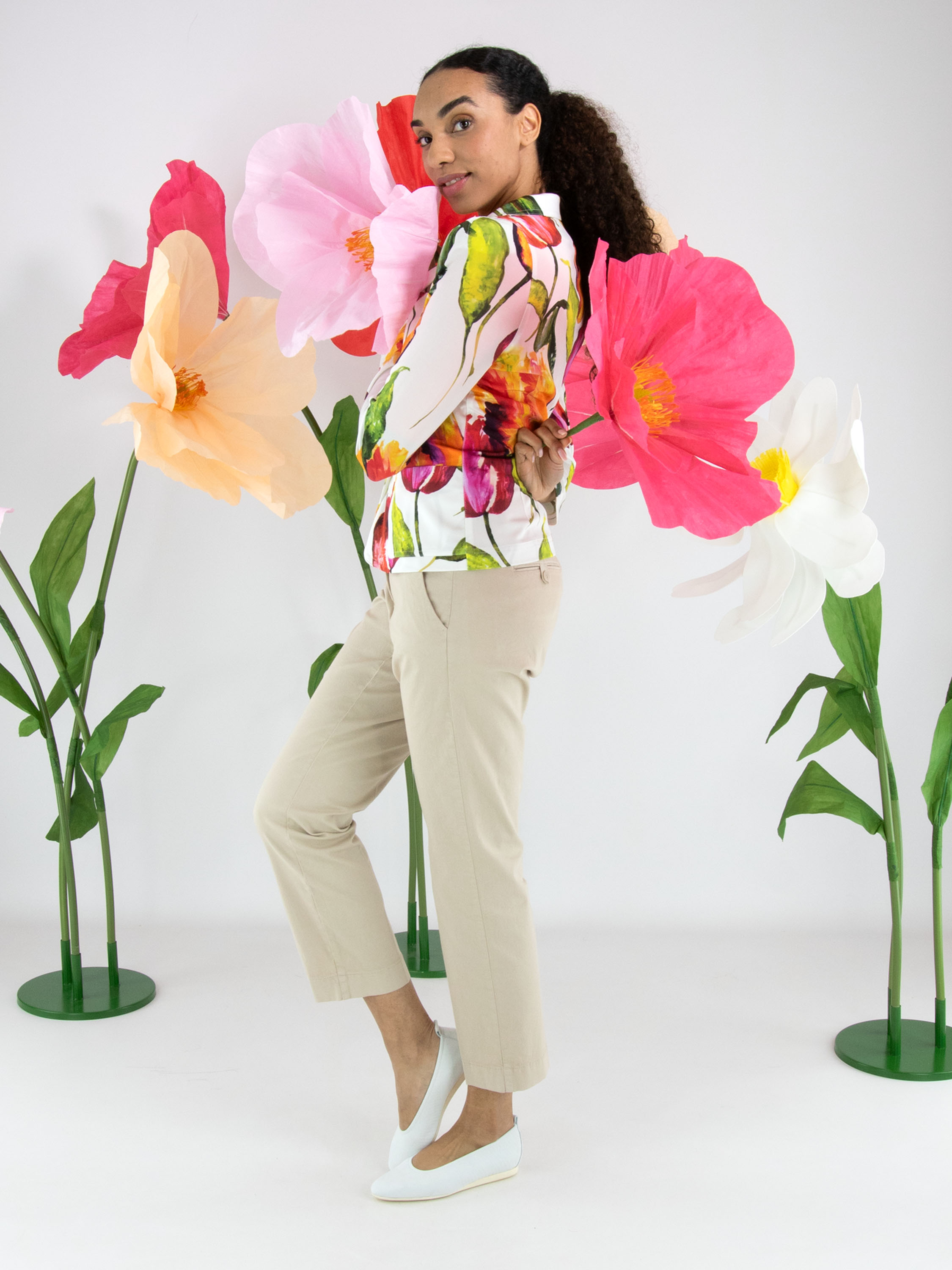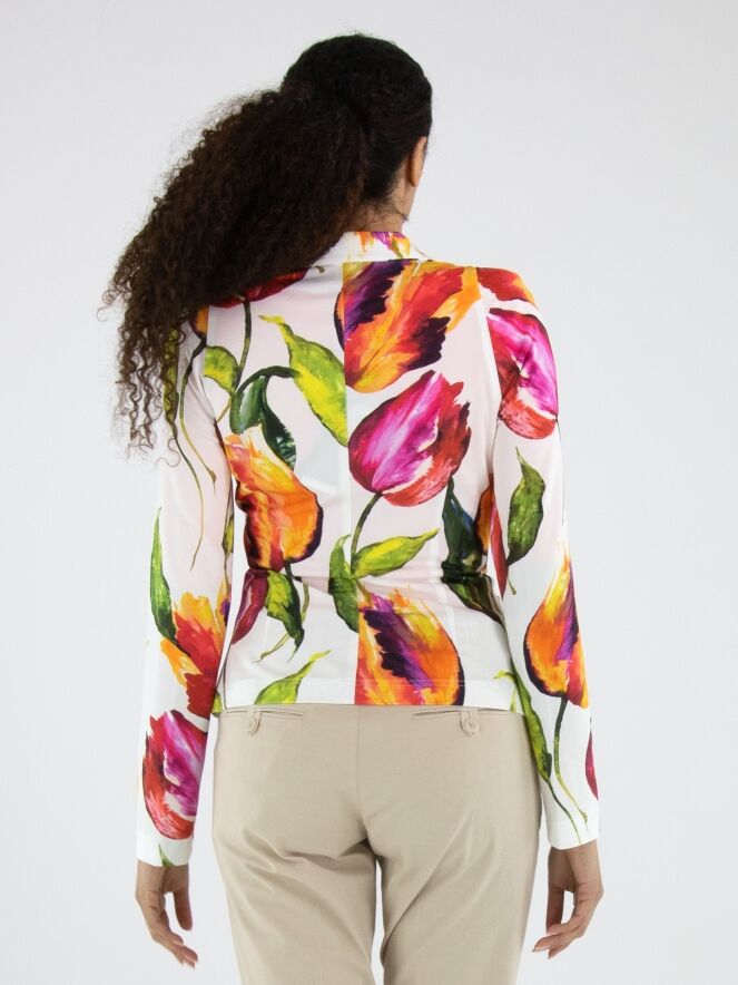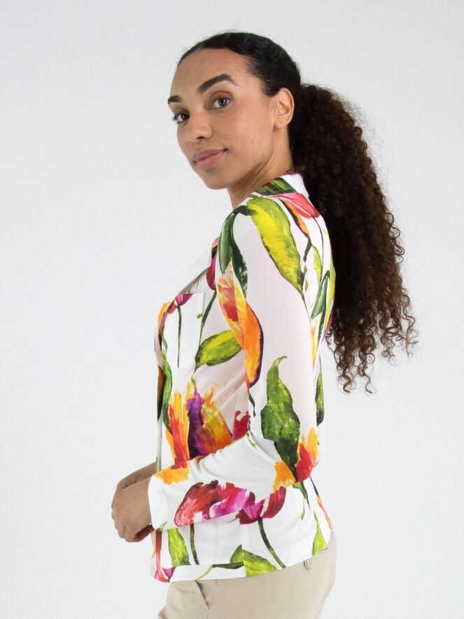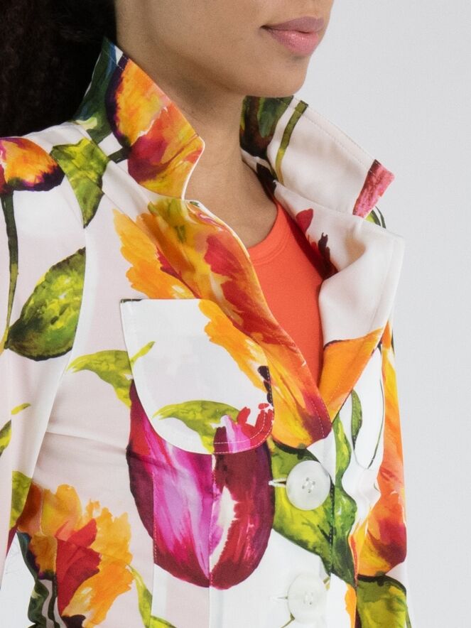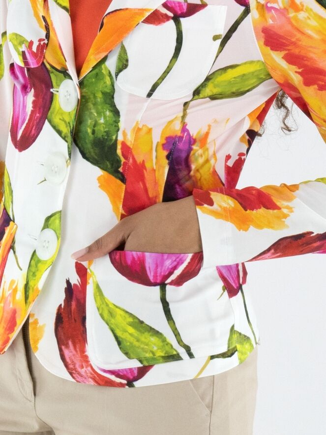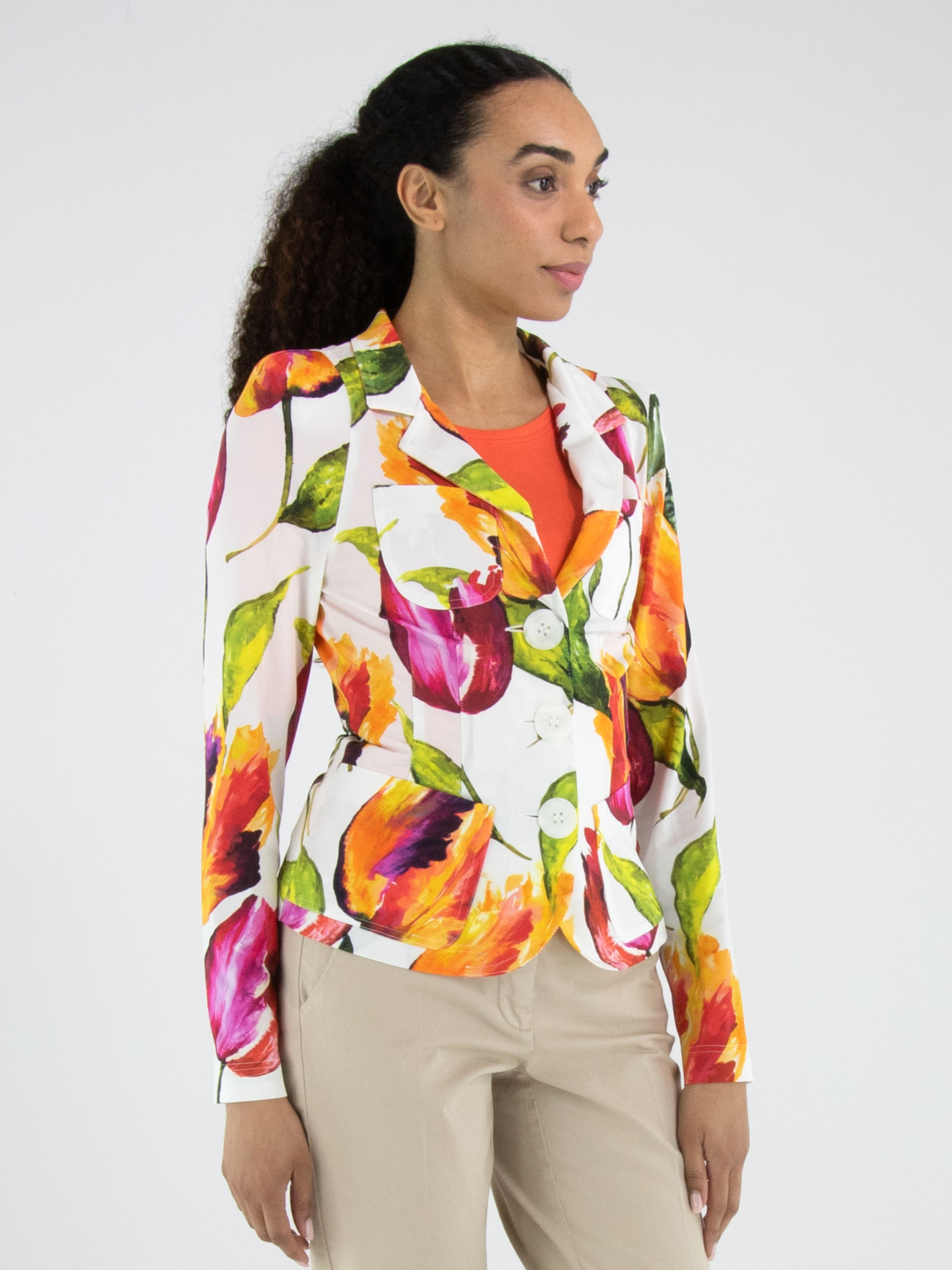 Blazer von ML Collections mit einem mehrfarbigen Tulpenprint auf cremeweißem Grund. Das lebendige Dessin verleiht dem Modell eine ausdrucksstarke und feminine Note. Mit drei Knöpfen zu schließen und ungefüttert gearbeitet, bietet er eine leichte, angenehme Passform. Dieser Blazer darf nicht gewaschen werden.
