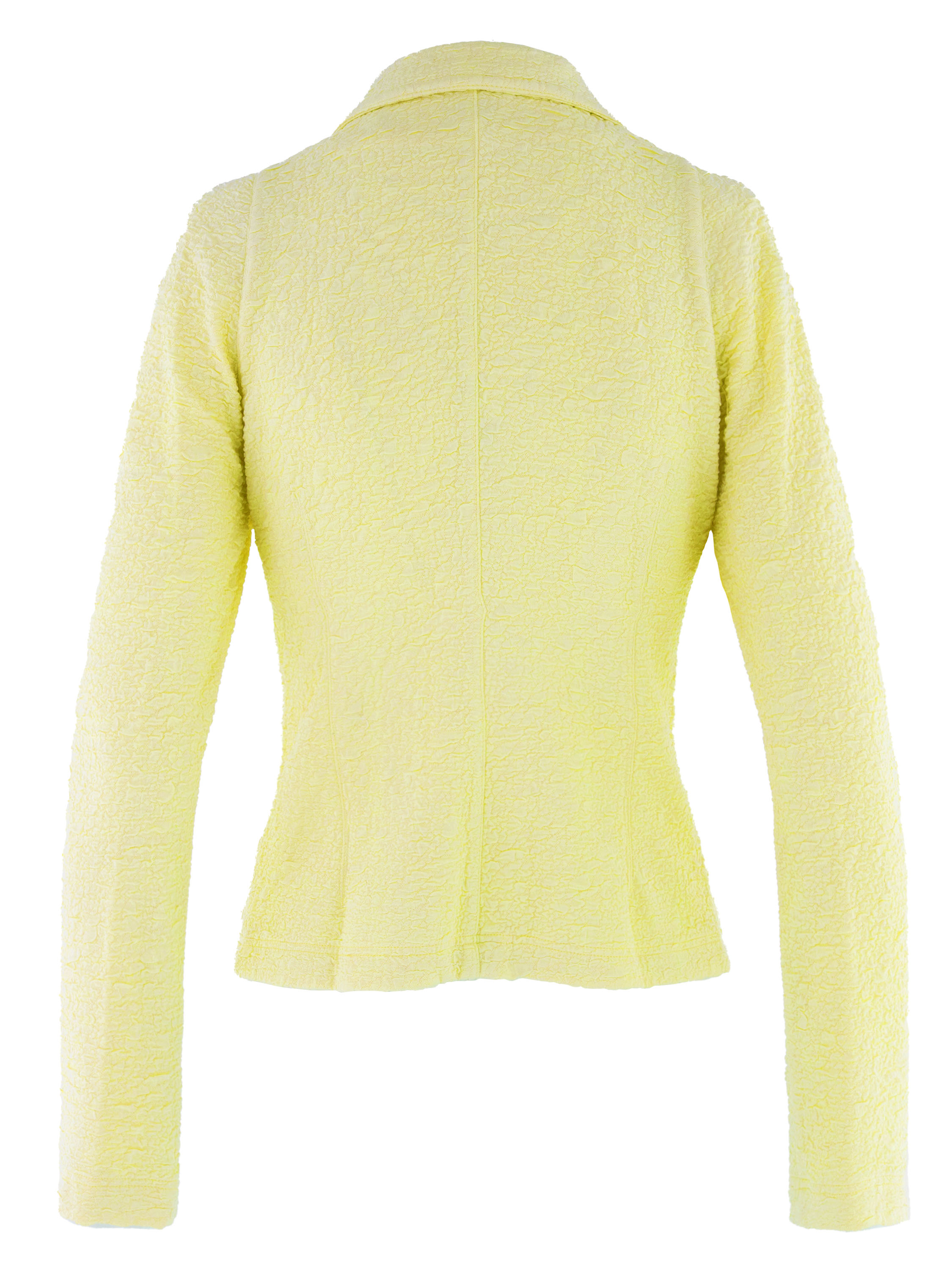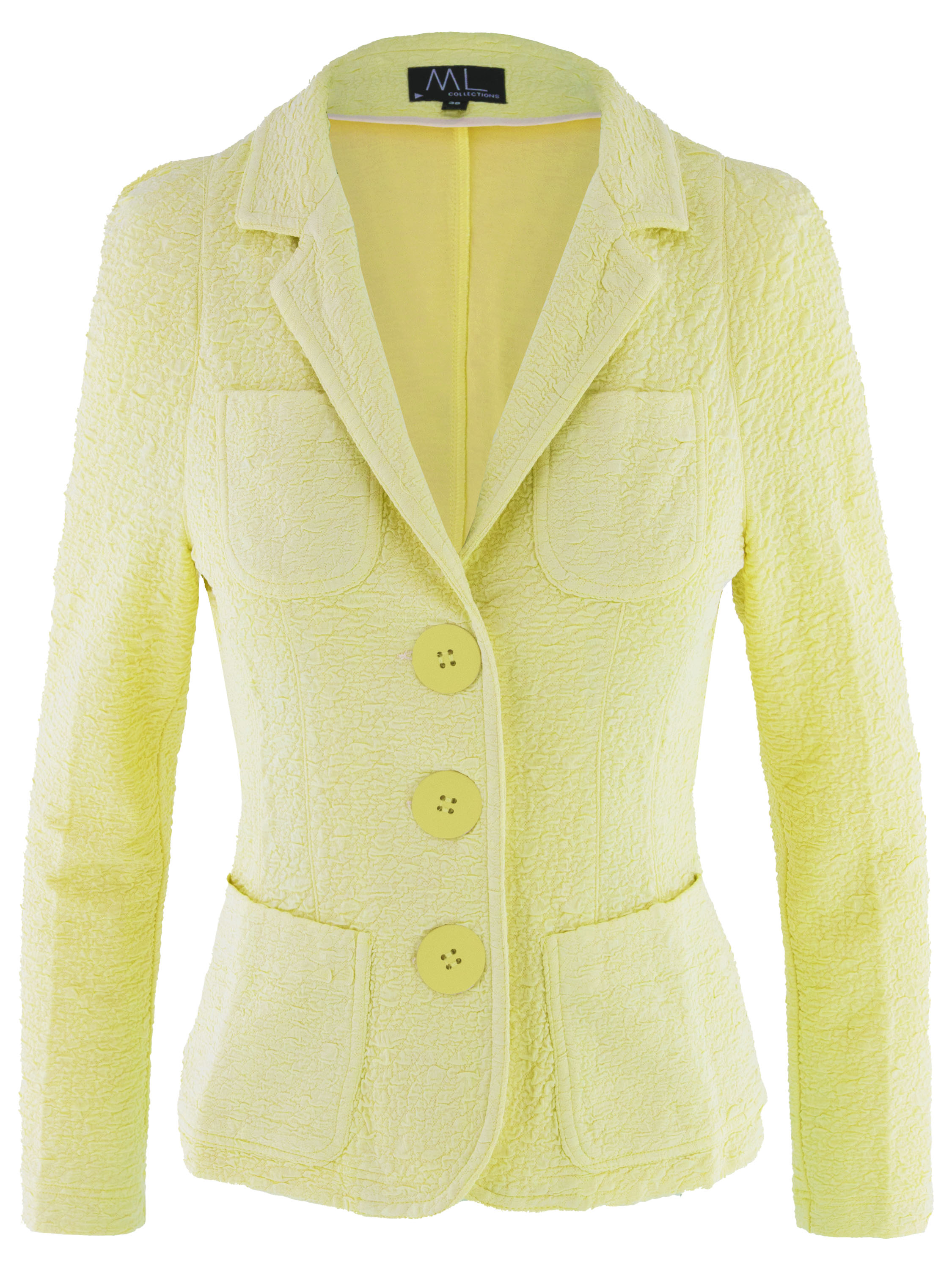 Blazer von ML Collections aus fein gesmoktem Stoff in einem zarten Pastellgelb. Die subtile Struktur verleiht dem Modell eine verspielte und zugleich elegante Ausstrahlung. Mit drei Knöpfen zu schließen und ungefüttert gearbeitet, überzeugt er durch eine leichte, fließende Passform. Dieser Blazer darf nicht gewaschen werden.