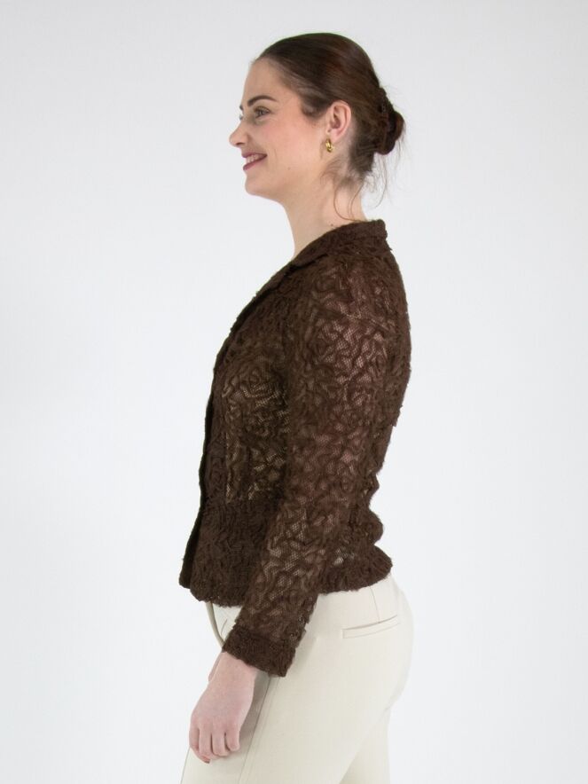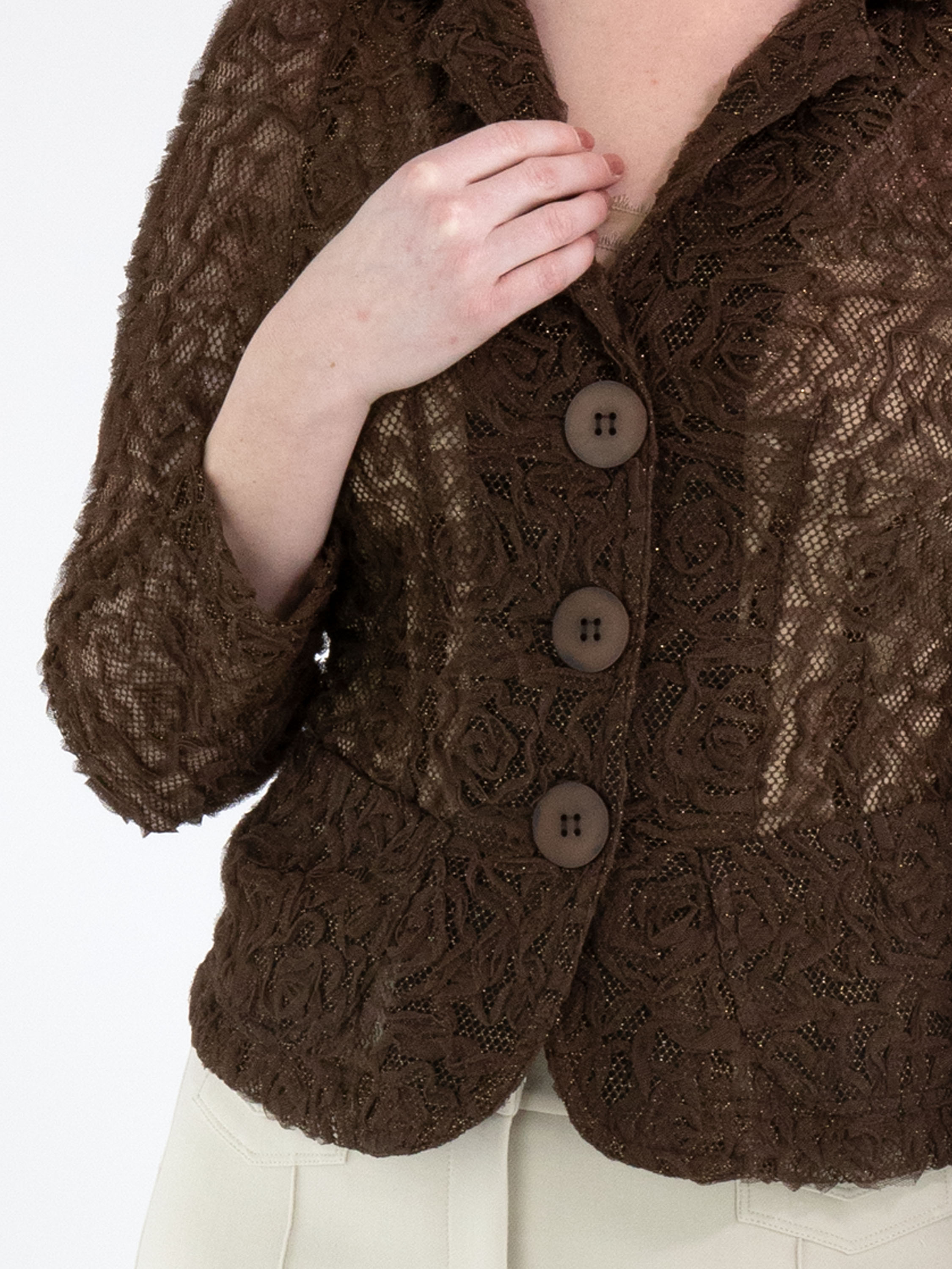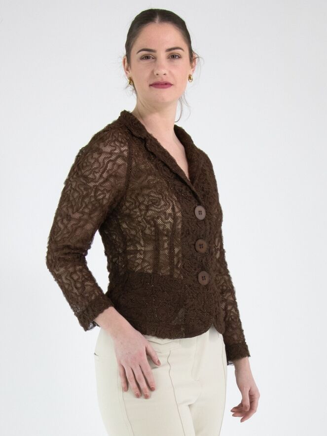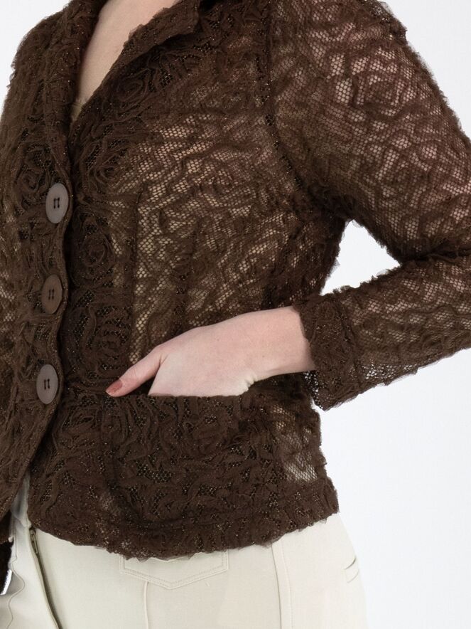 Ein Blazer von ML Collections in Mokkabraun. Der Stoff ist aus Spitze gefertigt und mit einem Goldfaden durchwebt. Der Blazer hat einen Dreiknopfverschluss und ist ungefüttert. Dieser Blazer darf nicht gewaschen werden.