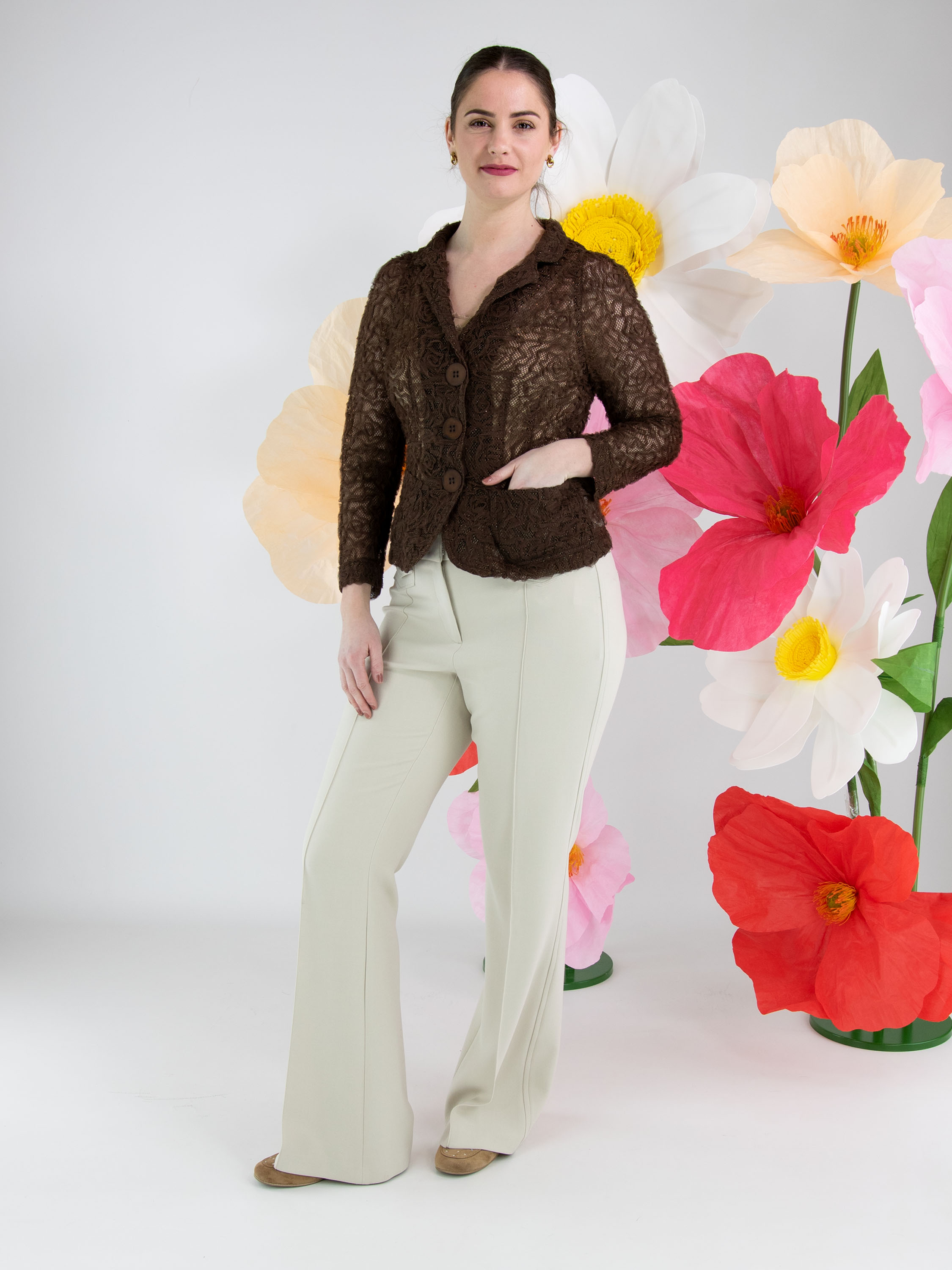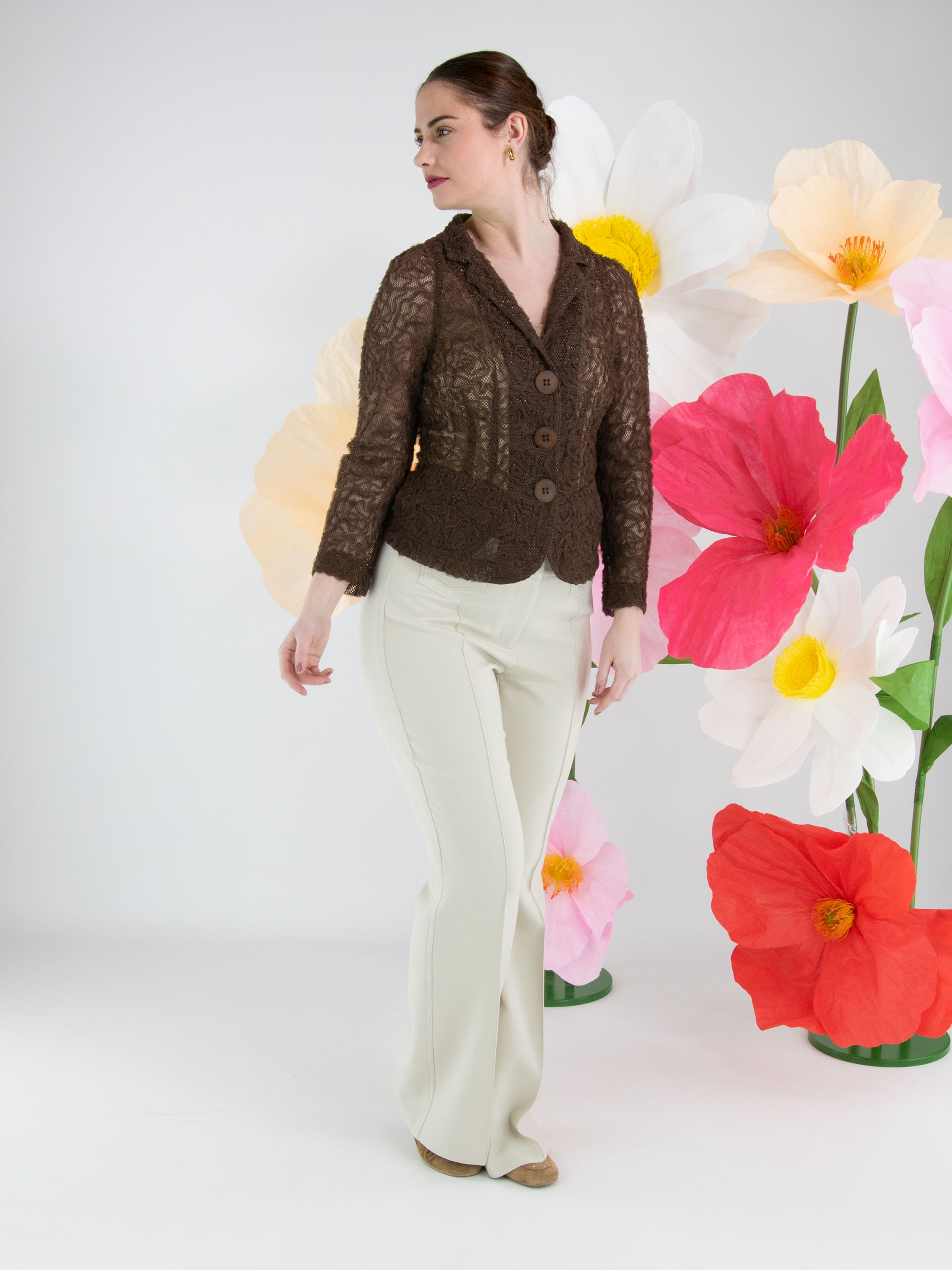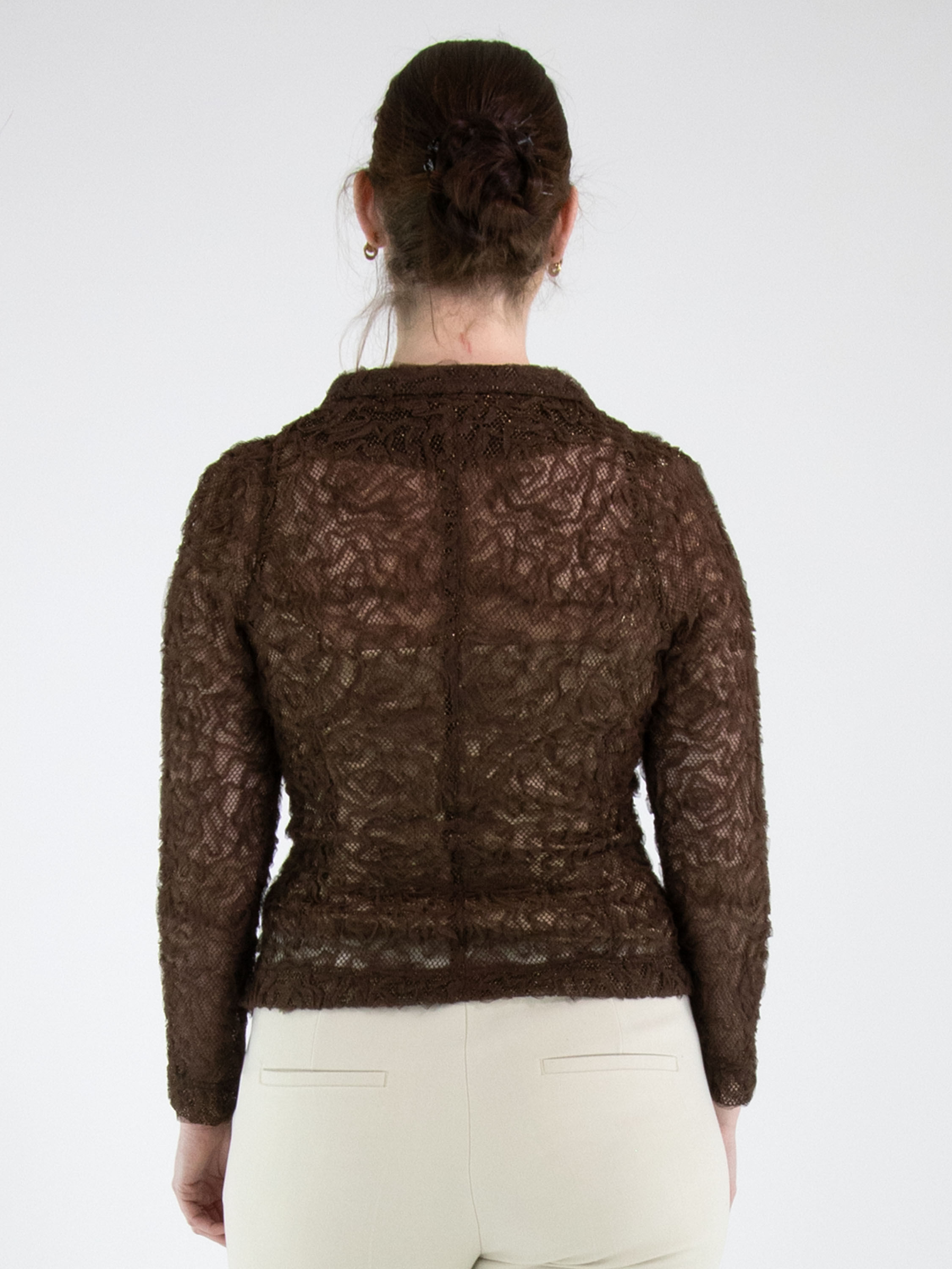 Ein Blazer von ML Collections in Mokkabraun. Der Stoff ist aus Spitze gefertigt und mit einem Goldfaden durchwebt. Der Blazer hat einen Dreiknopfverschluss und ist ungefüttert. Dieser Blazer darf nicht gewaschen werden.