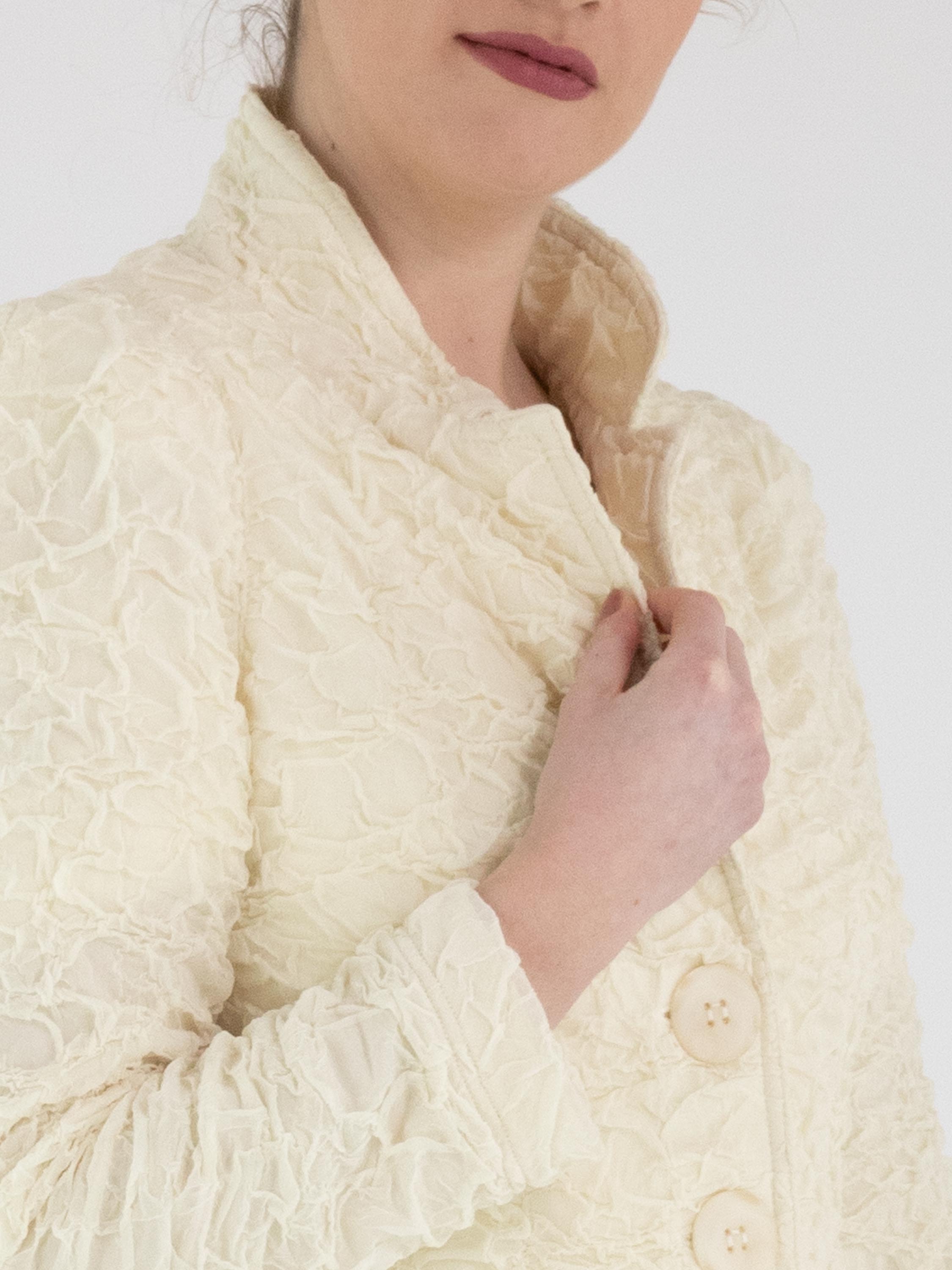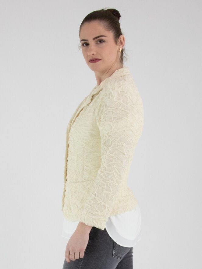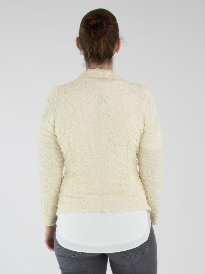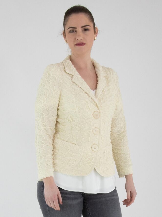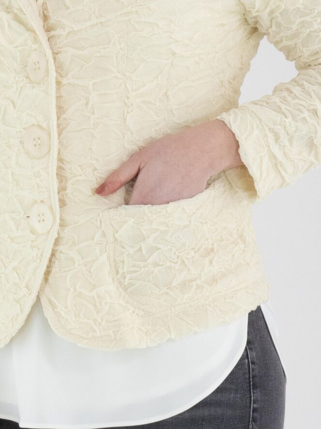Ein Blazer von ML Collections in Cremeweiß. Über dem Grundstoff liegt ein gesmokter Voilestoff in derselben Farbe. Der Blazer hat einen Dreiknopfverschluss und ist ungefüttert. Dieser Blazer darf nicht gewaschen werden.