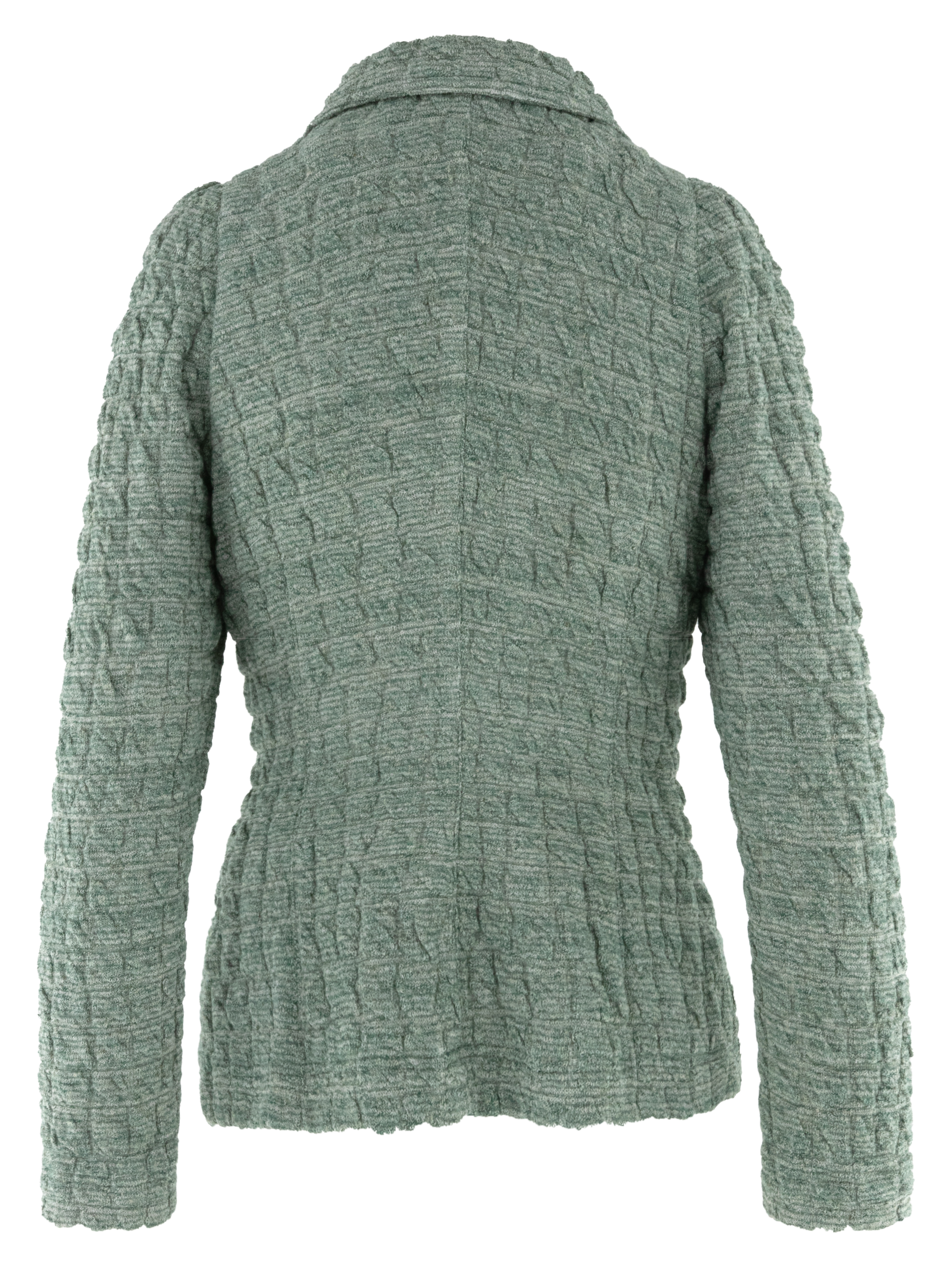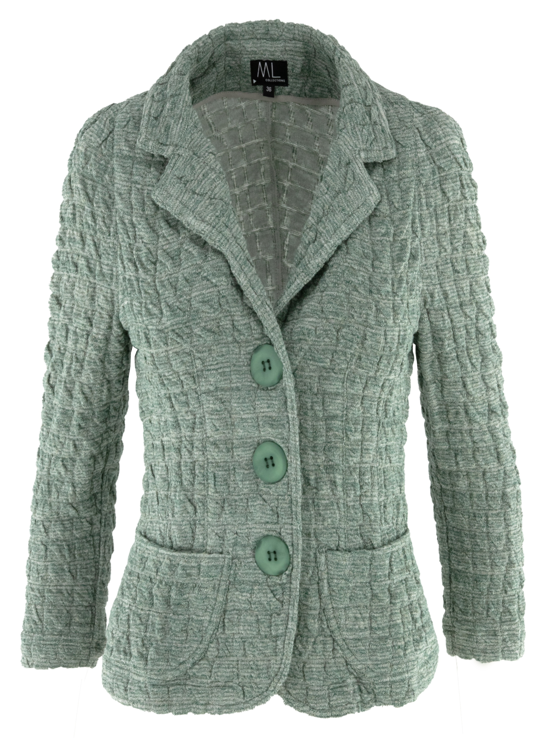 Melierter Blazer von ML Collections in Grüntönen kombiniert mit Cremeweiß. Der Stoff weist eine gesmokte Struktur in einem dezenten Blockmuster auf und verleiht dem Modell eine moderne, lebendige Textur. Mit drei Knöpfen zu schließen und ungefüttert gearbeitet, bietet er eine leichte und angenehme Passform. Dieser Blazer darf nicht gewaschen werden.