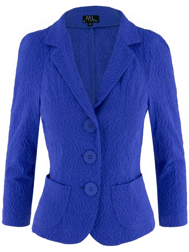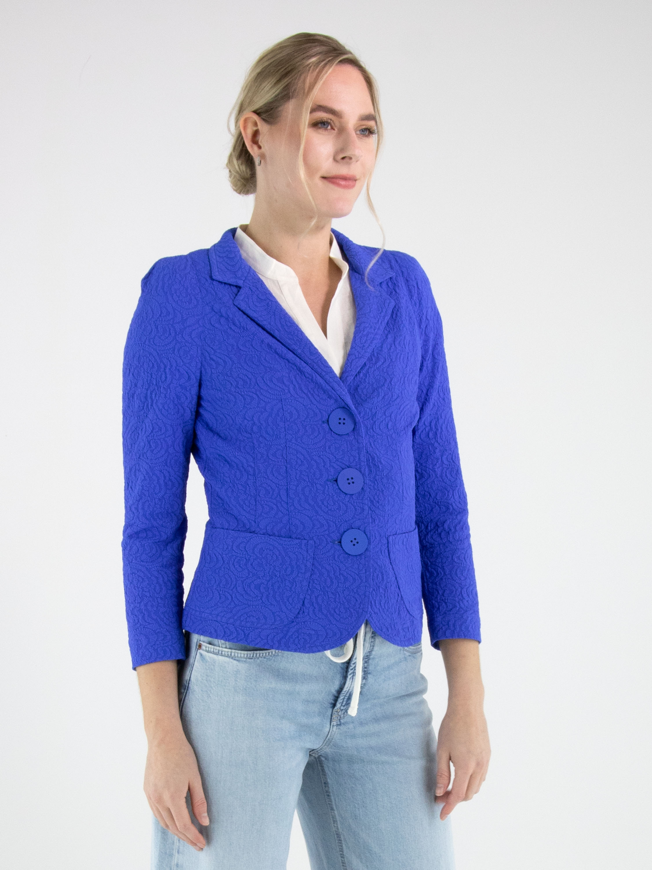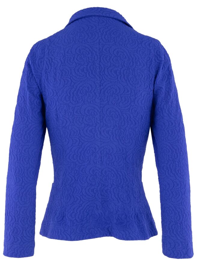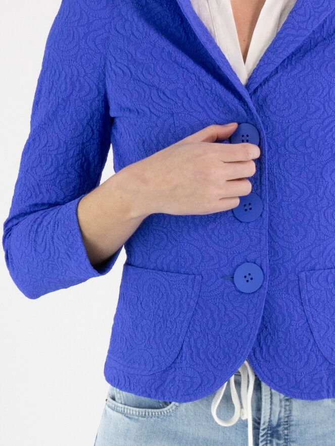 Blazer von ML Collections in einem intensiven Kobaltblau. Der Stoff ist mit einem Ton-in-Ton Relief-Jacquard versehen und verleiht dem Modell eine dezente Tiefe sowie eine luxuriöse Ausstrahlung. Mit drei Knöpfen zu schließen und ungefüttert gearbeitet, fällt er leicht und geschmeidig. Dieser Blazer darf nicht gewaschen werden.