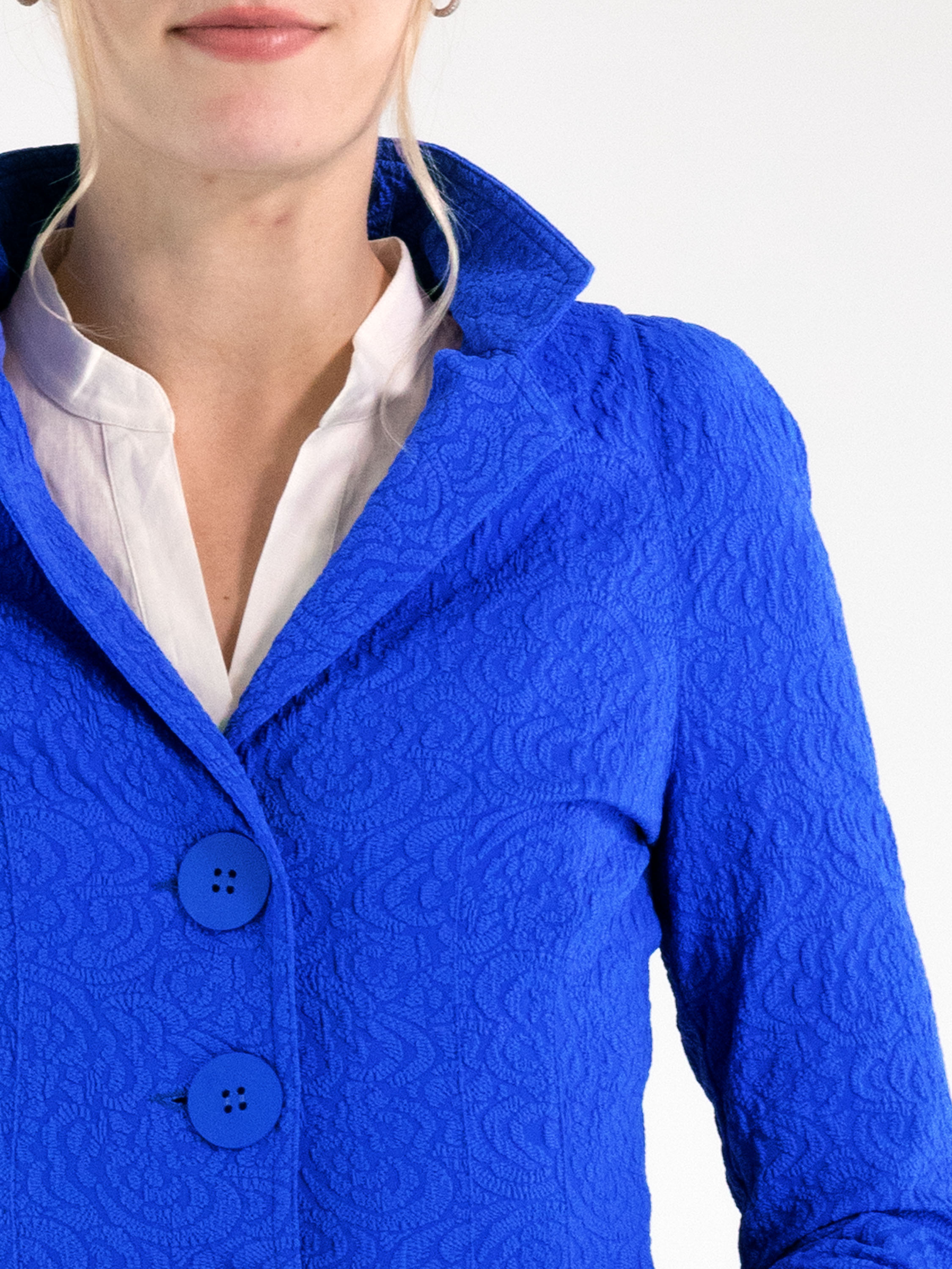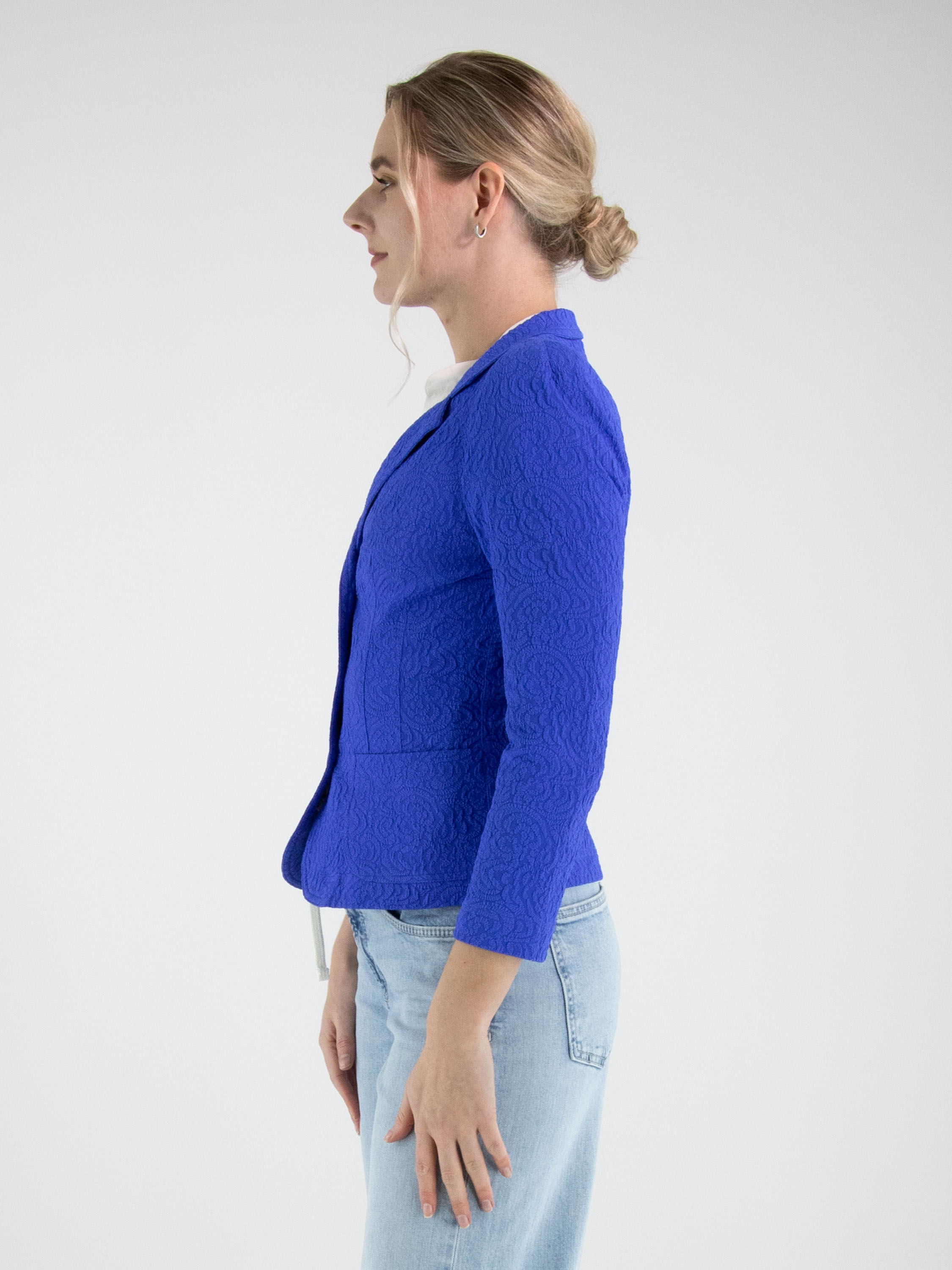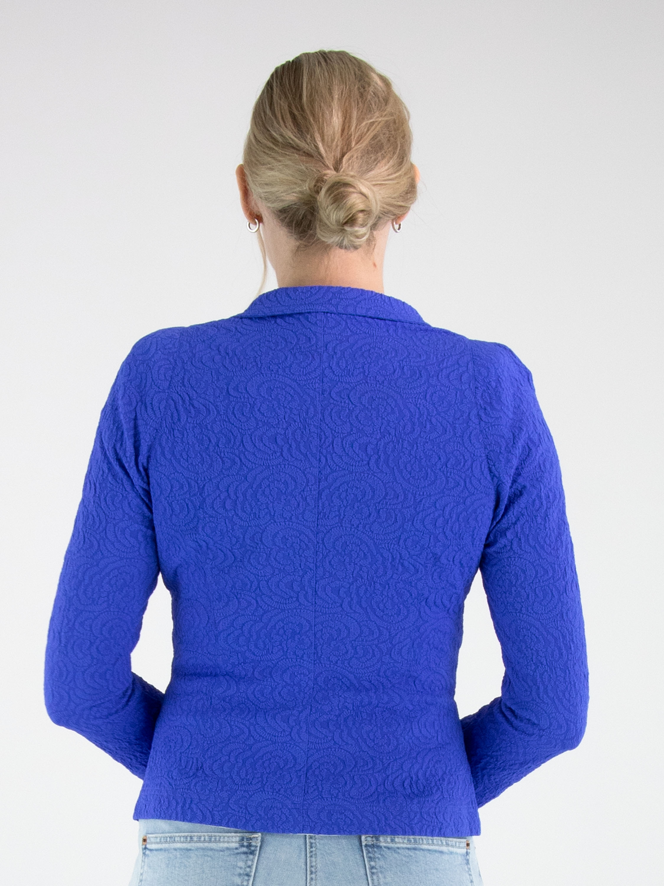 Blazer von ML Collections in einem intensiven Kobaltblau. Der Stoff ist mit einem Ton-in-Ton Relief-Jacquard versehen und verleiht dem Modell eine dezente Tiefe sowie eine luxuriöse Ausstrahlung. Mit drei Knöpfen zu schließen und ungefüttert gearbeitet, fällt er leicht und geschmeidig. Dieser Blazer darf nicht gewaschen werden.