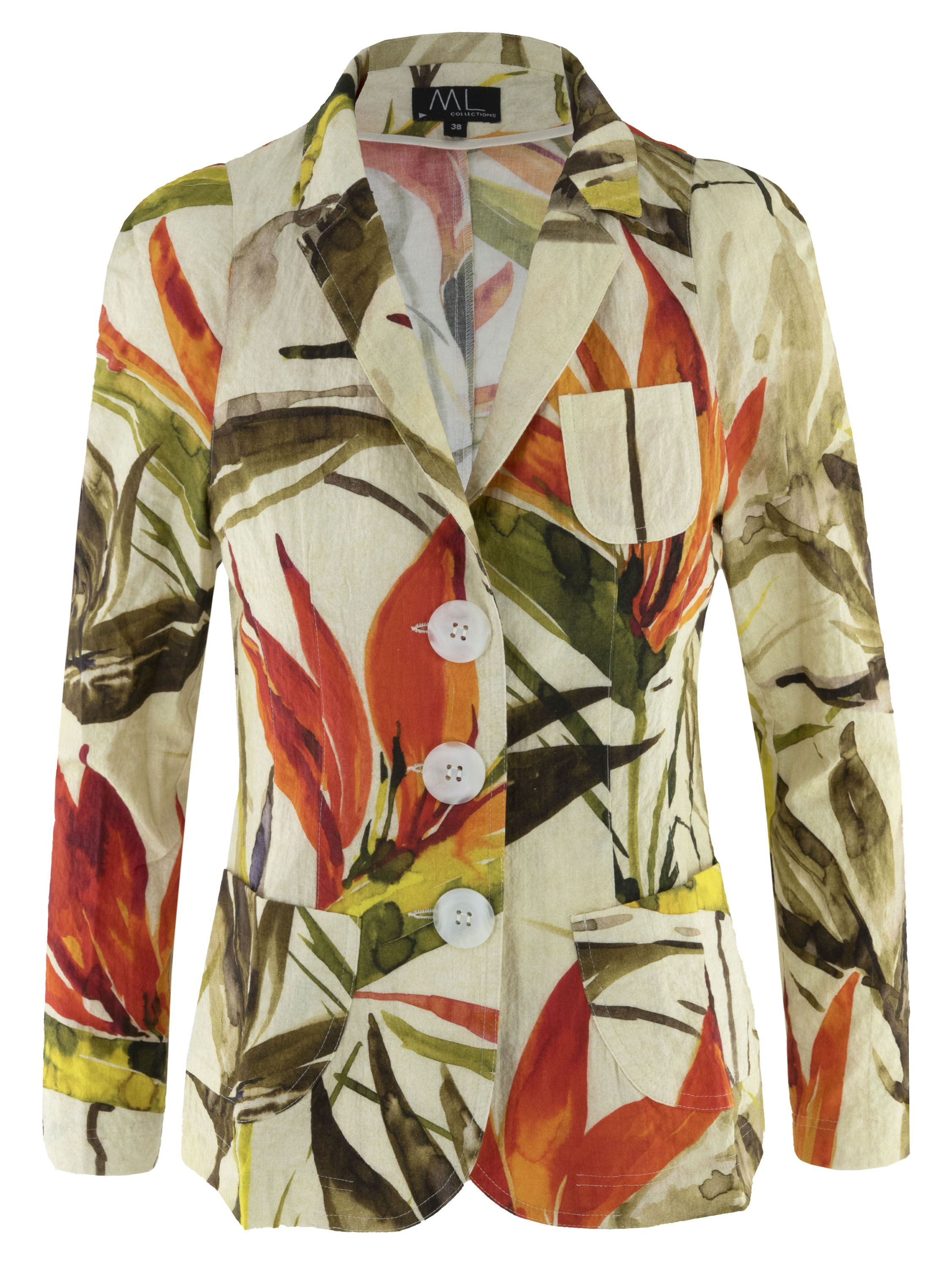 Ein Blazer von ML Collections mit einem Blumen- und Blätterprint in Rot, Orange und mehreren Grüntönen auf beigefarbenem Hintergrund. Der Blazer hat einen Dreiknopfverschluss und ist ungefüttert. Dieser Blazer darf nicht gewaschen werden.
