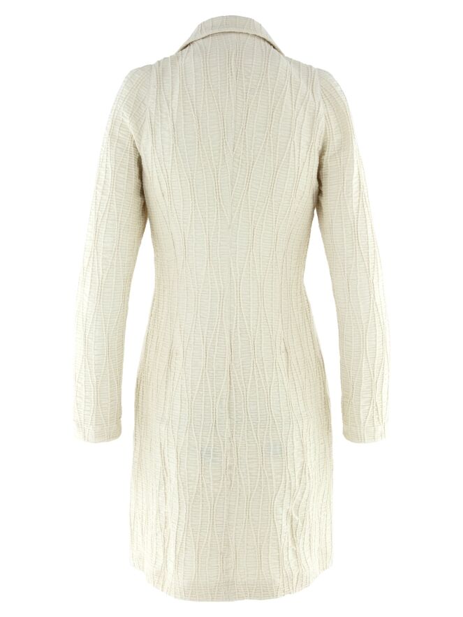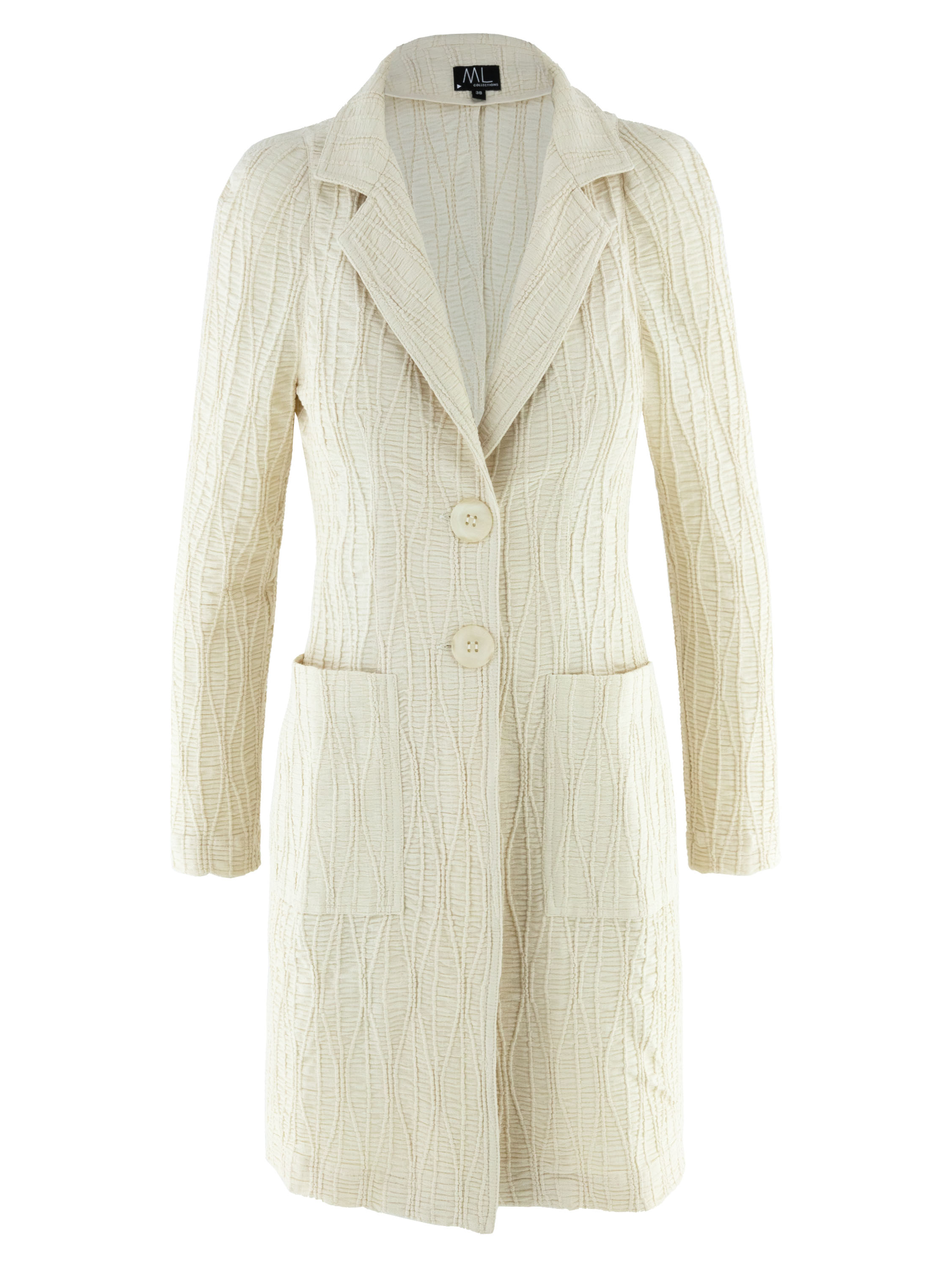 Ein langer Blazer von ML Collections in Beige. Der Stoff ist horizontal gesmokt und mit darüberliegenden, wellenförmigen vertikalen Linien gestaltet. Der Blazer hat einen Zweiknopfverschluss und ist ungefüttert. Dieser Blazer darf nicht gewaschen werden.