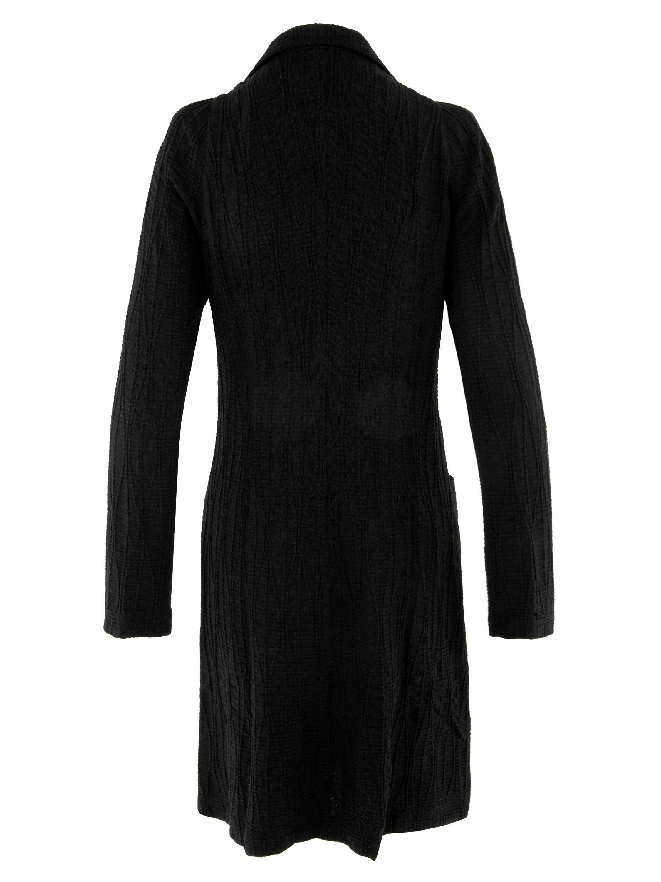 Ein langer Blazer von ML Collections in Schwarz. Der Stoff ist horizontal gesmokt und mit darüberliegenden, wellenförmigen vertikalen Linien gestaltet. Der Blazer hat einen Zweiknopfverschluss und ist ungefüttert. Dieser Blazer darf nicht gewaschen werden.