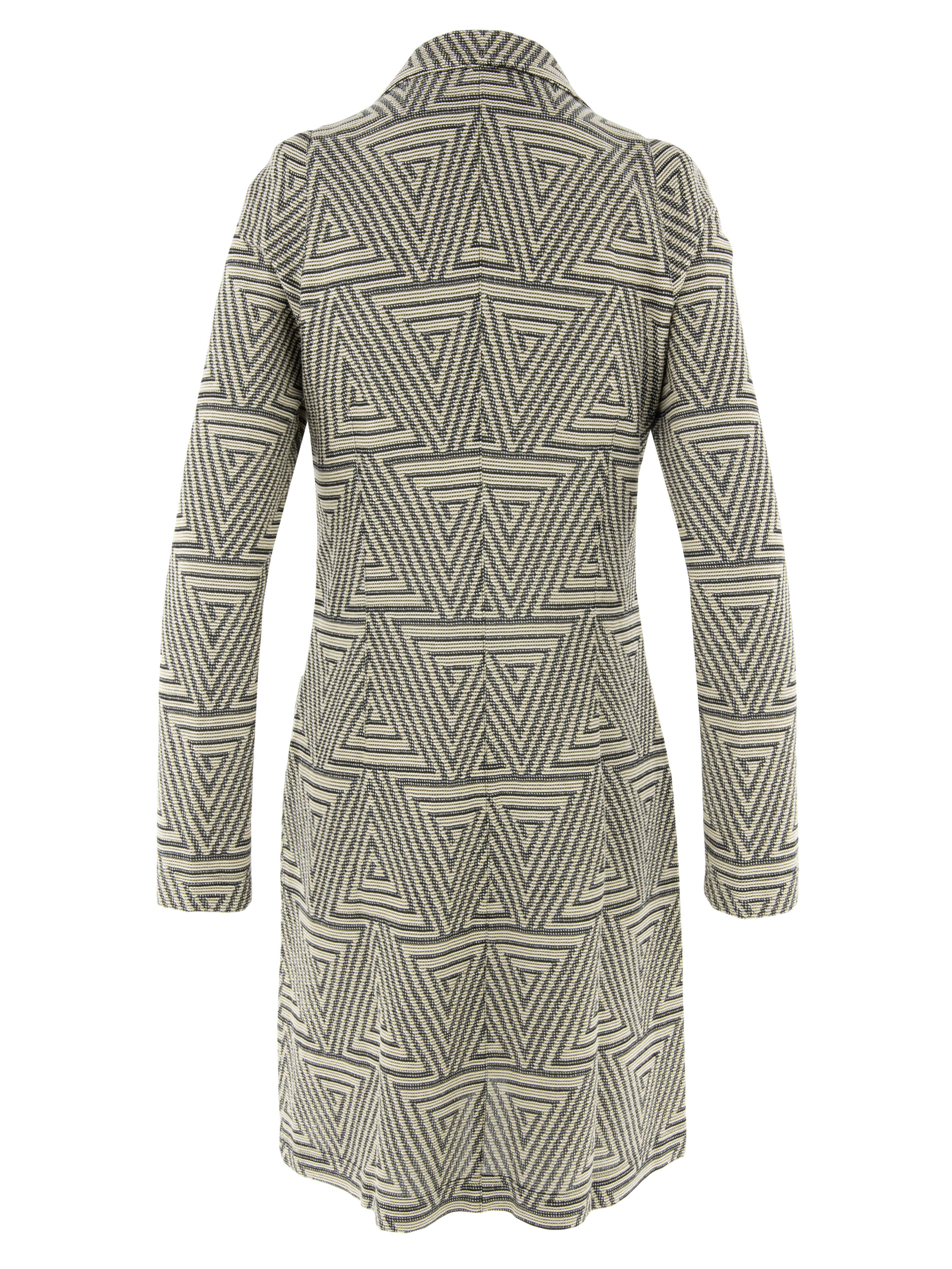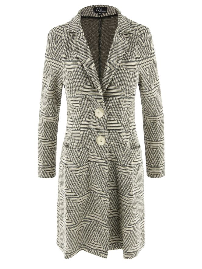 Ein langer Blazer von ML Collections mit einem Mosaikprint in Schwarz und Beige. Der Blazer hat einen Zweiknopfverschluss und ist ungefüttert. Dieser Blazer darf niet gewaschen werden.