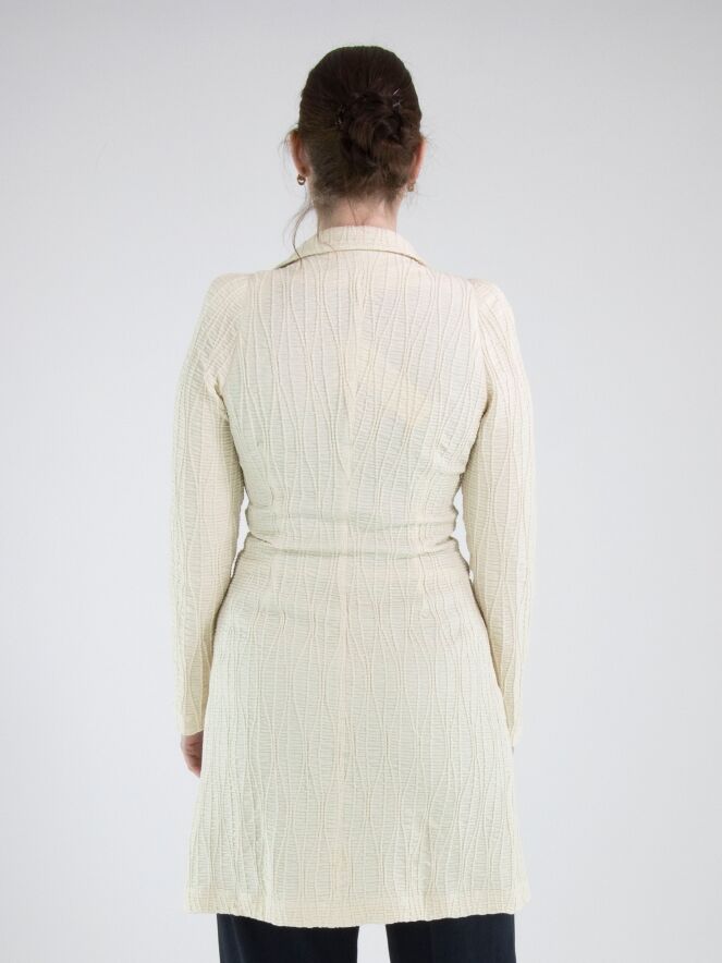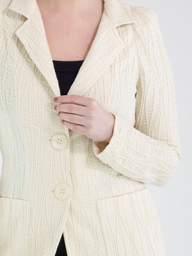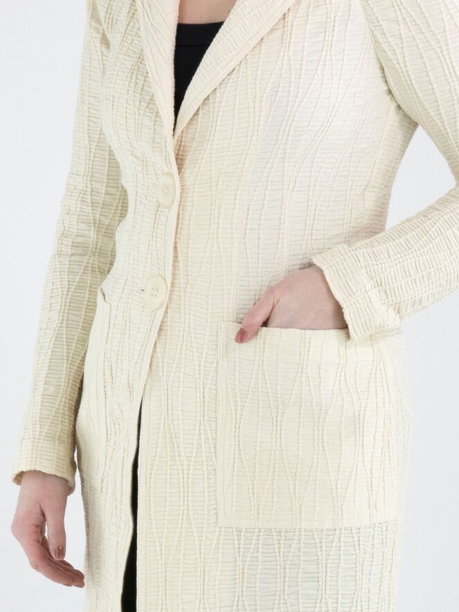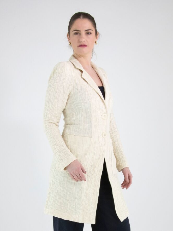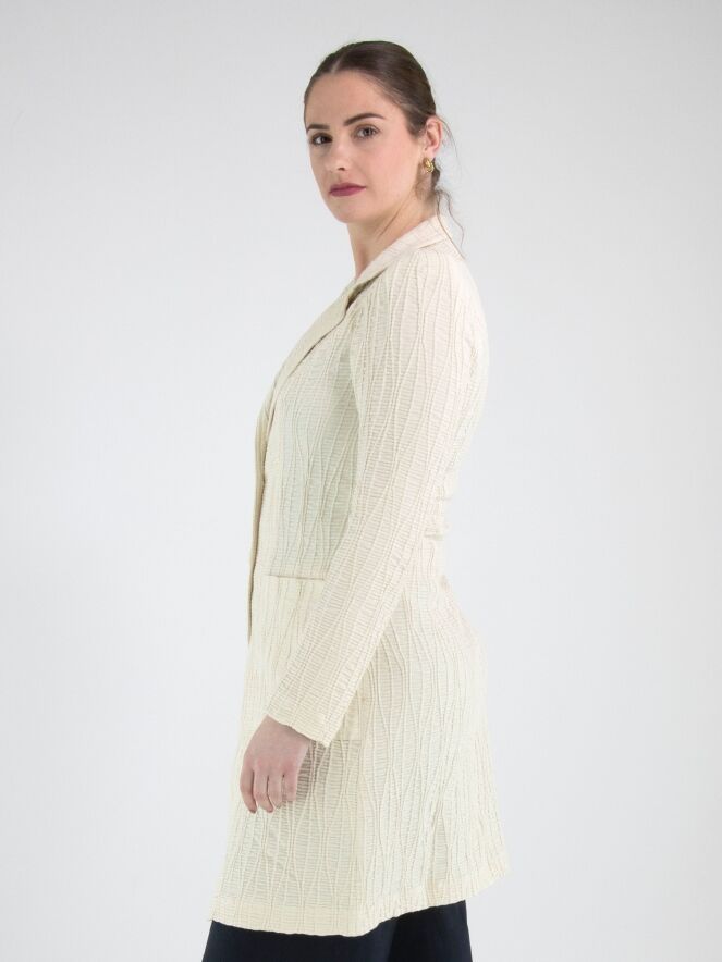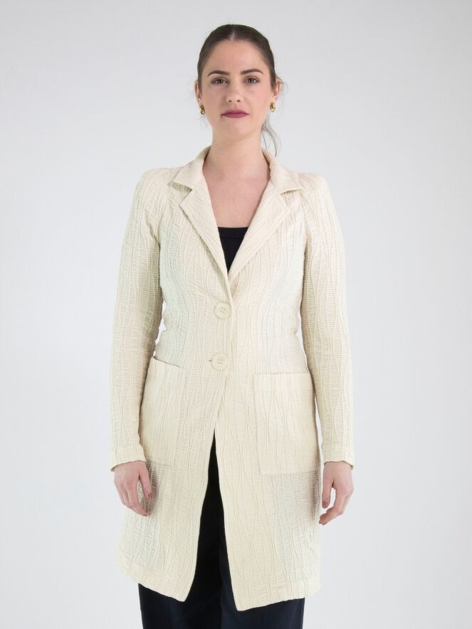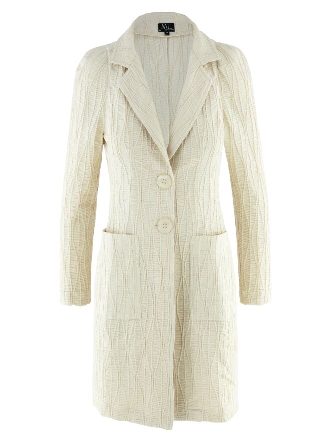 Ein langer Blazer von ML Collections in Beige. Der Stoff ist horizontal gesmokt und mit darüberliegenden, wellenförmigen vertikalen Linien gestaltet. Der Blazer hat einen Zweiknopfverschluss und ist ungefüttert. Dieser Blazer darf nicht gewaschen werden.