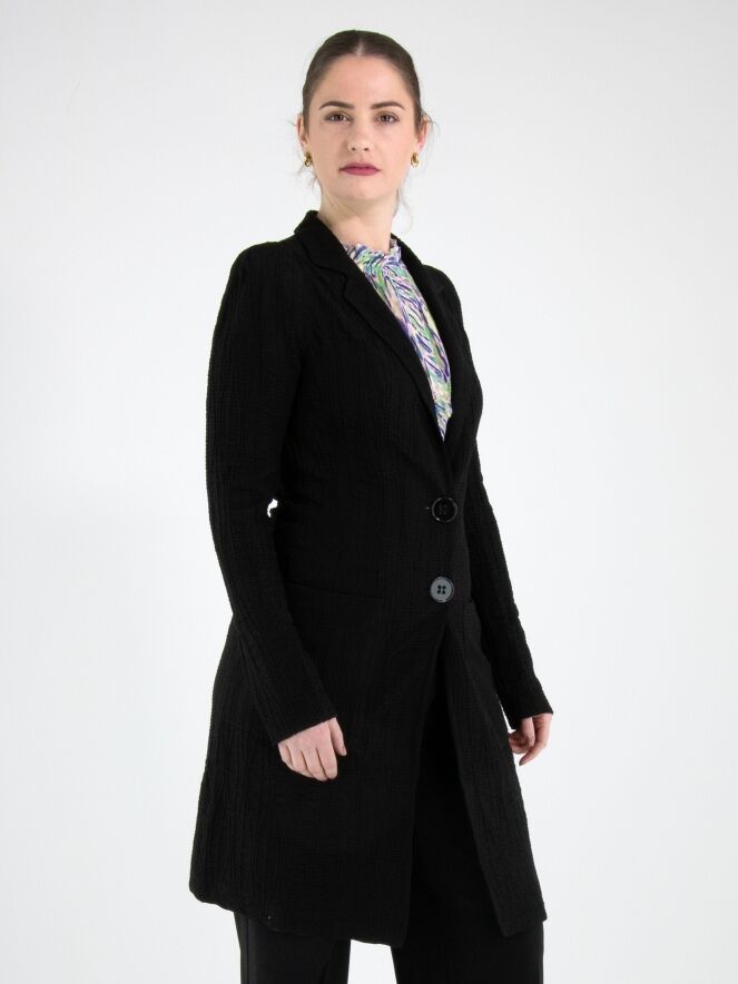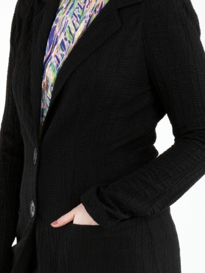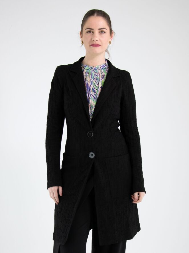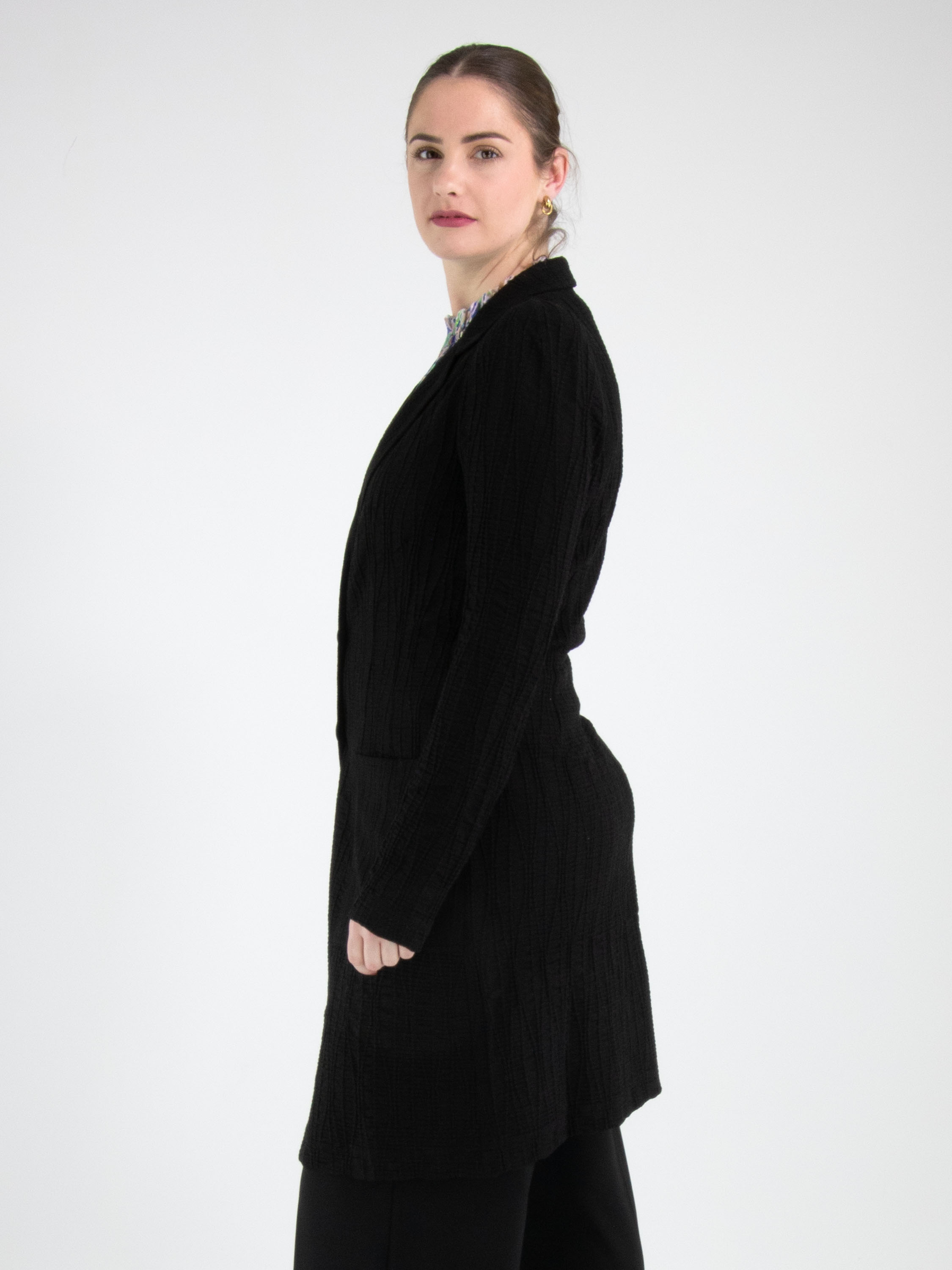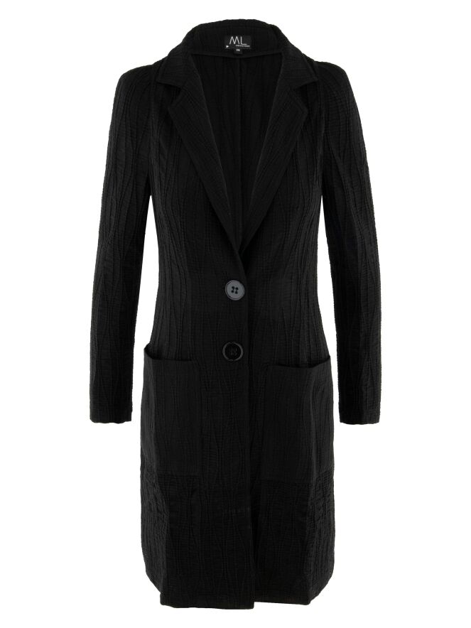 Ein langer Blazer von ML Collections in Schwarz. Der Stoff ist horizontal gesmokt und mit darüberliegenden, wellenförmigen vertikalen Linien gestaltet. Der Blazer hat einen Zweiknopfverschluss und ist ungefüttert. Dieser Blazer darf nicht gewaschen werden.