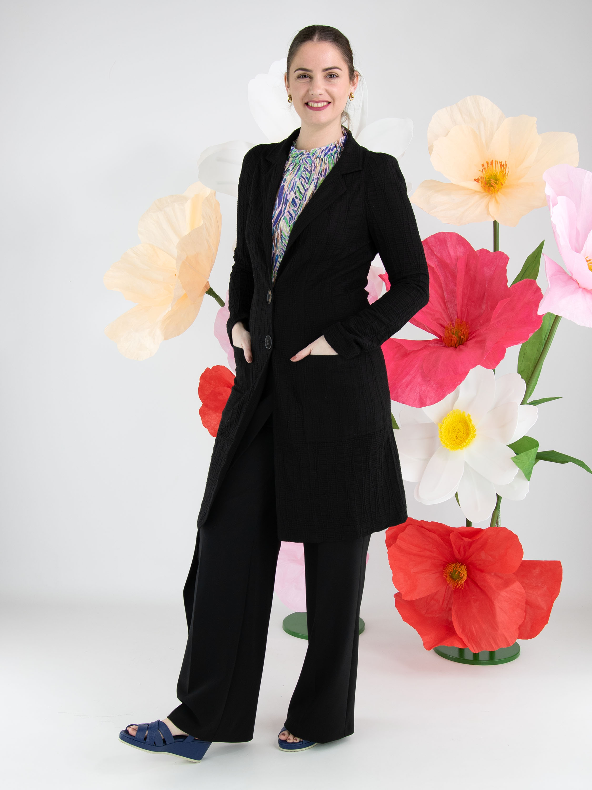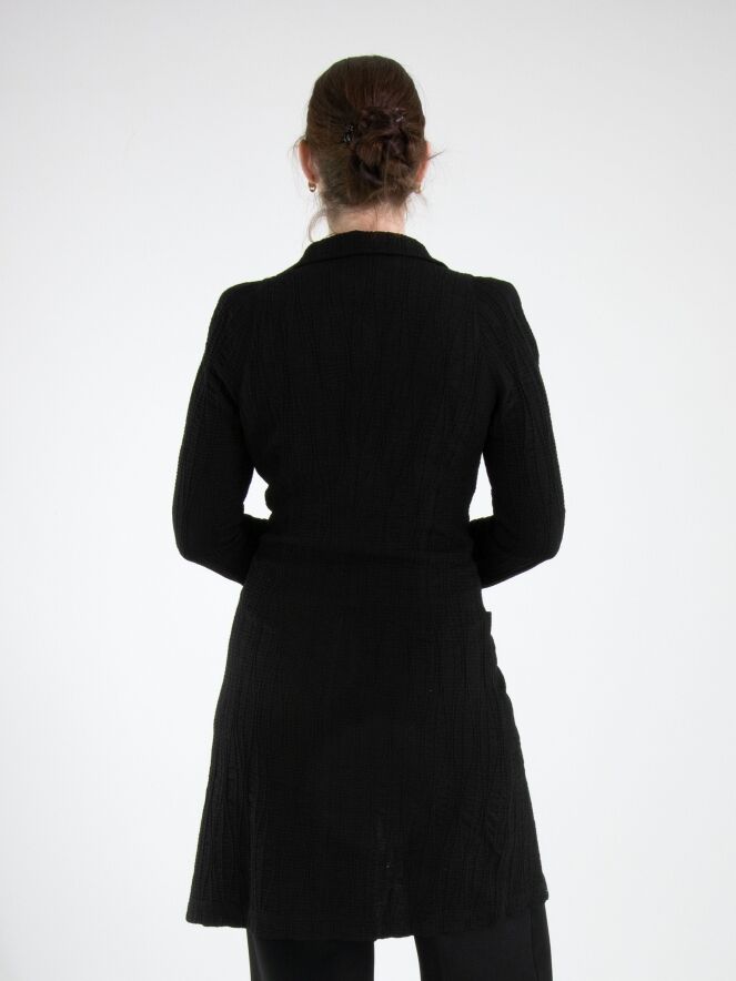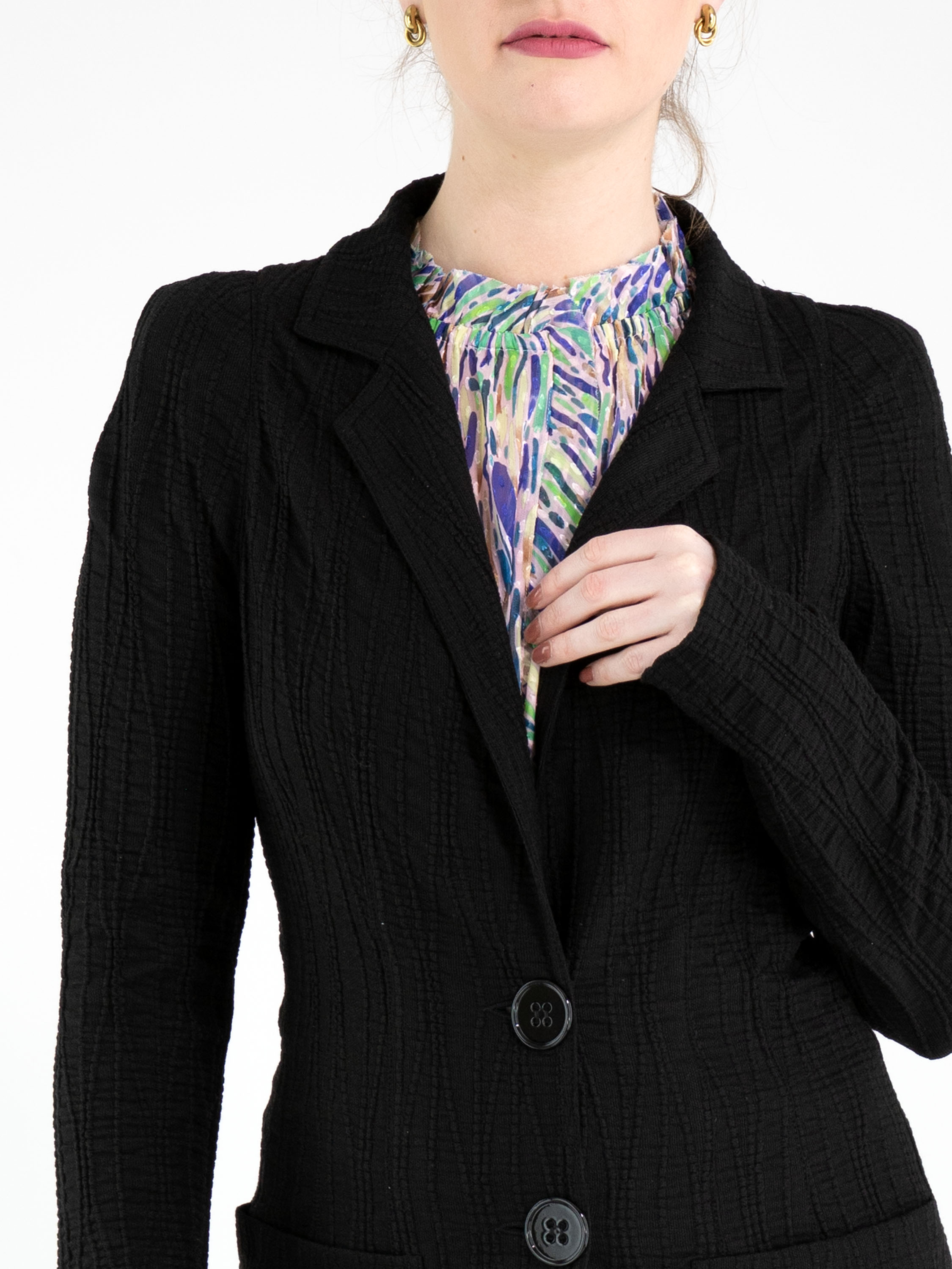 Ein langer Blazer von ML Collections in Schwarz. Der Stoff ist horizontal gesmokt und mit darüberliegenden, wellenförmigen vertikalen Linien gestaltet. Der Blazer hat einen Zweiknopfverschluss und ist ungefüttert. Dieser Blazer darf nicht gewaschen werden.