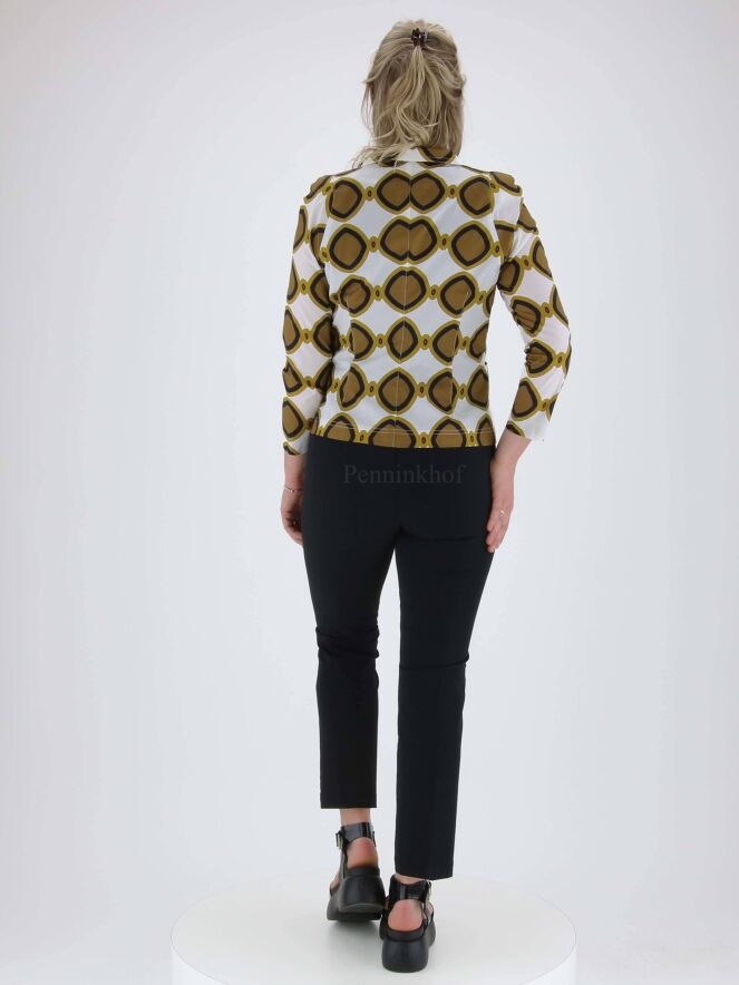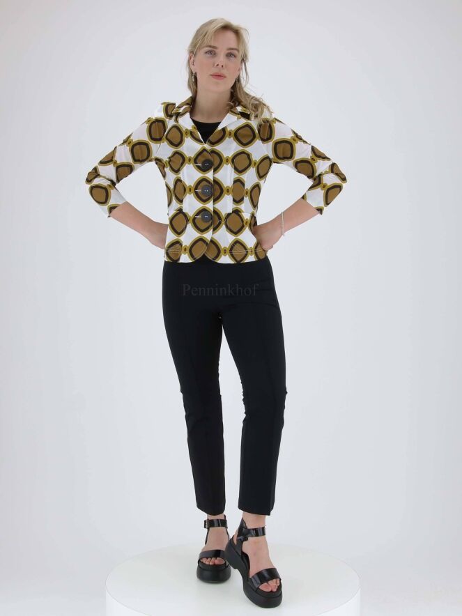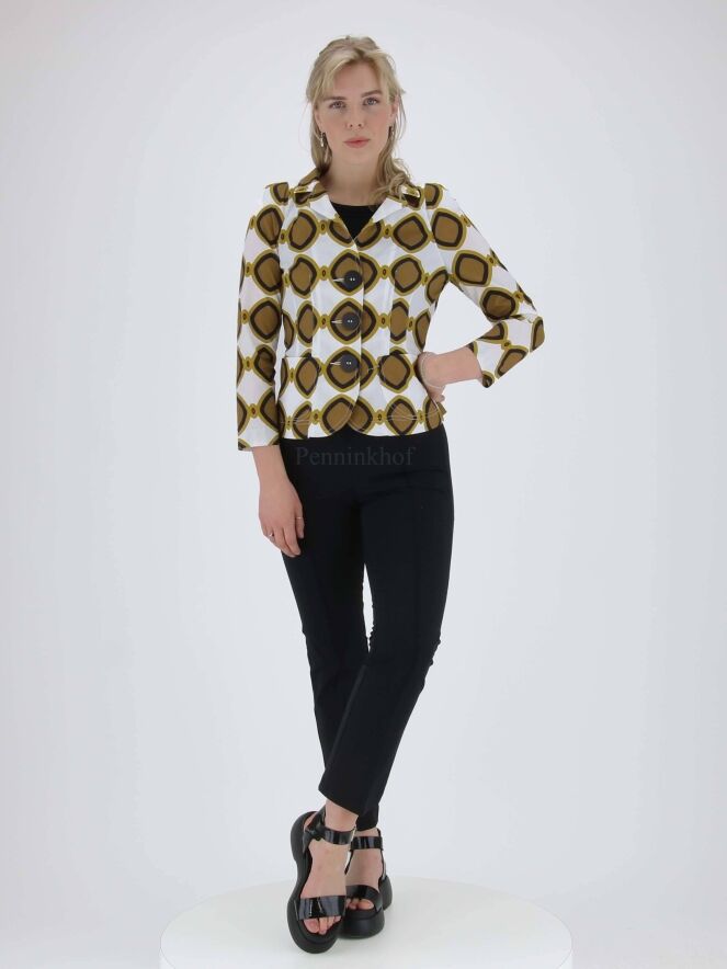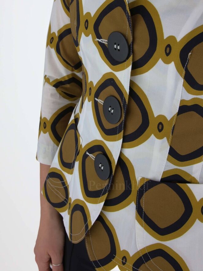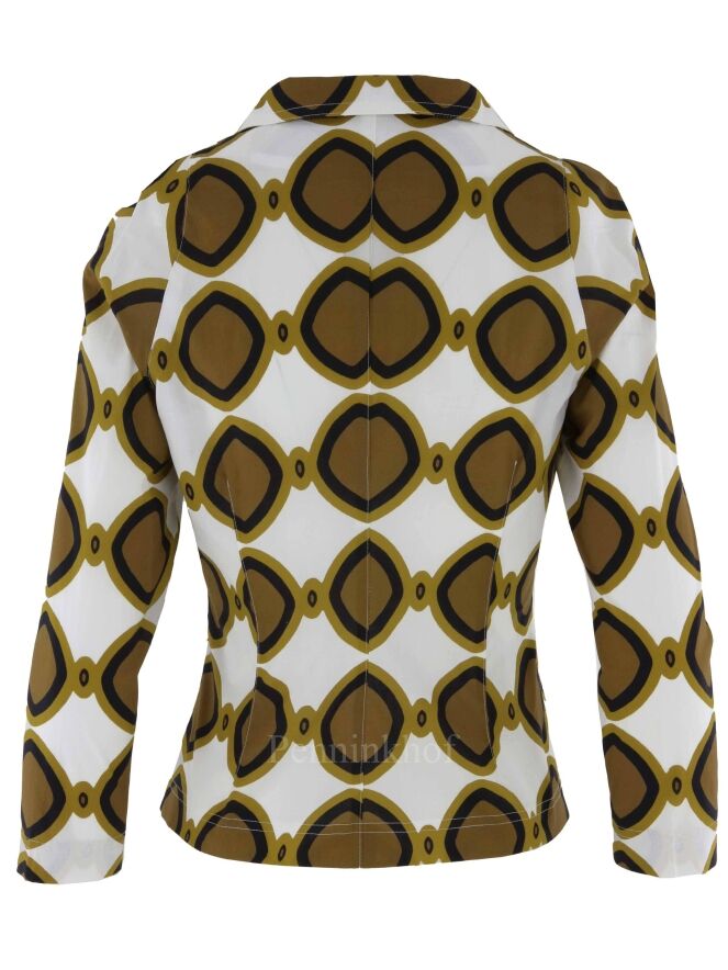 Ein Blazer der Designermarke ML Collections mit aufgedruckten aneinandergereihten Kreisen in Olivgrün, Schwarz und Camel auf weißem Grund. Der Blazer wird mit drei Knöpfen geschlossen und ist nicht gefüttert. Dieser Blazer darf nicht gewaschen werden.