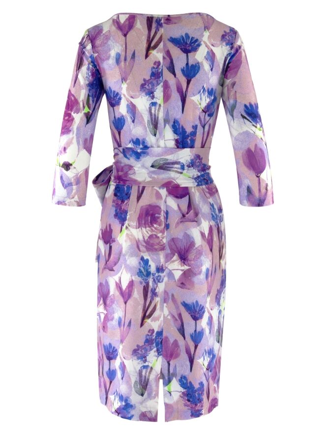 Ein Kleid von Moq mit einem grafischen Blumenprint in mehreren Lila-, Rosa-, Blau- und Weißtönen. Das Kleid hat einen weiten Rundhalsausschnitt und einen Gürtel aus dem gleichen Stoff auf Taillenhöhe. Es ist ungefüttert und verfügt über halblange Ärmel. Dieses Kleid kann bei 40 Grad gewaschen werden.