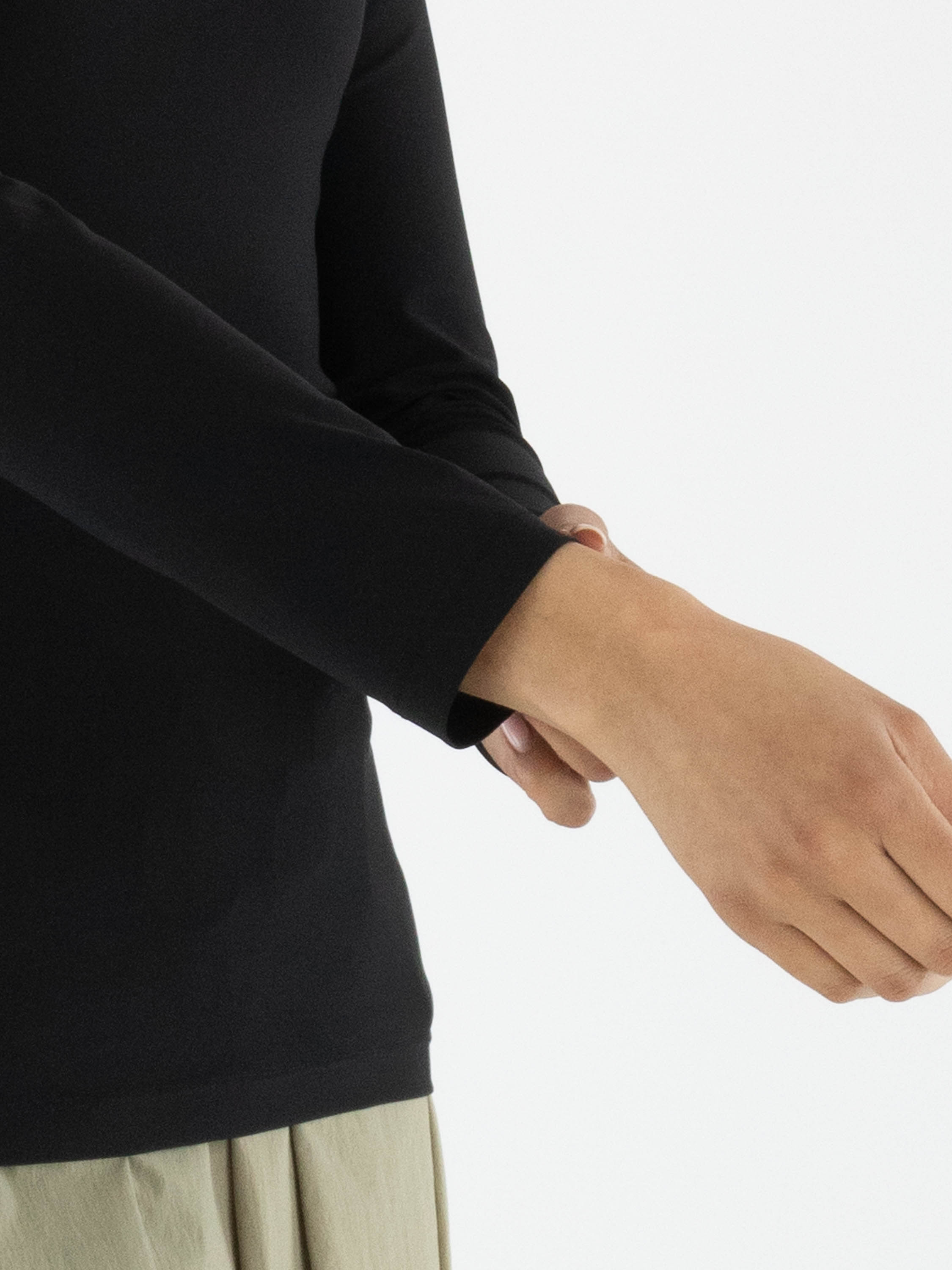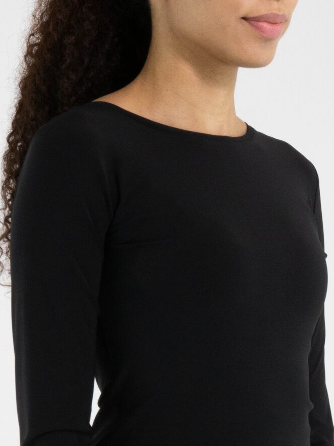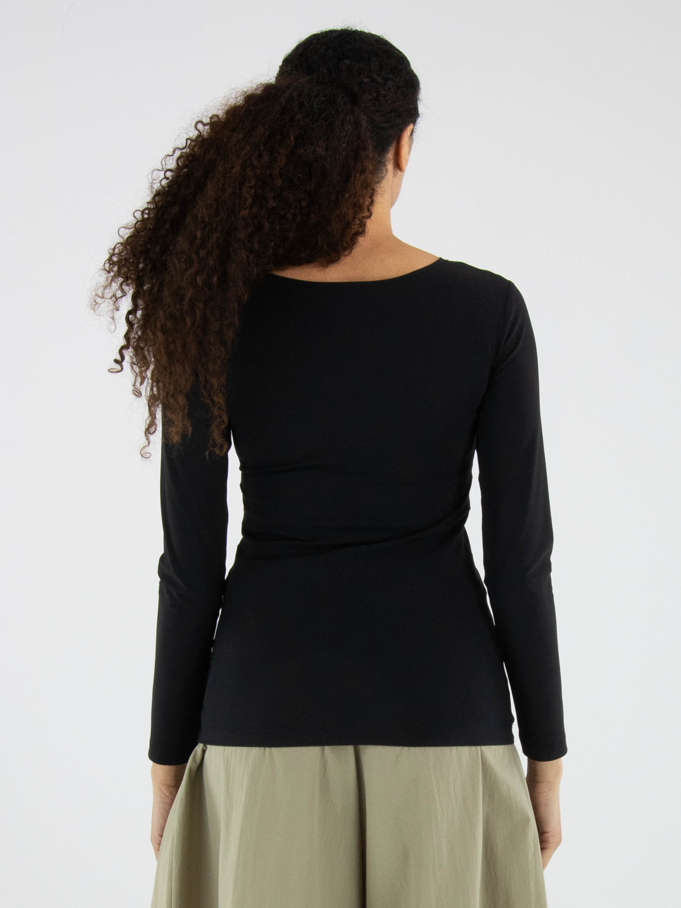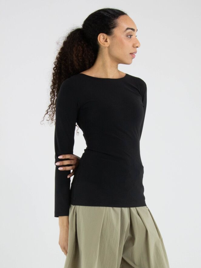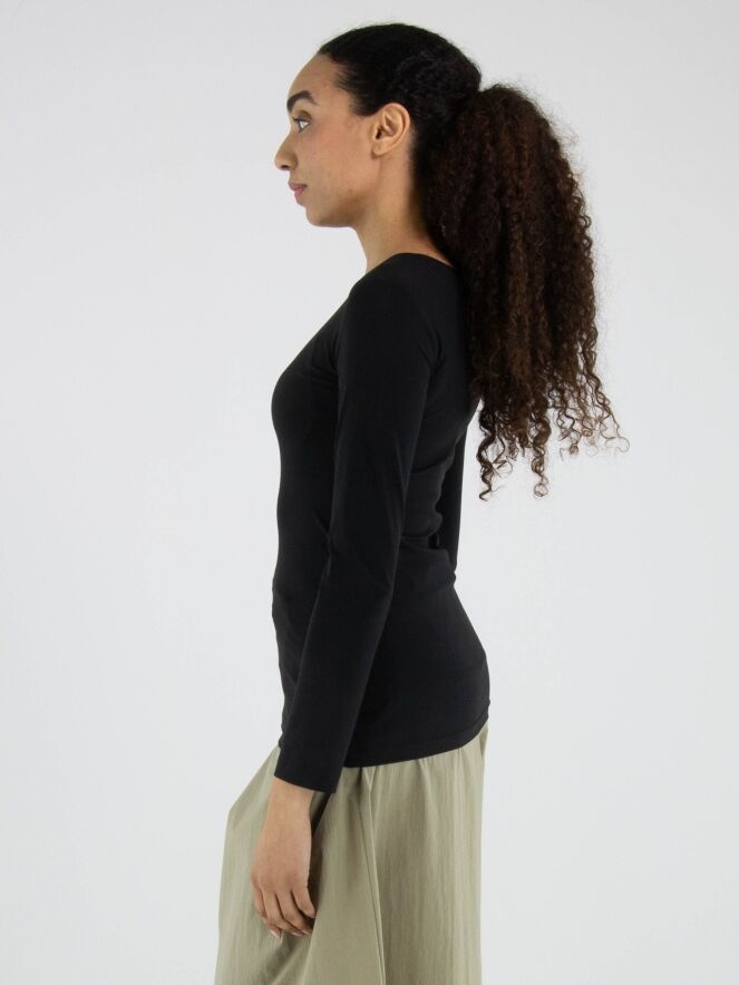 Shirt von Moq in Schwarz. Mit Rundhalsausschnitt und langen Ärmeln gearbeitet, ist es leicht tailliert geschnitten und sorgt so für eine dezent feminine Passform. Dieses vielseitige Shirt kann bei 40 Grad gewaschen werden.