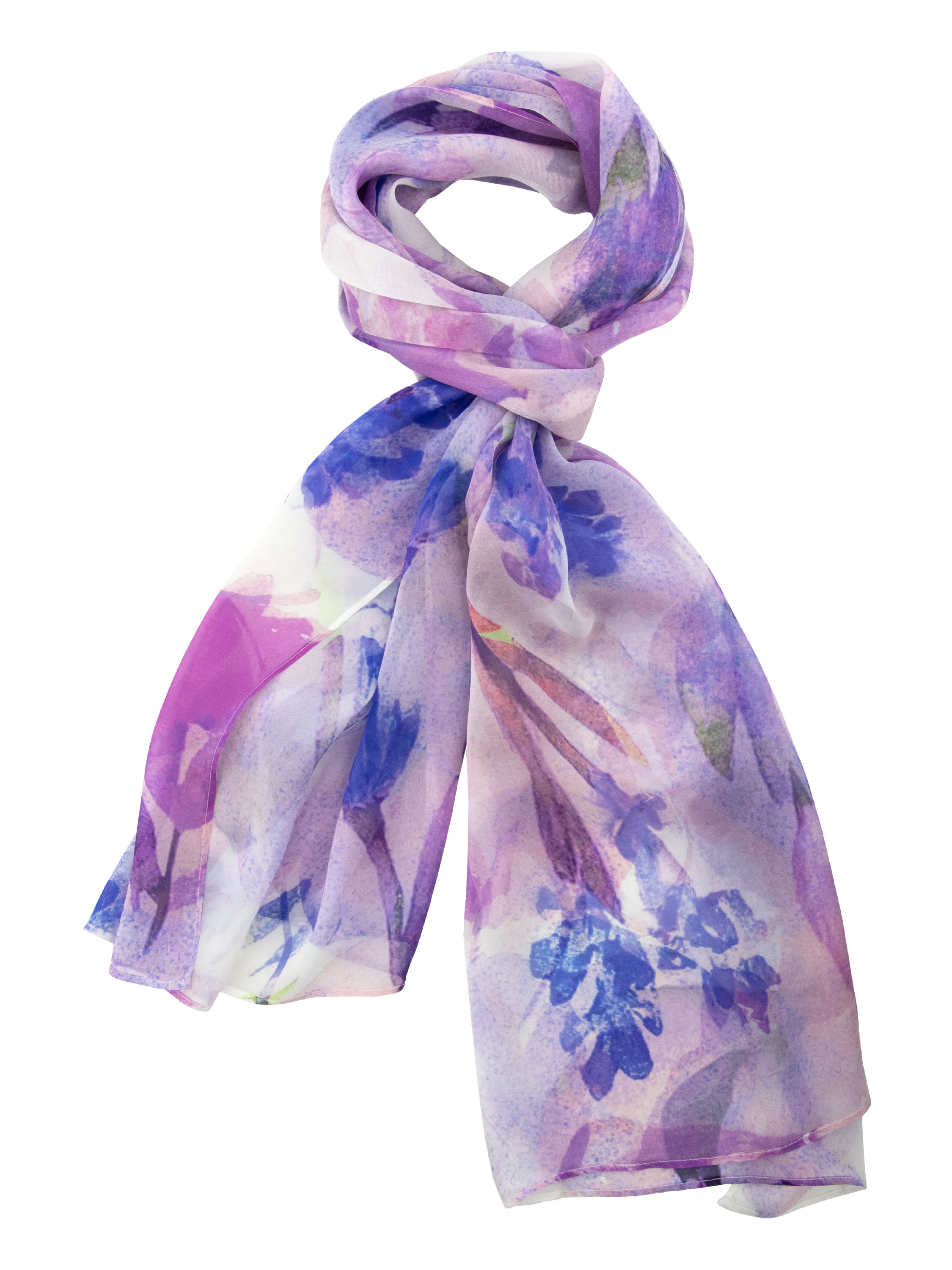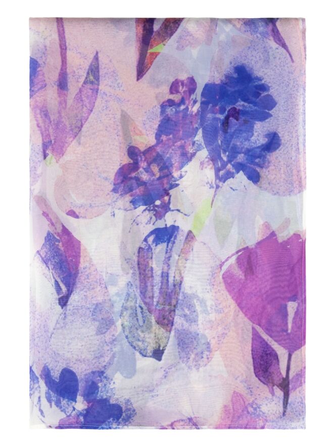 Leicht transparente Schal von Moq mit grafischem Blumenprint in mehreren Lila-, Rosa-, Blau- und Weißtönen. Die luftige Qualität verleiht dem Schal eine elegante und raffinierte Ausstrahlung. Dieser Schal sollte per Hand gewaschen werden.