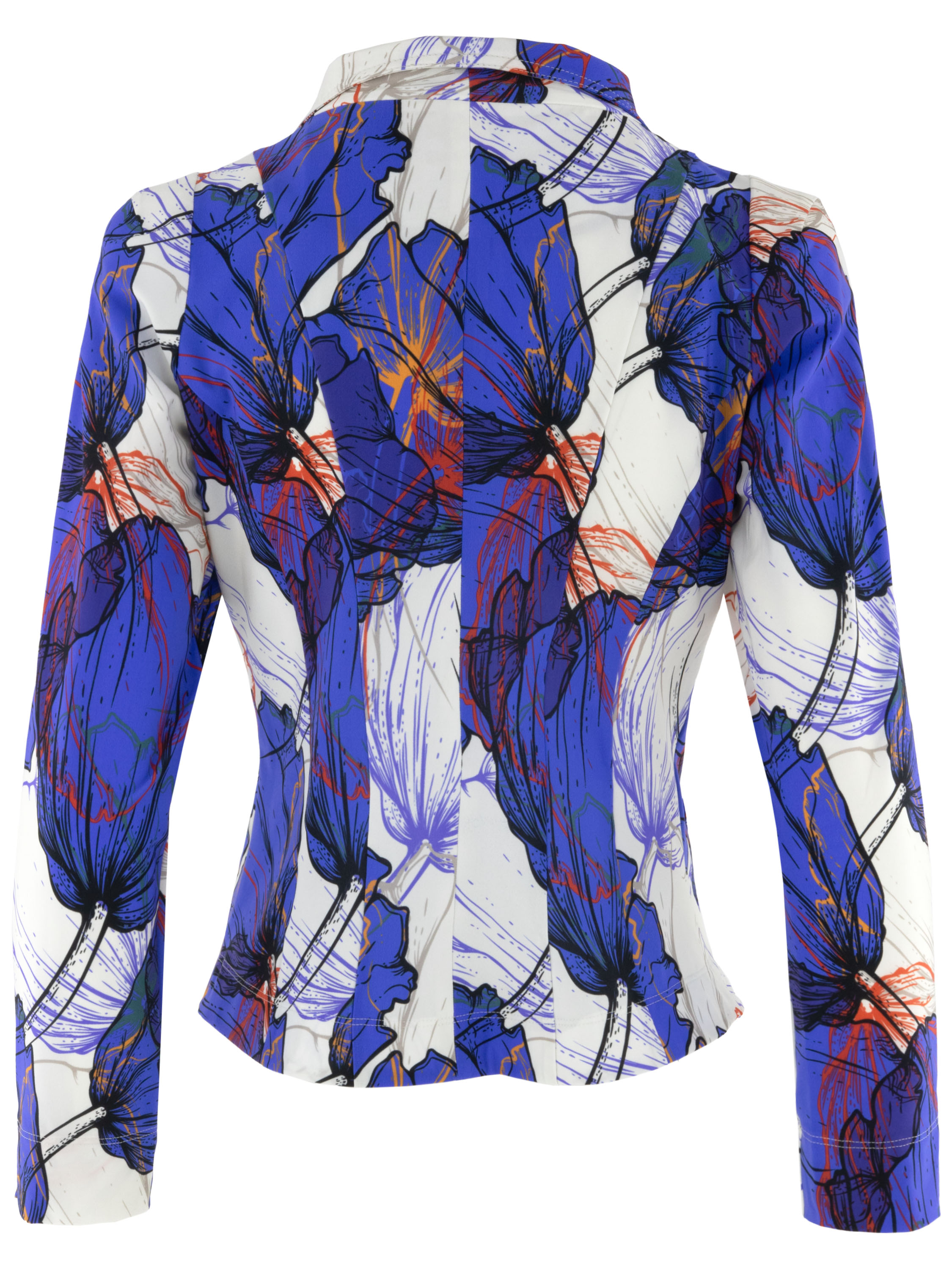 Blazer von Moq mit grafischem Blumenprint in Rot, Orange und Schwarz auf blau-weißem Grund. Mit fünf Knöpfen zu schließen und ungefüttert gearbeitet, überzeugt er durch eine leichte, moderne Ausstrahlung. Dieser Blazer kann bei 40 Grad gewaschen werden.