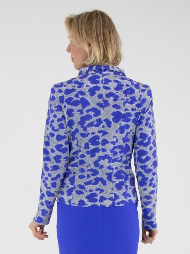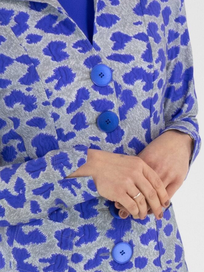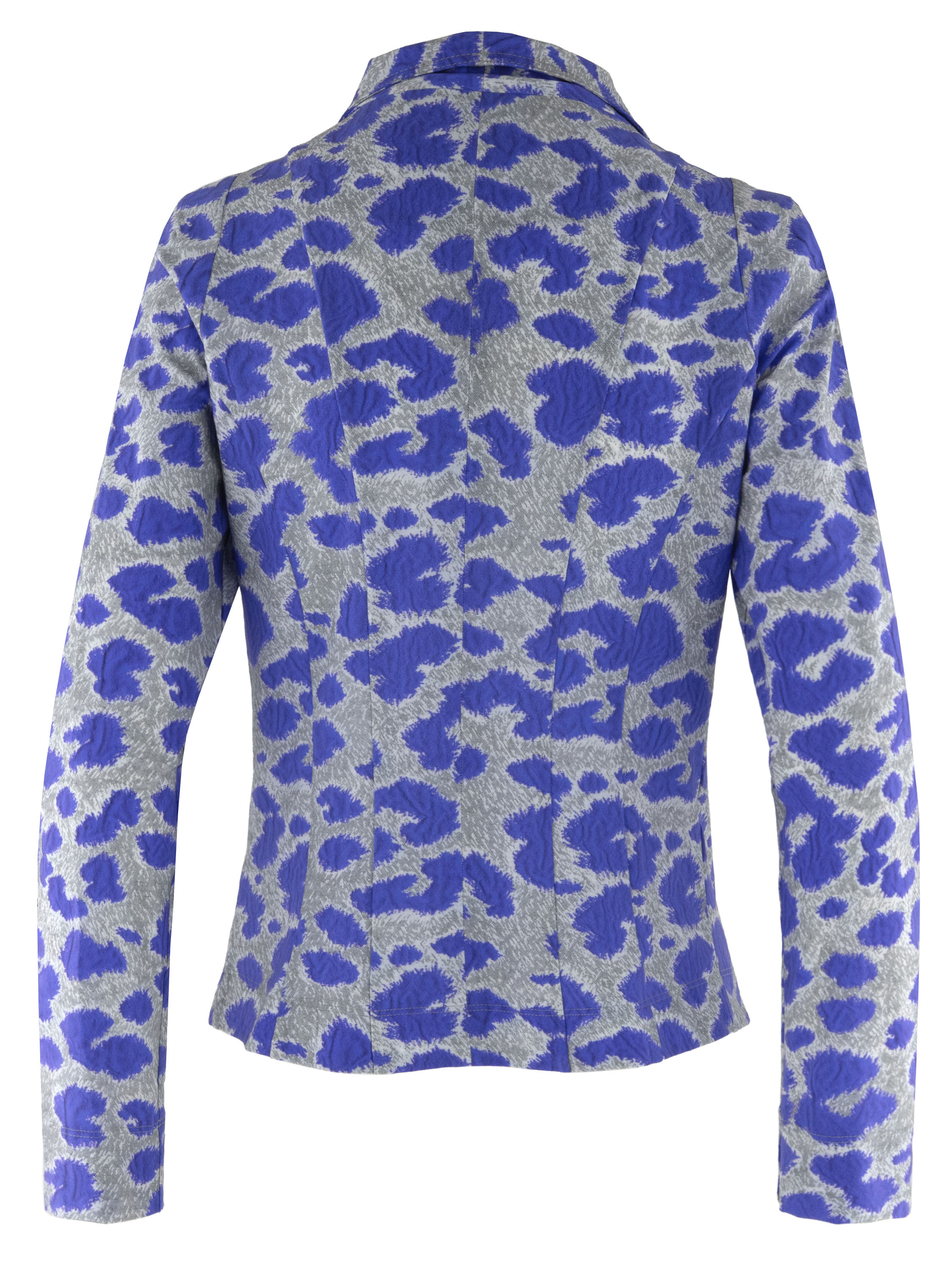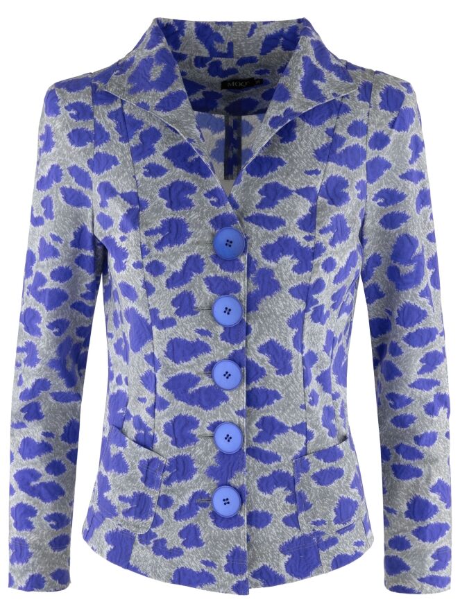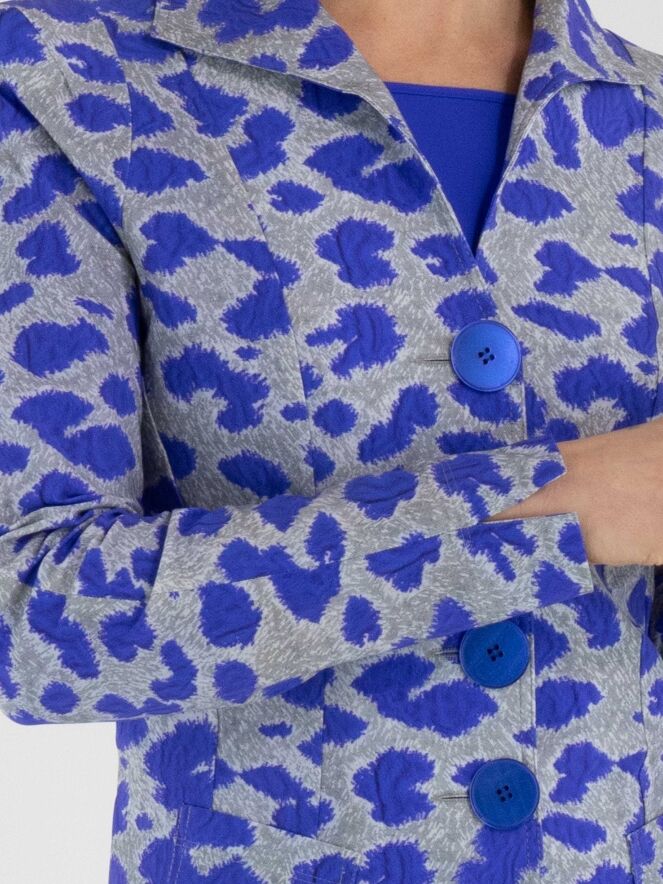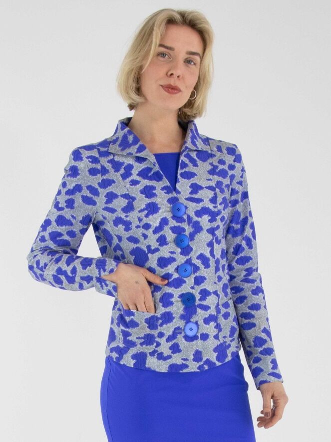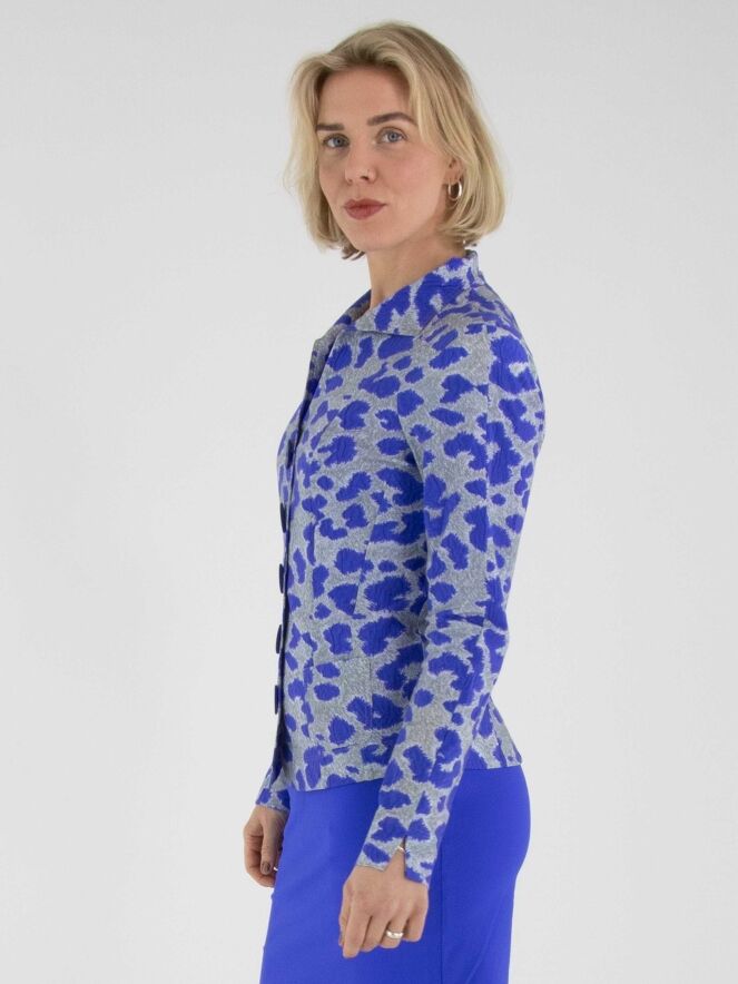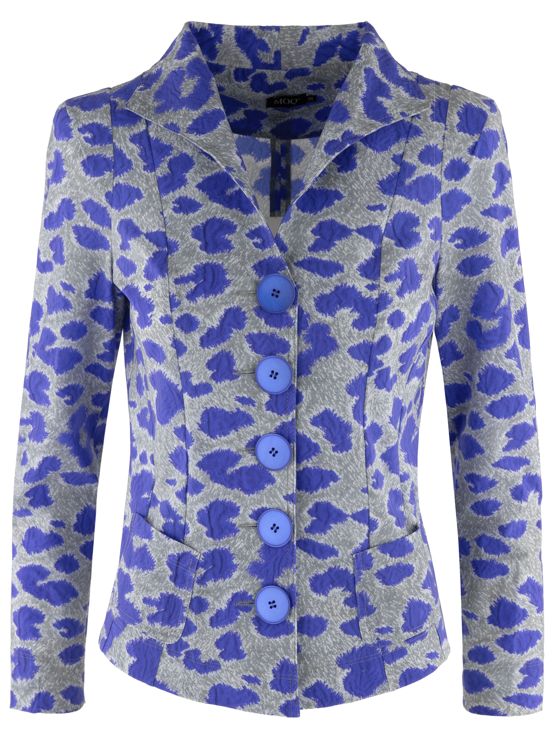 Ein Blazer von Mog mit einem grafischen Print in Kobaltblau und Grau. Der Blazer hat einen Verschluss mit fünf kobaltblauen Knöpfen und ist ungefüttert. Dieser Blazer kann bei 40 Grad gewaschen werden.