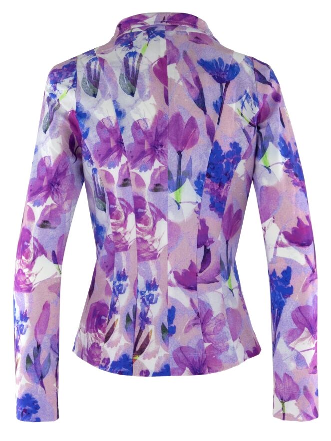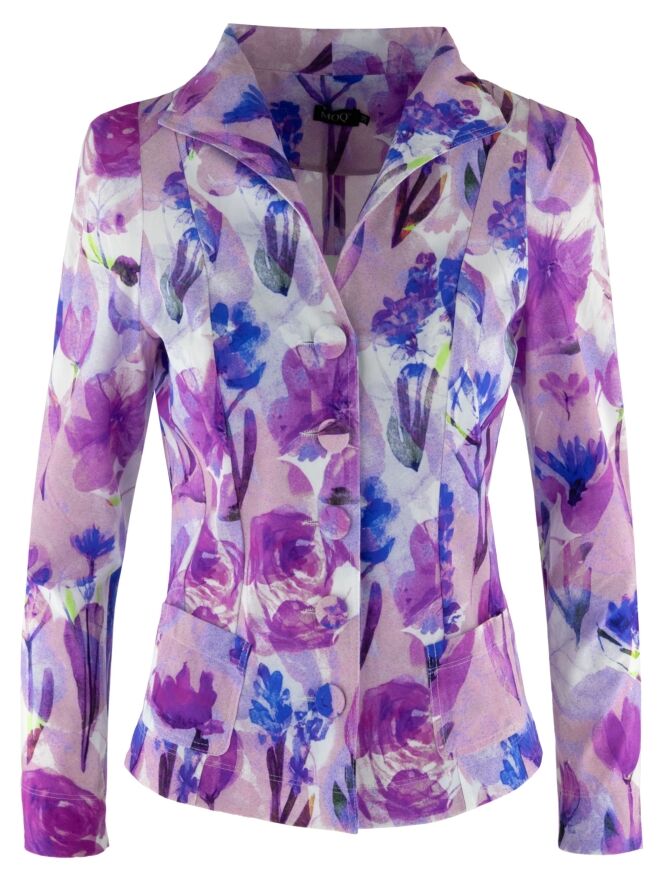Ein Blazer von Moq mit einem grafischen Blumenprint in mehreren Lila-, Rosa-, Blau- und Weißtönen. Der Blazer hat einen Verschluss mit fünf Knöpfen, die mit dem gleichen Stoff wie der Blazer bezogen sind. Er ist ungefüttert und kann bei 40 Grad gewaschen werden.