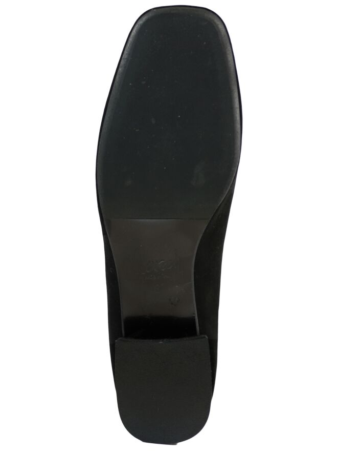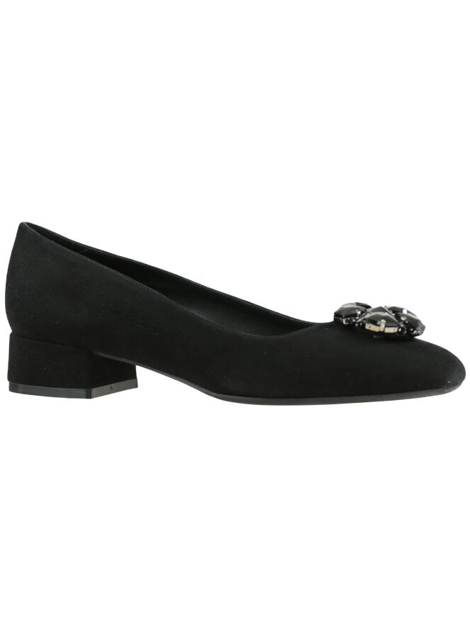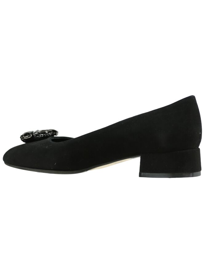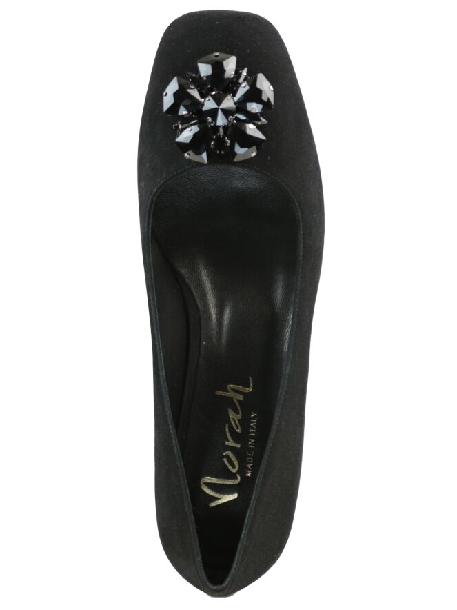 Niedriger, schwarzer Pumps der Damenschuhmarke Norah. Der Pumps hat eine abgerundete, quadratische Schuhspitze. Den Vorderfuß verziert eine blumenförmige Schnalle mit schwarzen Straßsteinchen. Der Pumps hat einen eleganten Blockabsatz und ein Innenfutter aus Leder.