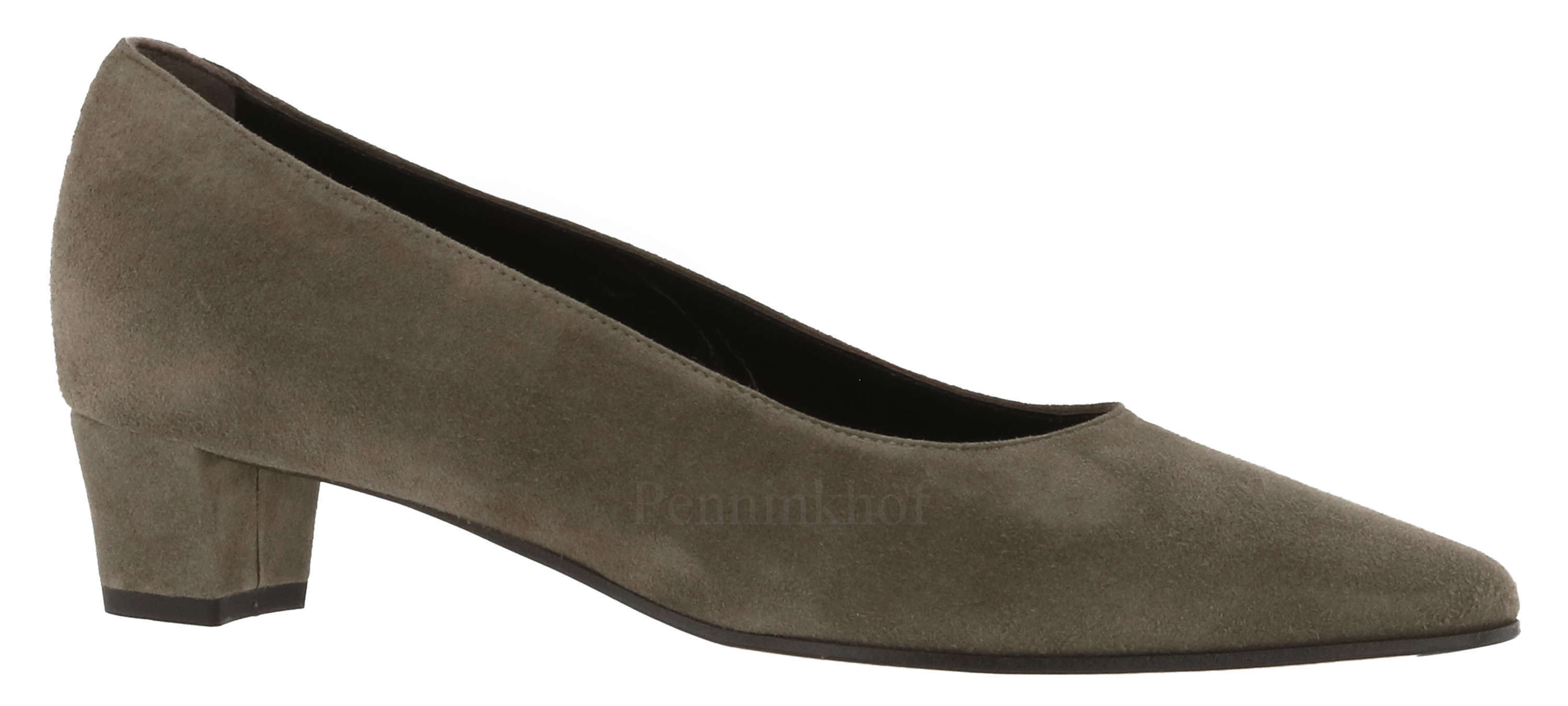 Ein Pumps der Schuhmarke Panara in Taupe. Die Schuhspitze dieses Wildlederpumps ist schmal. Der elegante Absatz ist mit dem gleichen Wildleder bezogen. Die Innenseite des Pumps ist mit Leder ausgekleidet.