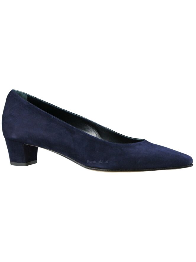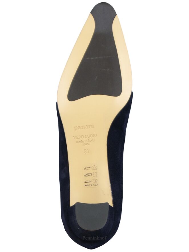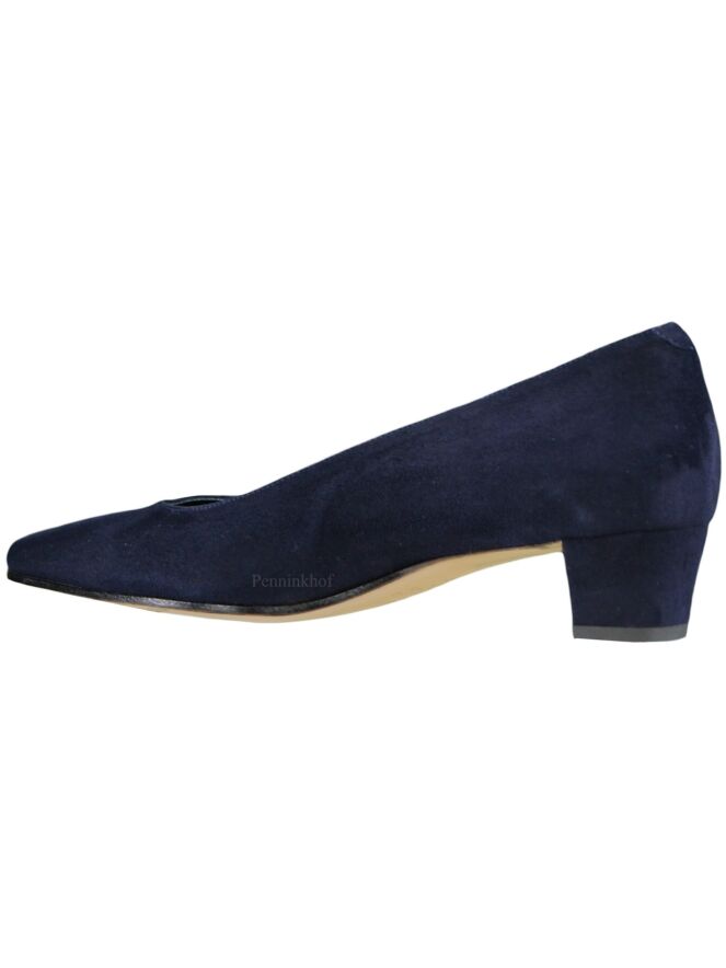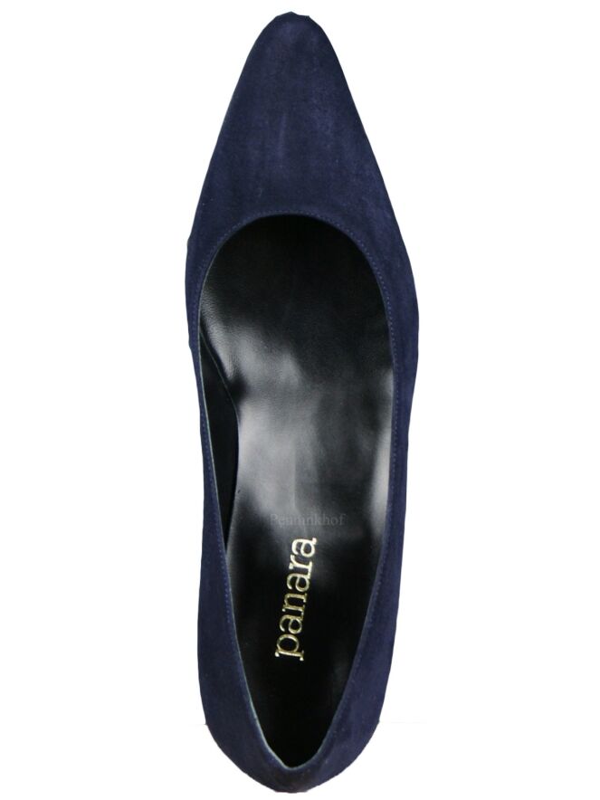 Ein Pumps der Schuhmarke Panara in Marineblau. Die Schuhspitze dieses Wildlederpumps ist schmal. Der elegante Absatz ist mit dem gleichen Wildleder bezogen. Die Innenseite des Pumps ist mit Leder ausgekleidet.