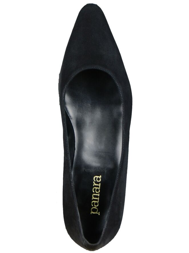 Ein Pumps der Schuhmarke Panara in Schwarz. Die Schuhspitze dieses Wildlederpumps ist schmal. Der elegante Absatz ist mit dem gleichen Wildleder bezogen. Die Innenseite des Pumps ist mit Leder ausgekleidet.