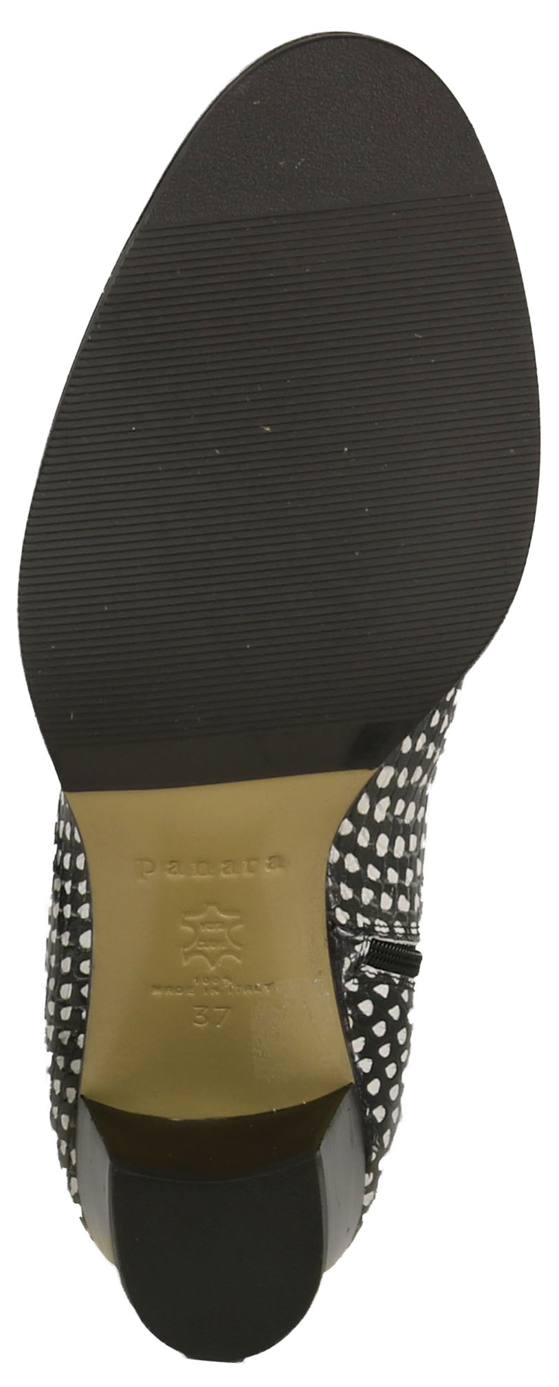 Gemusterte Stiefelette der Designerschuhmarke Panara in Schwarz-weiß. Die vorn abgerundete Stiefelette hat einen Absatz in einer neutralen, schwarzen Farbe. Die Schafthöhe beträgt ab der Ferse 13 cm, der Umfang misst 25 cm. Das Innenfutter ist aus Leder.